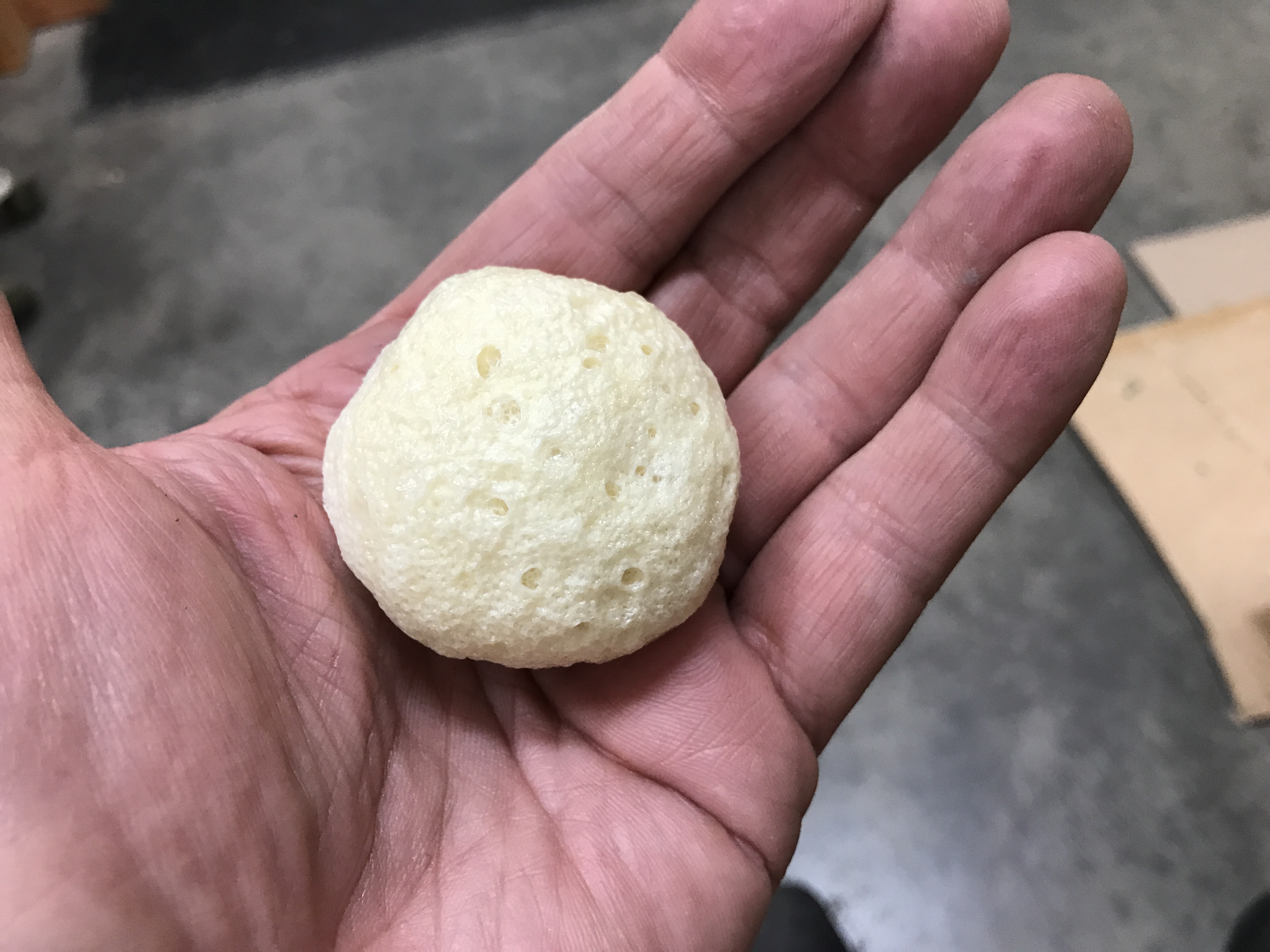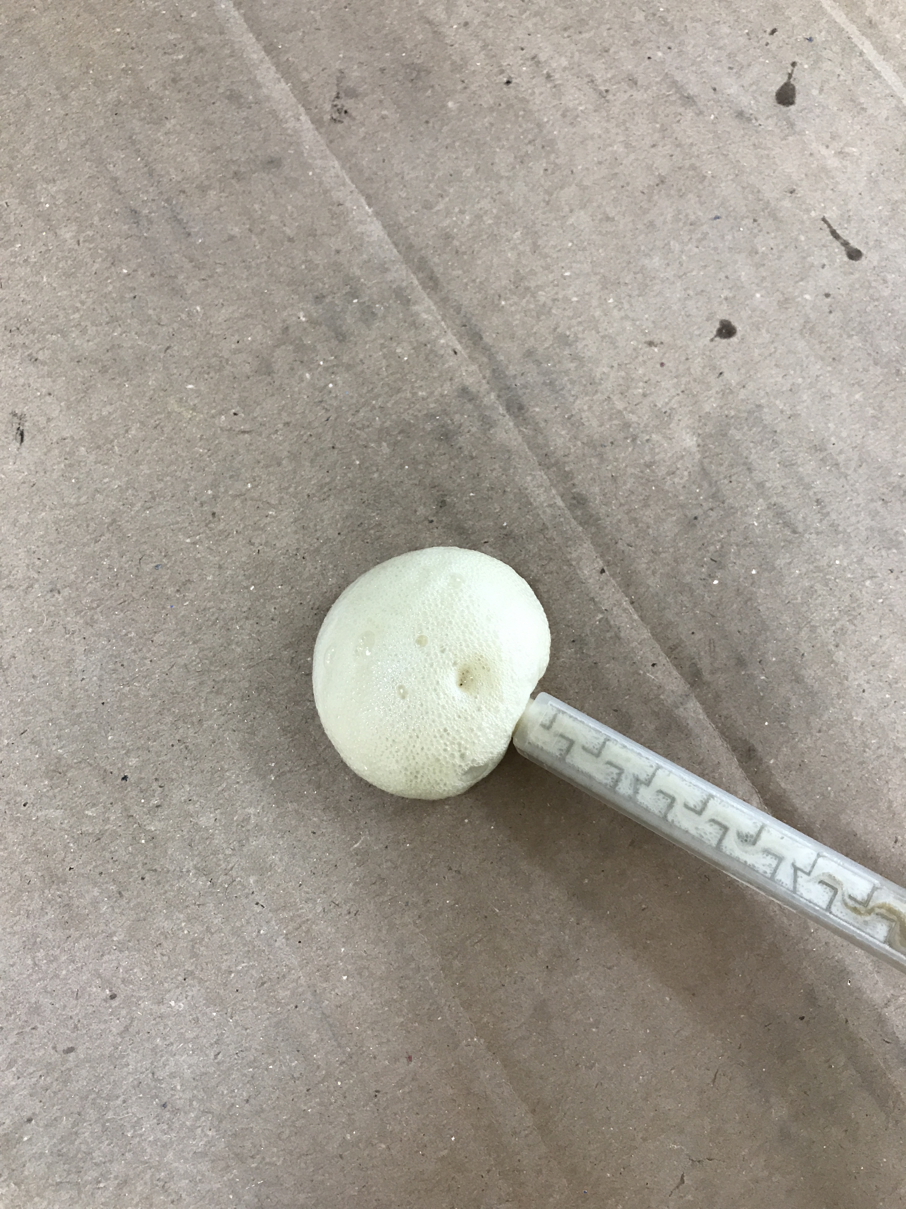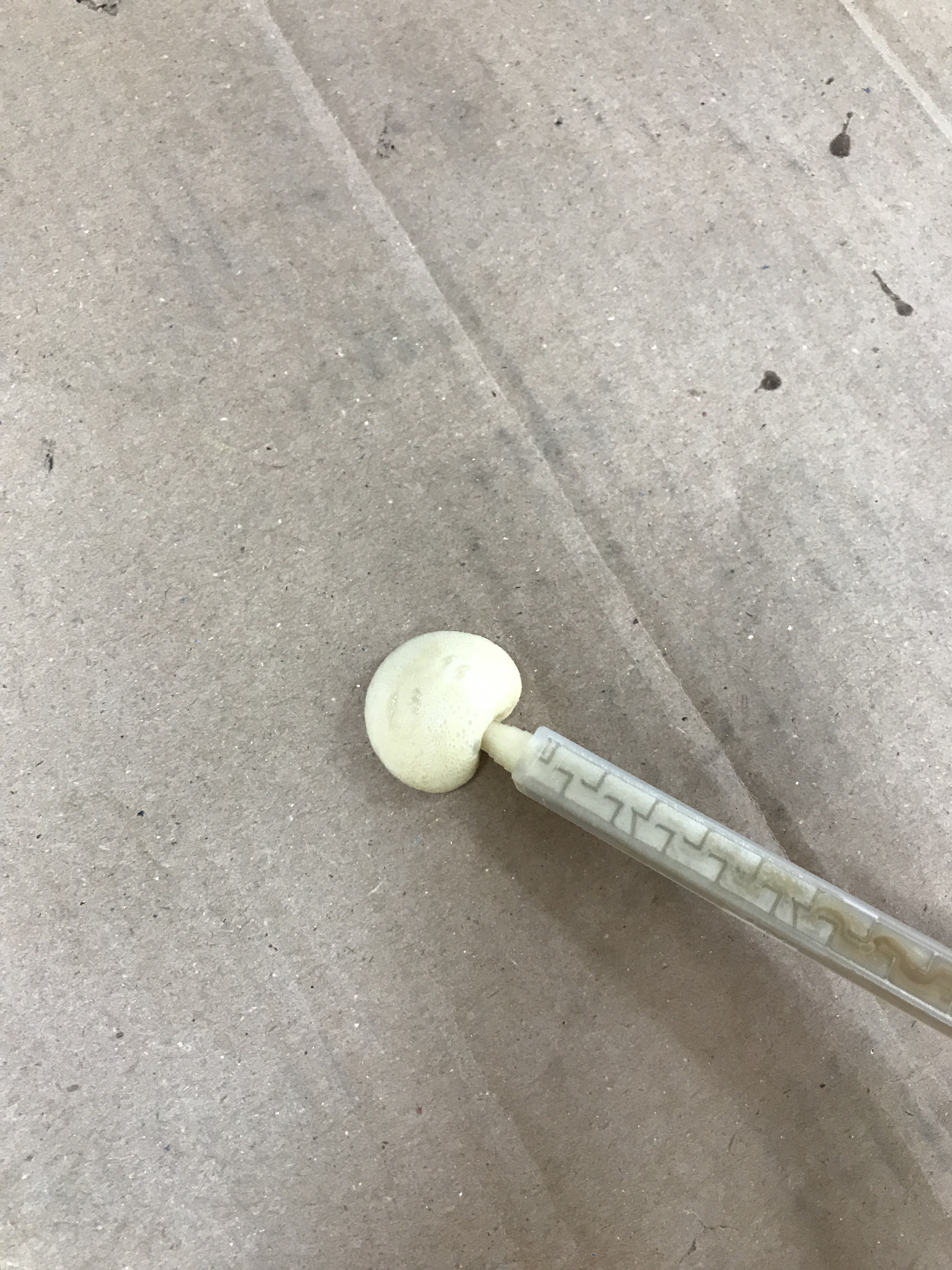 Here's an initial squirt of foam juice. It comes out of the mixing nozzle very liquid with just a few bubbles. This dot is about the size of a quarter.