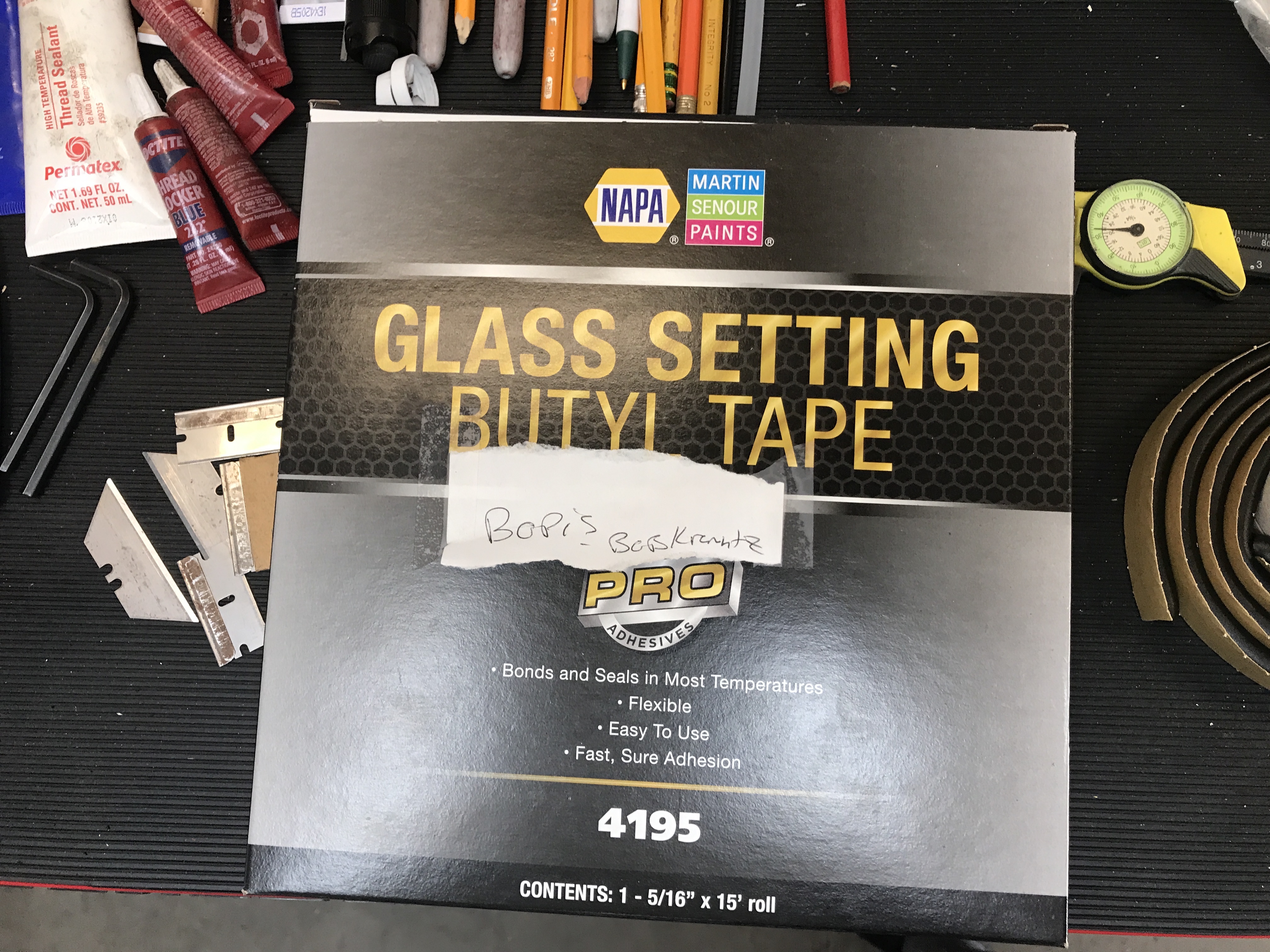 I used 5/16" butyl tape I ordered through NAPA, which came in a store brand box.