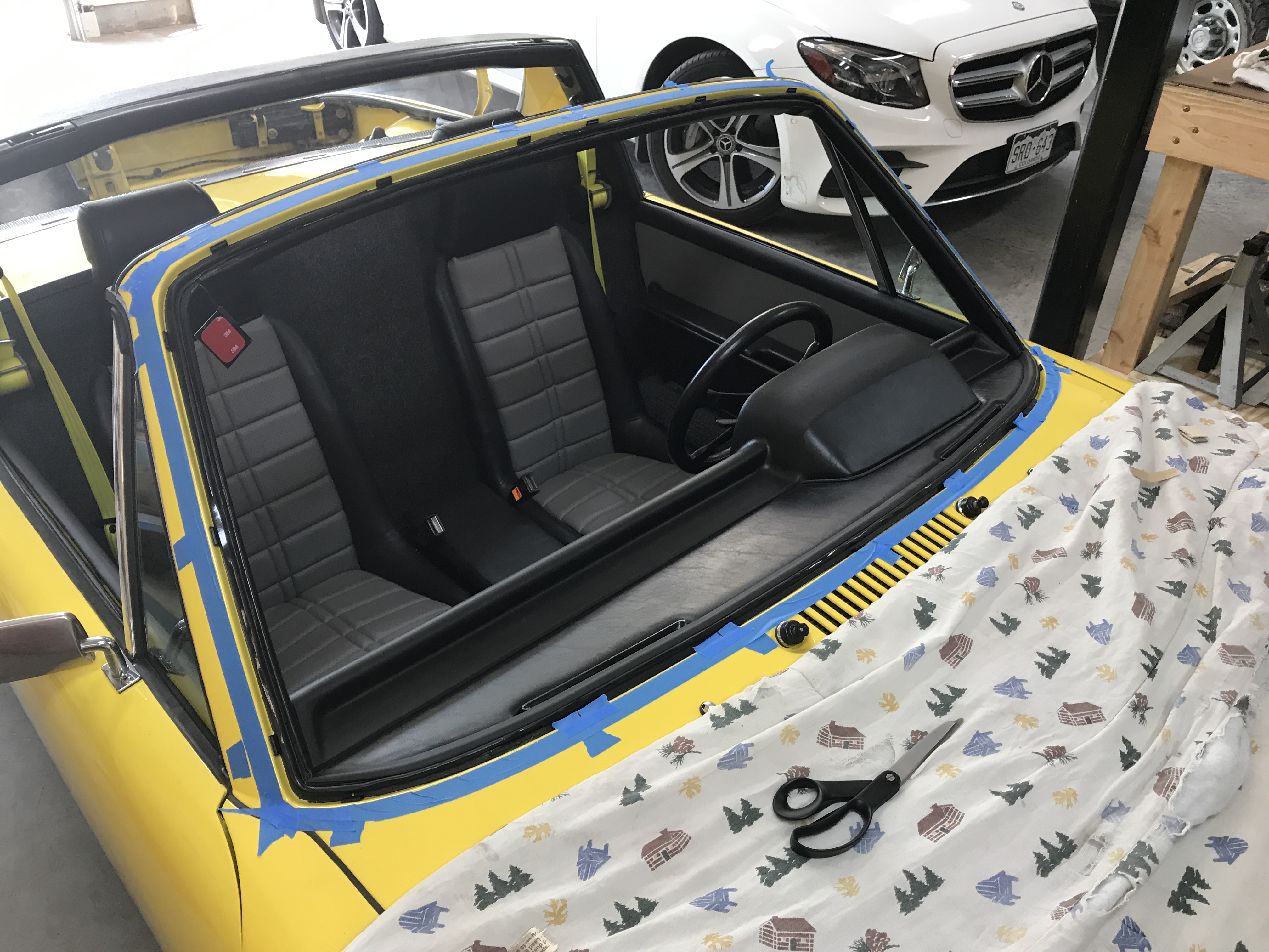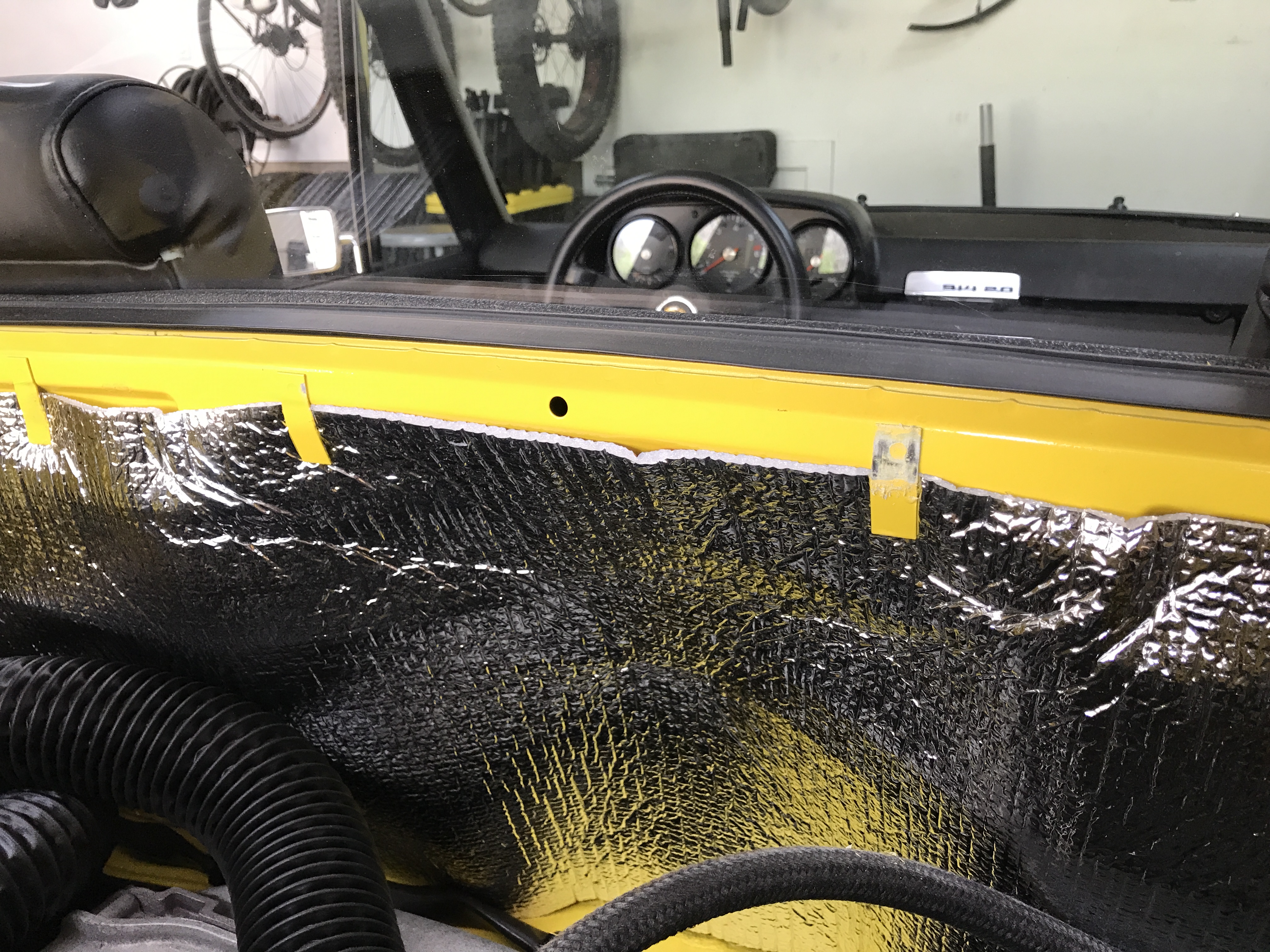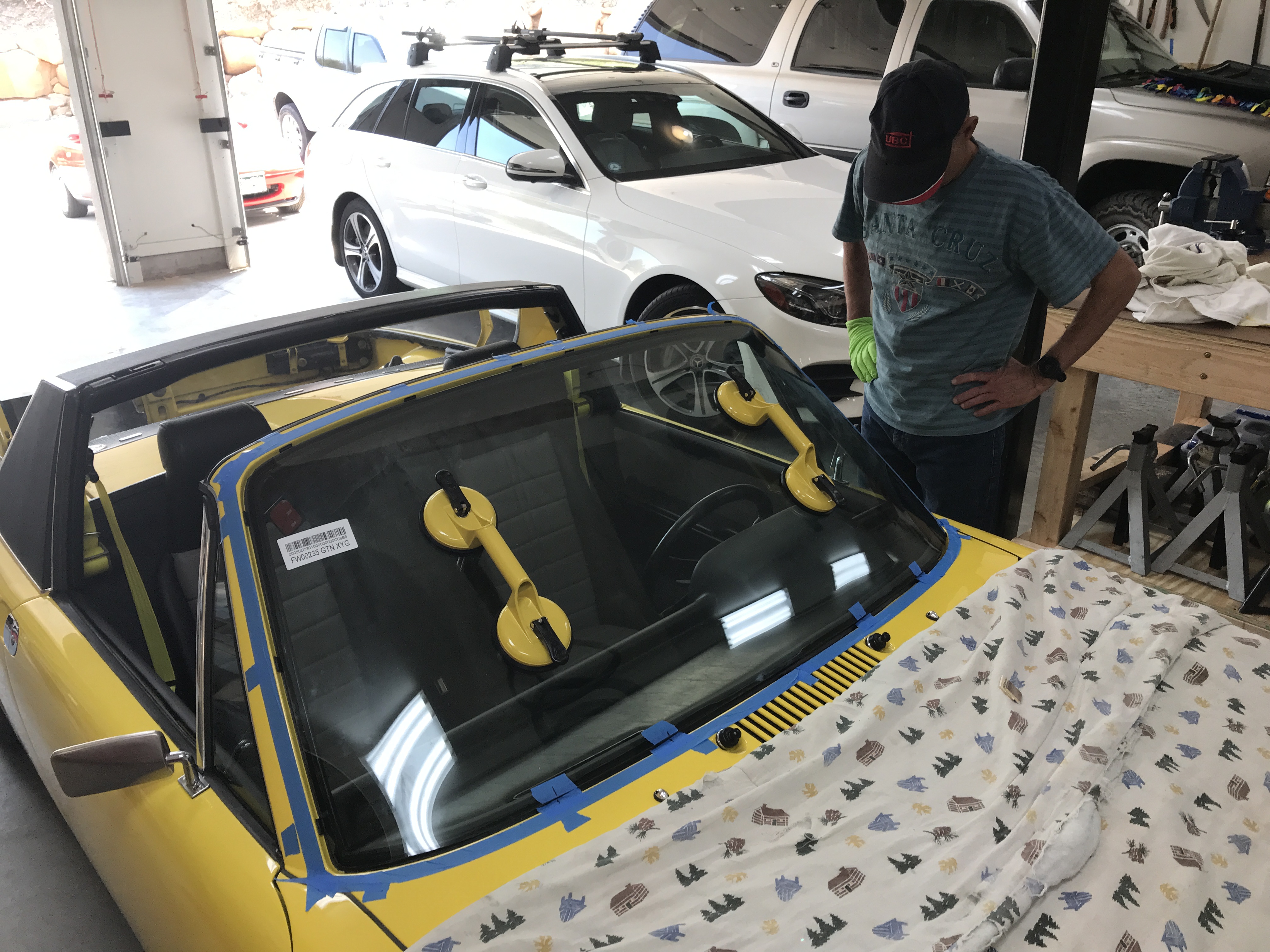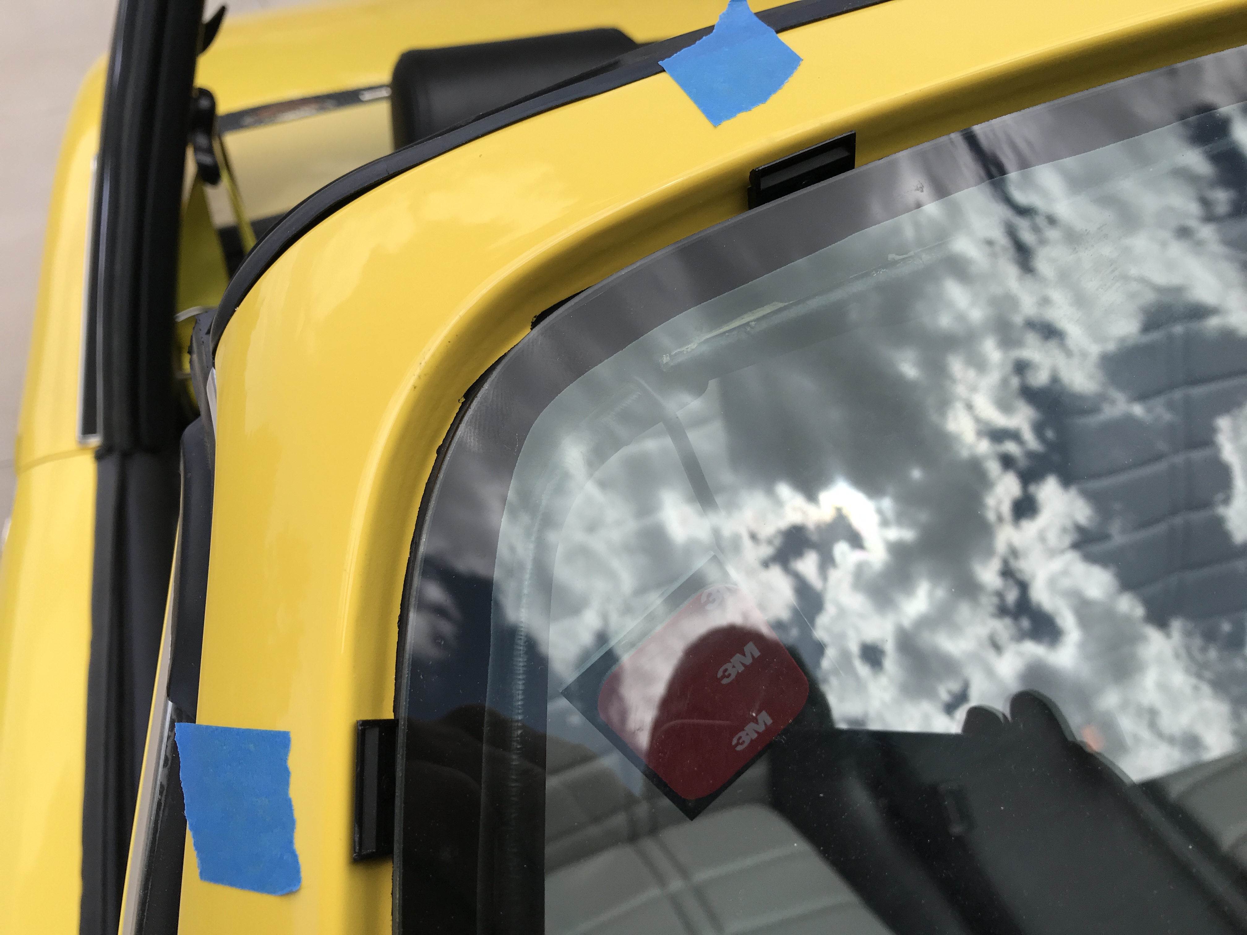 Big day today! Car friends Chuck and Mike (Kansas 914) came over to help with some jobs that need extra hands (thanks, guys!). First up, the windshield. Here we are checking the fit and adjusting spacers. Note that I tried to find Speed Yellow suction cups, but had to settle for Sunflower. Gee Bob, Guess now you have to re-paint the car Sunflower so it matches the suction cup handles.... (IMG:style_emoticons/default/lol-2.gif) |