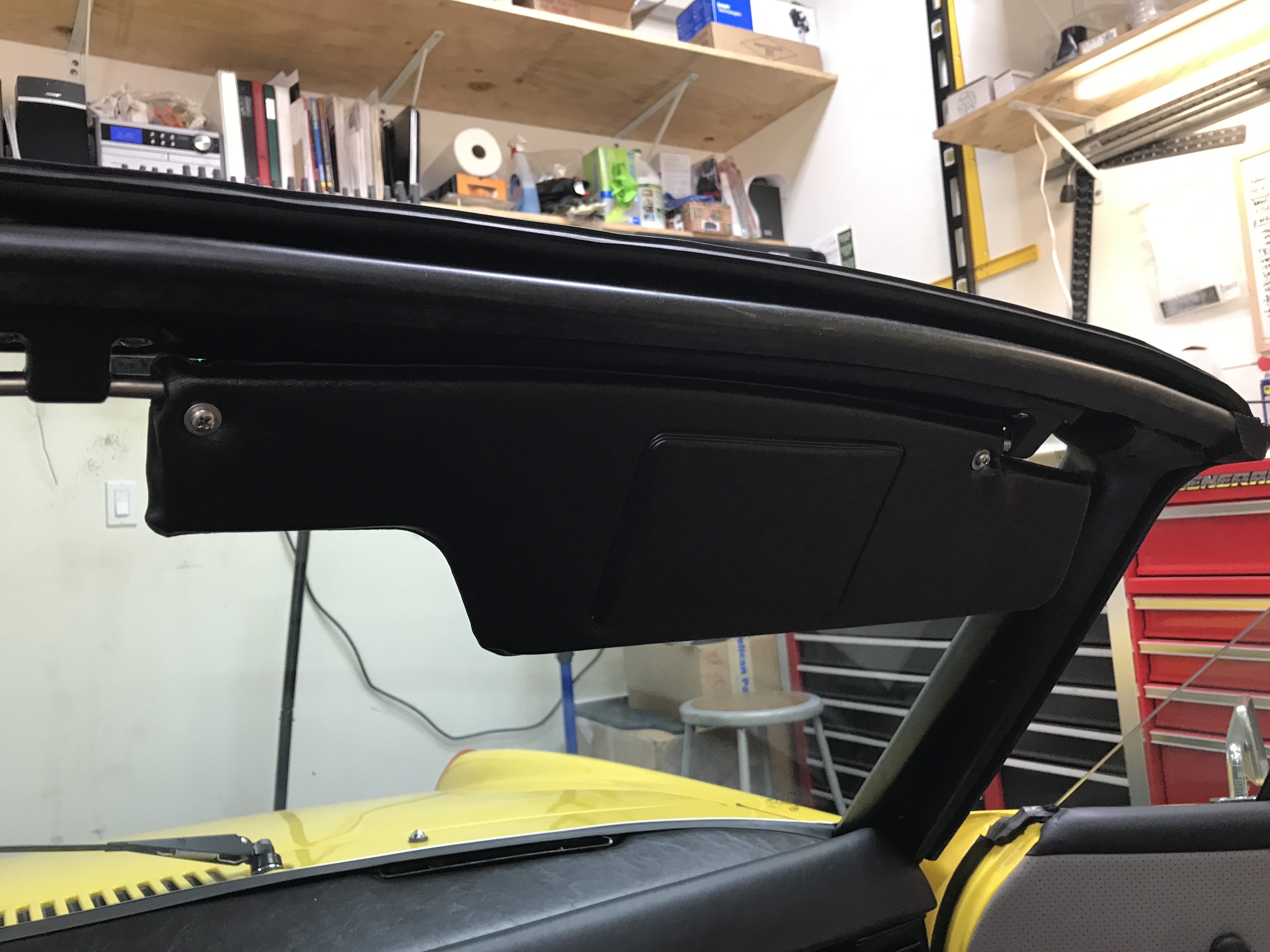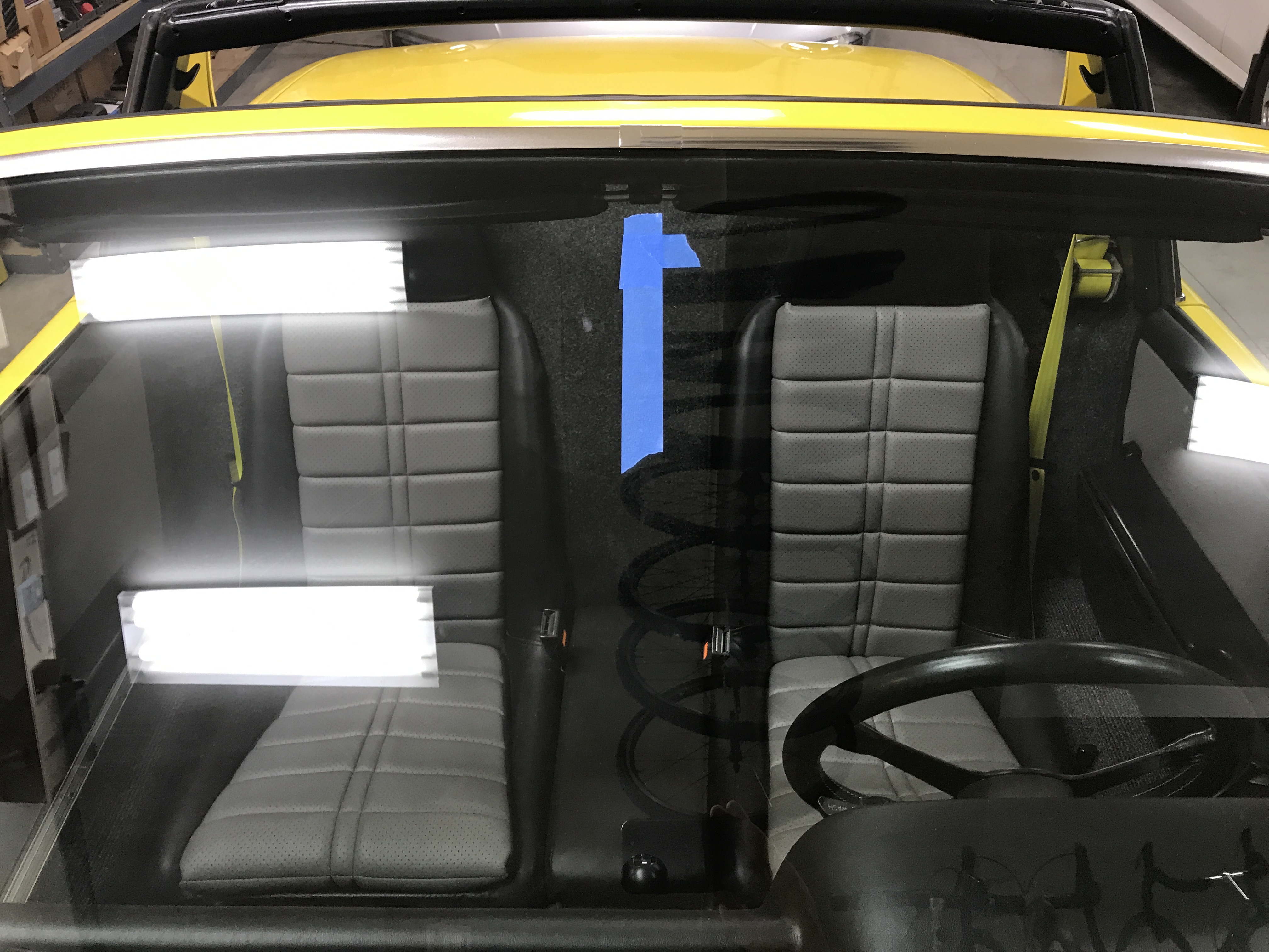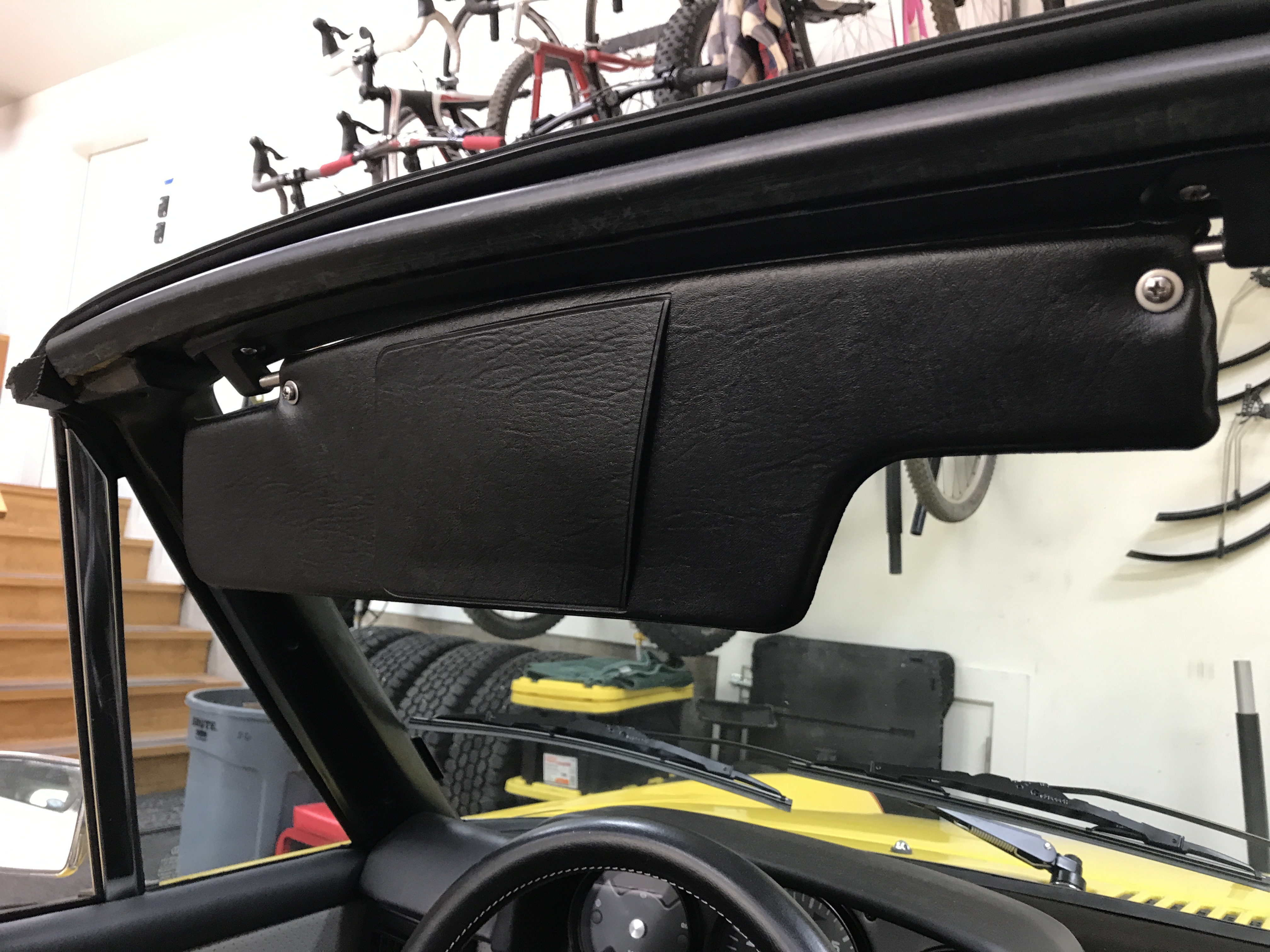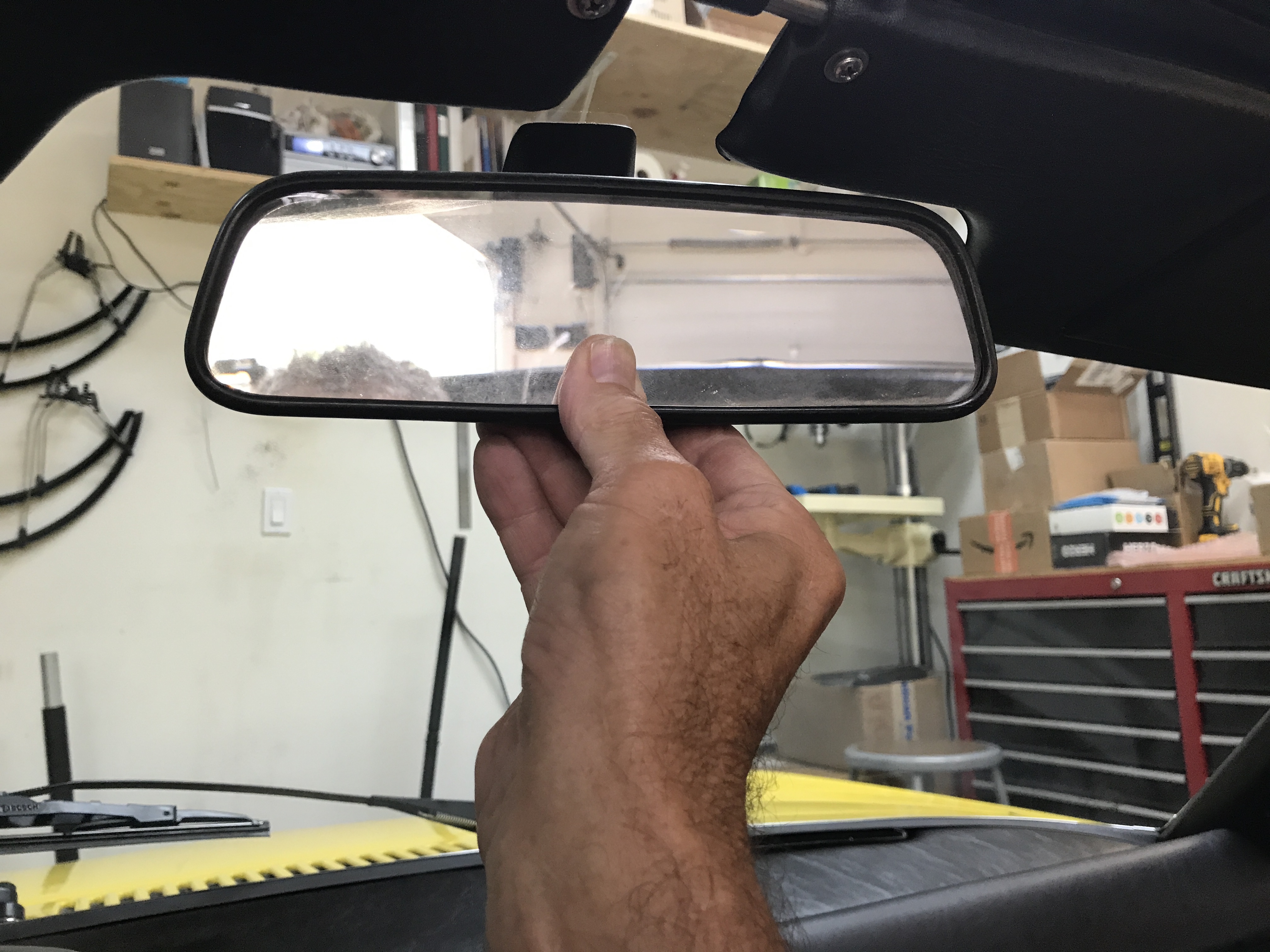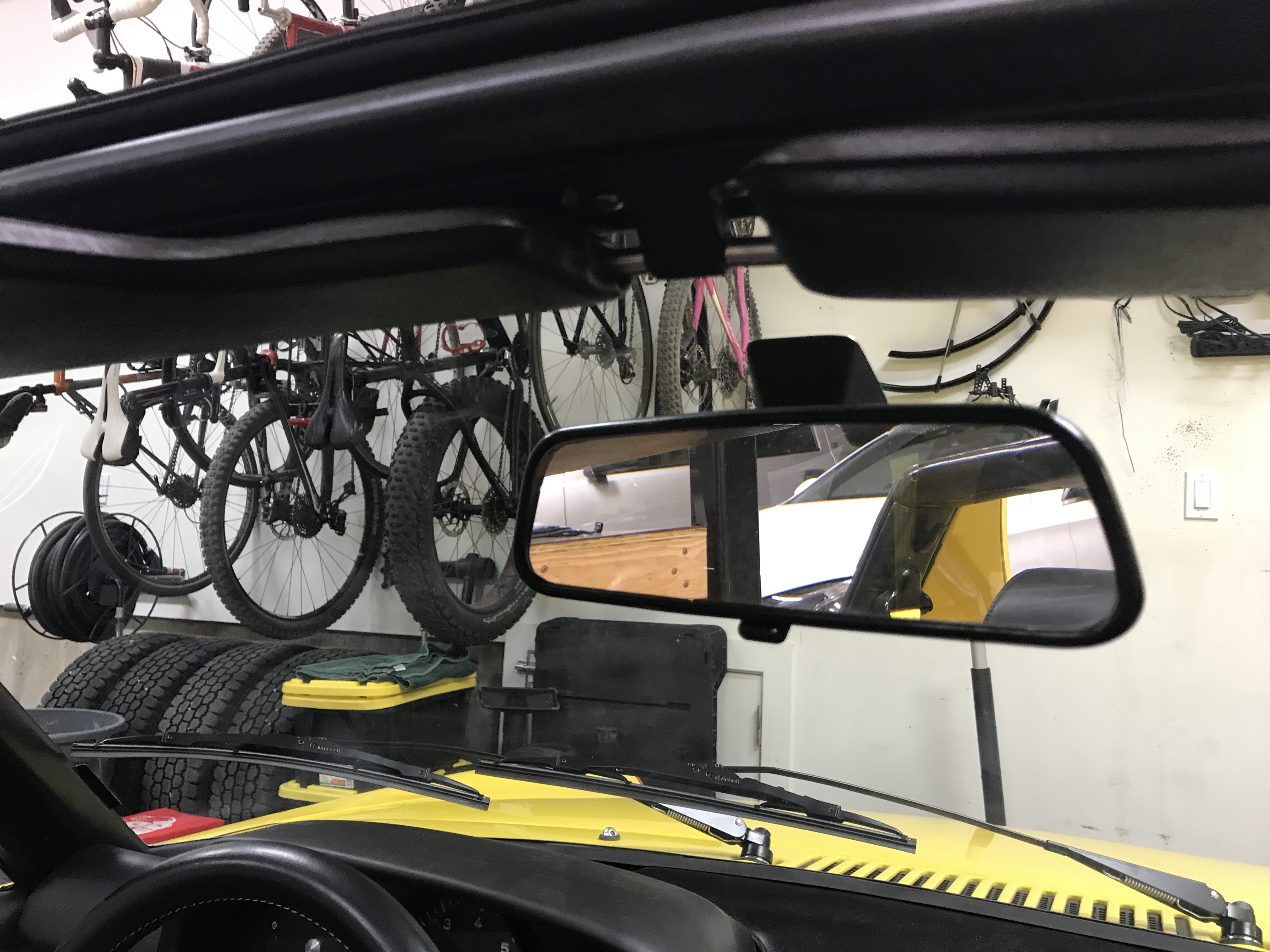 Then start checking mirror position. I am a bit concerned because the stock mirror arm does not adjust for height. As a tall guy, I want the mirror above my sightline out the windshield. But I know it must be low enough to see out the back window, below the targa bar, and low enough to clear the visors.