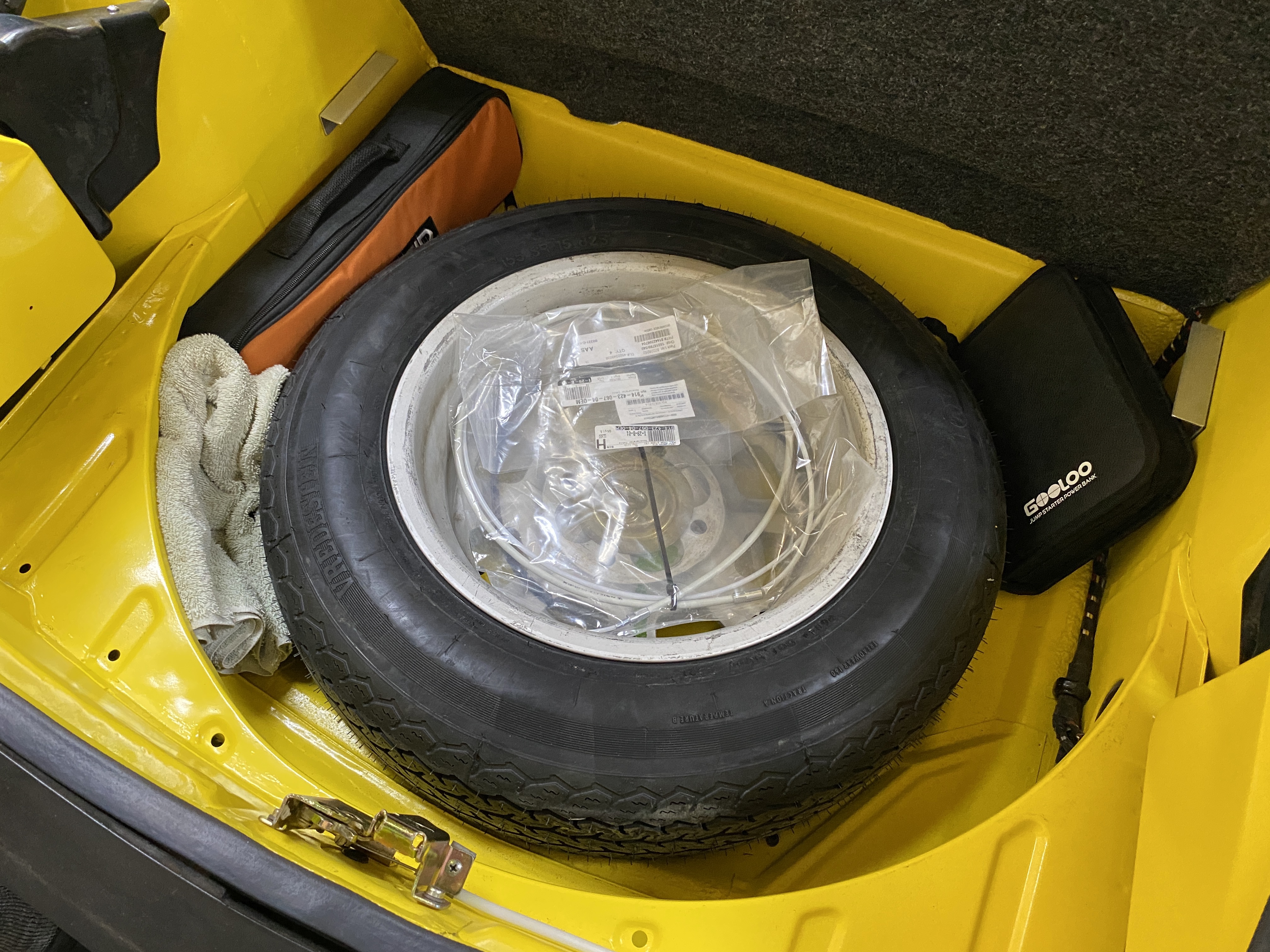 Good spot for the tool bag on the right side of the spare tire. I also stocked the usual clutch and throttle cables, plus another small bag with electrical spares.