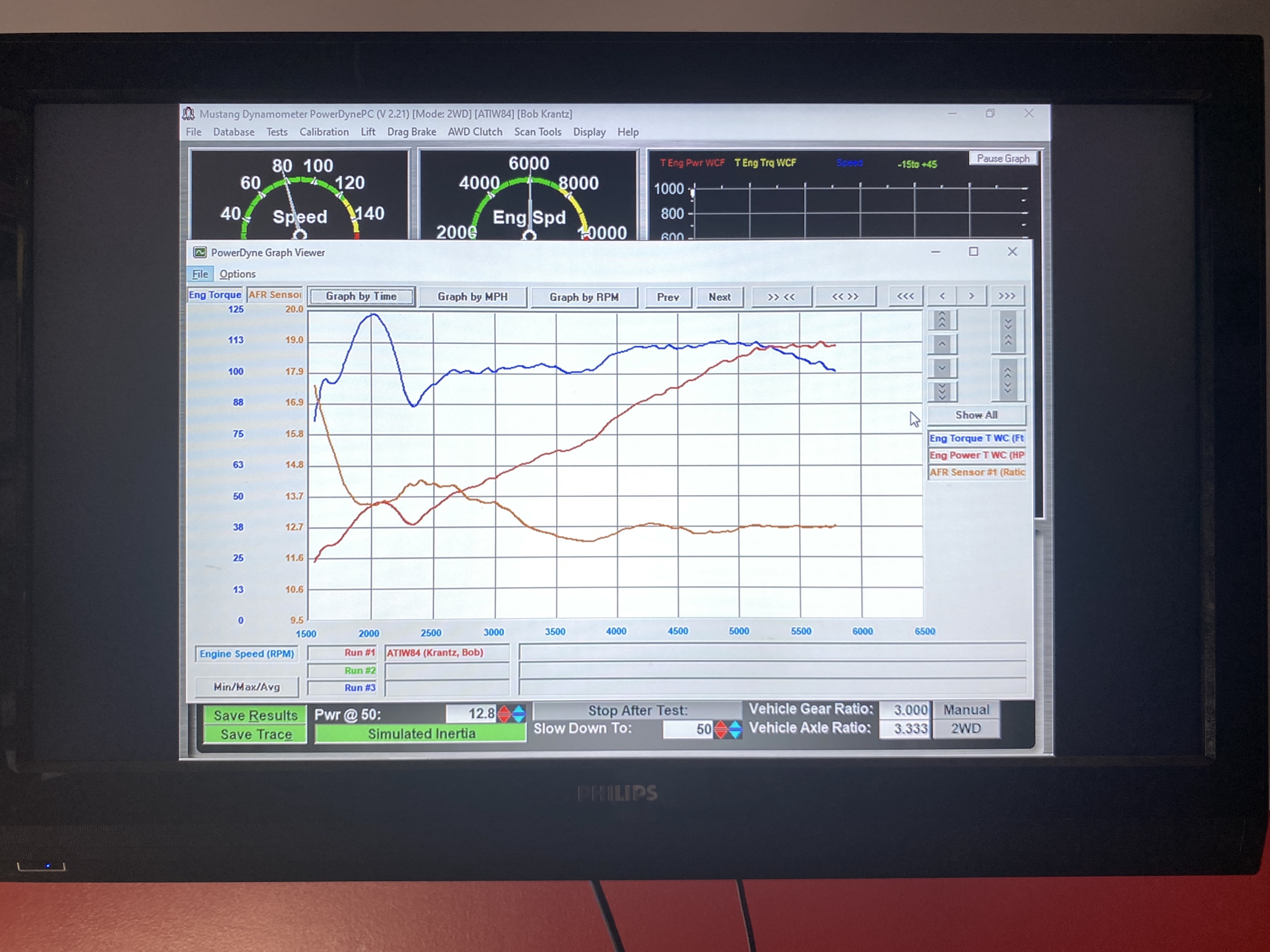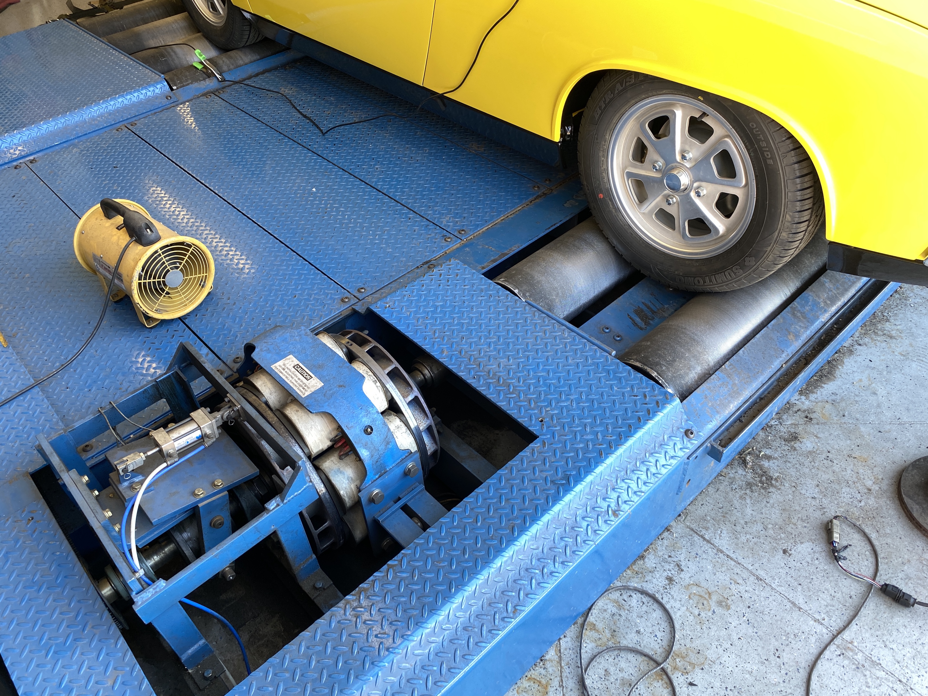 The initial checks went well, and the car started and ran (no surprise to me, but Mike said he is often skeptical of people who show up with cars that will not start). Then we had a problem with the throttle sensor (TPS) reading. At first we thought the sensor was bad, then the leads were reversed, and then a software problem. Finally we figured out that the bad reading "might" be due to cross-talk with the crank position sensor. We rewired that, and got a reasonable TPS reading. Mike then went through his complete tuning process, starting with the fuel table, then the spark (advance) table, and then tip-in enrichment and a few other drivability tweaks. I was not after "max" horsepower, and my goal with the engine mods (bump to 2056 cc, compression about 8.8:1, new EFI and ignition) was 120 hp. At the end of the day we saw consistent peak hp of 113 at the wheels (corrected for the altitude. Assuming a 10% loss through the transaxle, half-shafts, and hubs, that means 125 hp at the crank. Yay! Note that the curve data below 2500 is not "real", based on the settings for this pull. I did not have time to drive the car (I was late to help my uber-gardener wife pick up plants at two area nurseries, so that will have to wait until we get home. Attached thumbnail(s) |