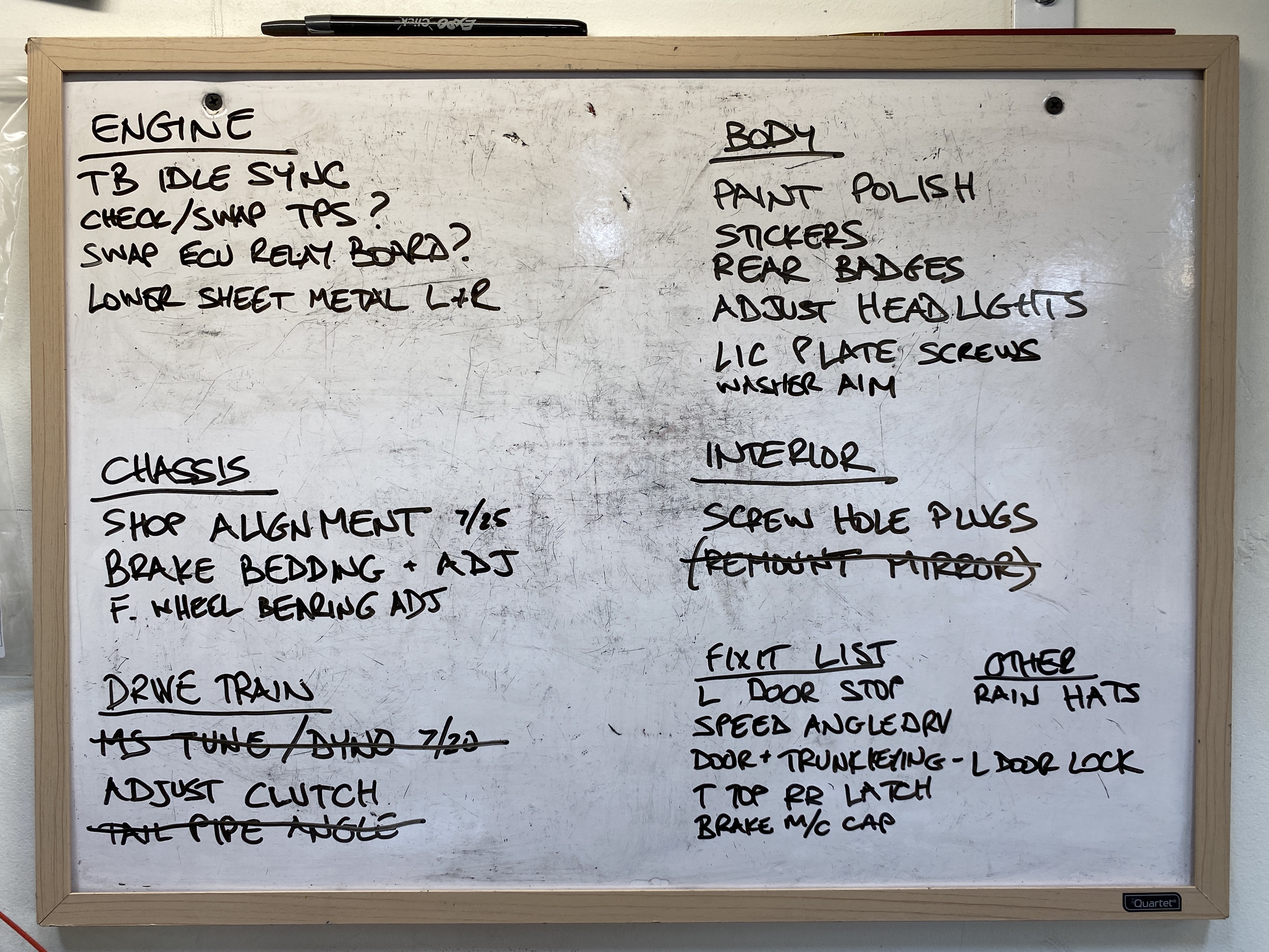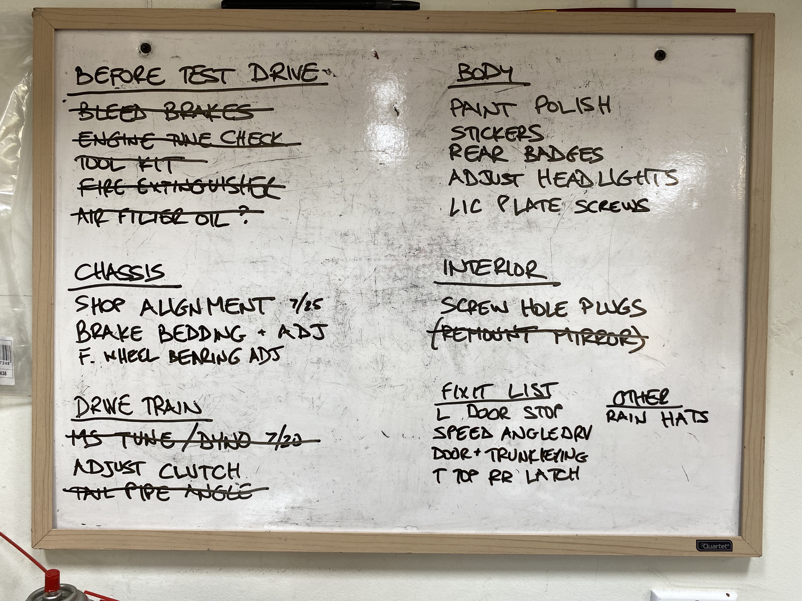 My updated lists. Next week I will get an alignment done, and then get the brakes bedded and adjusted.