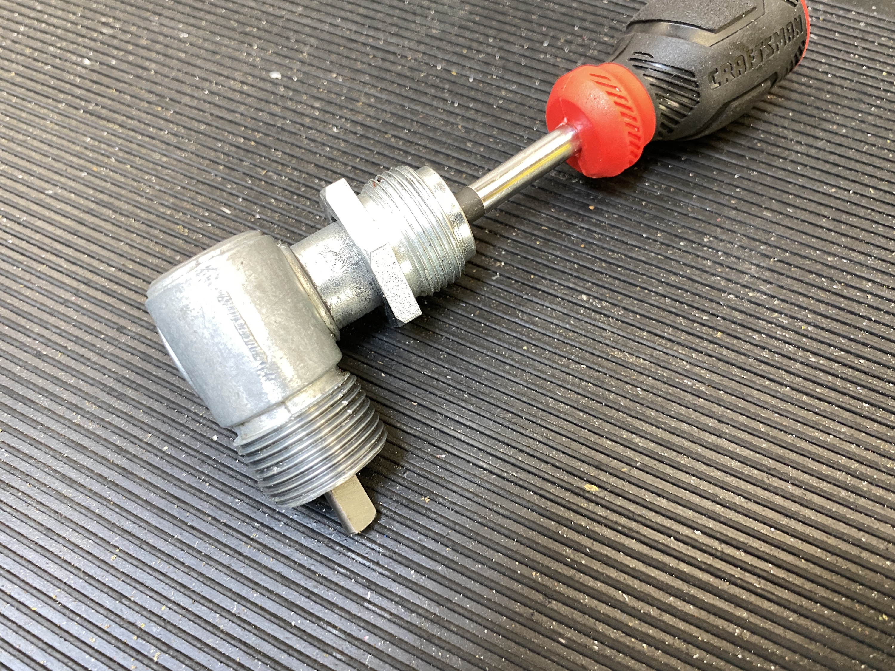 BTW, we found this under the transaxle during the dyno session. Looks like the speedo angle drive self-destructed, and left the cable hanging. That might explain why the speedometer did not work.