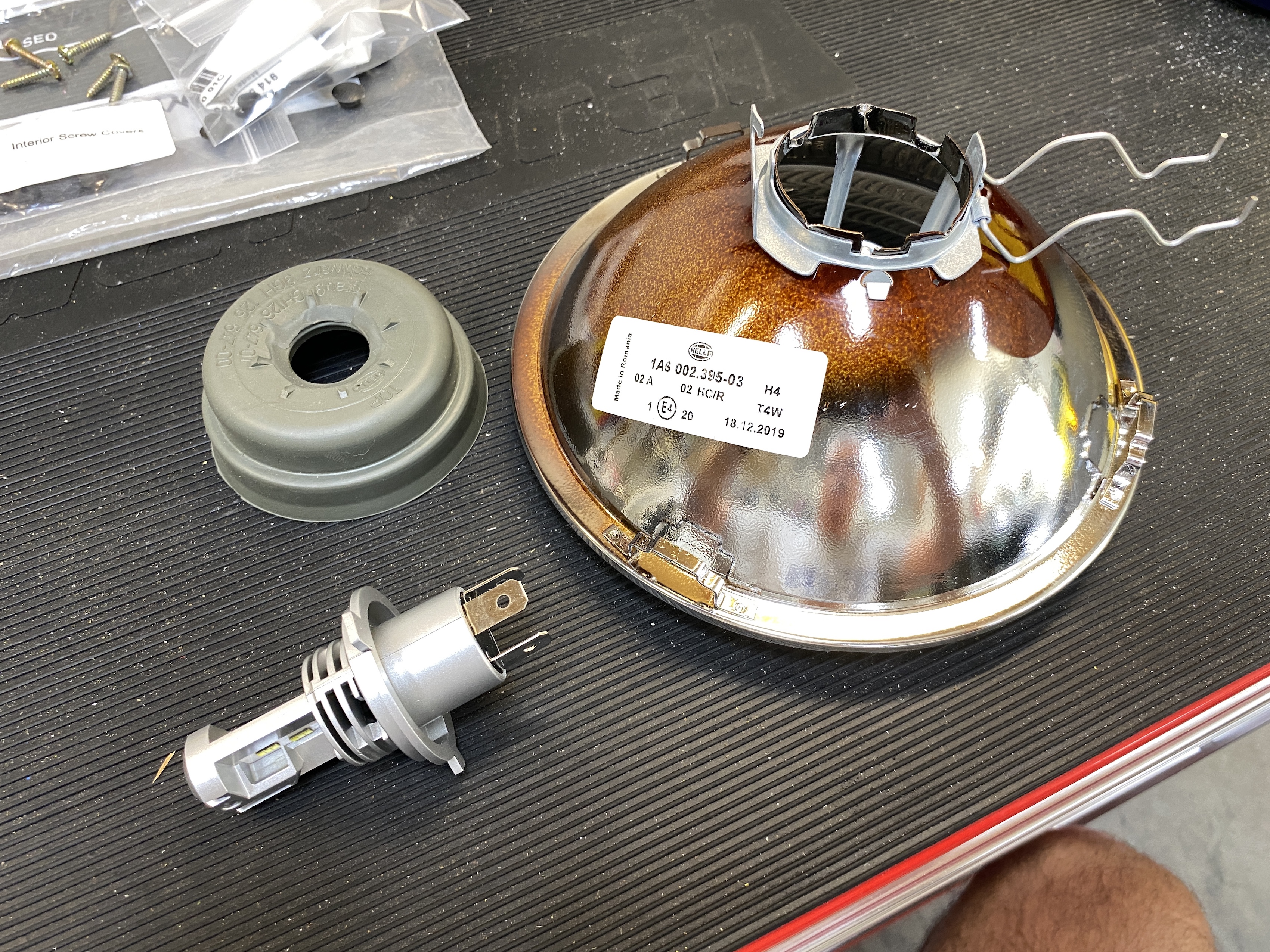 Assembly out, and separated into lens and reflector housing, LED bulb, and rubber seal.