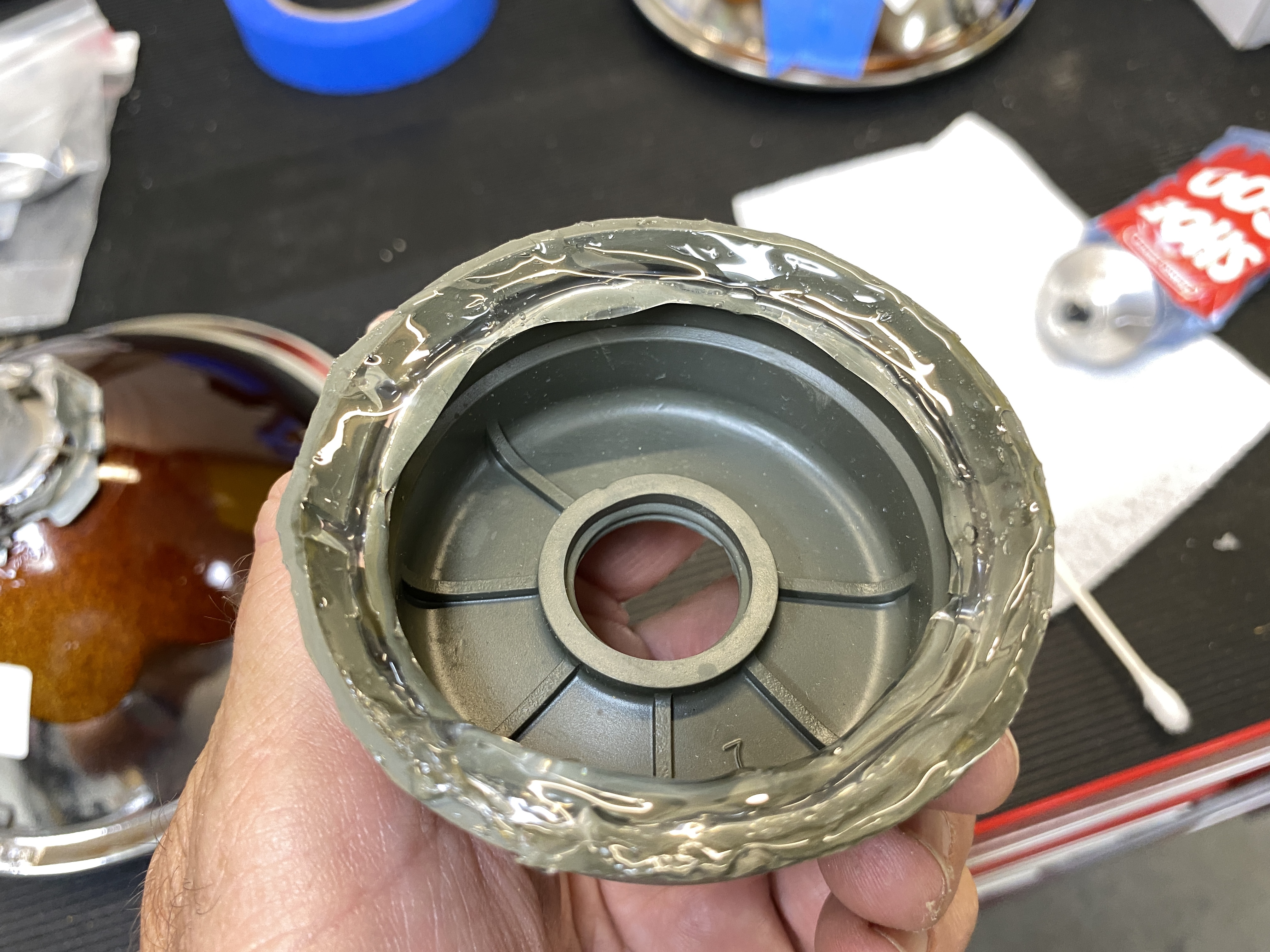 Then a bead of goop around the rubber cap edge, since no matter how I adjusted the fit, the edge would not stay sealed against the reflector.