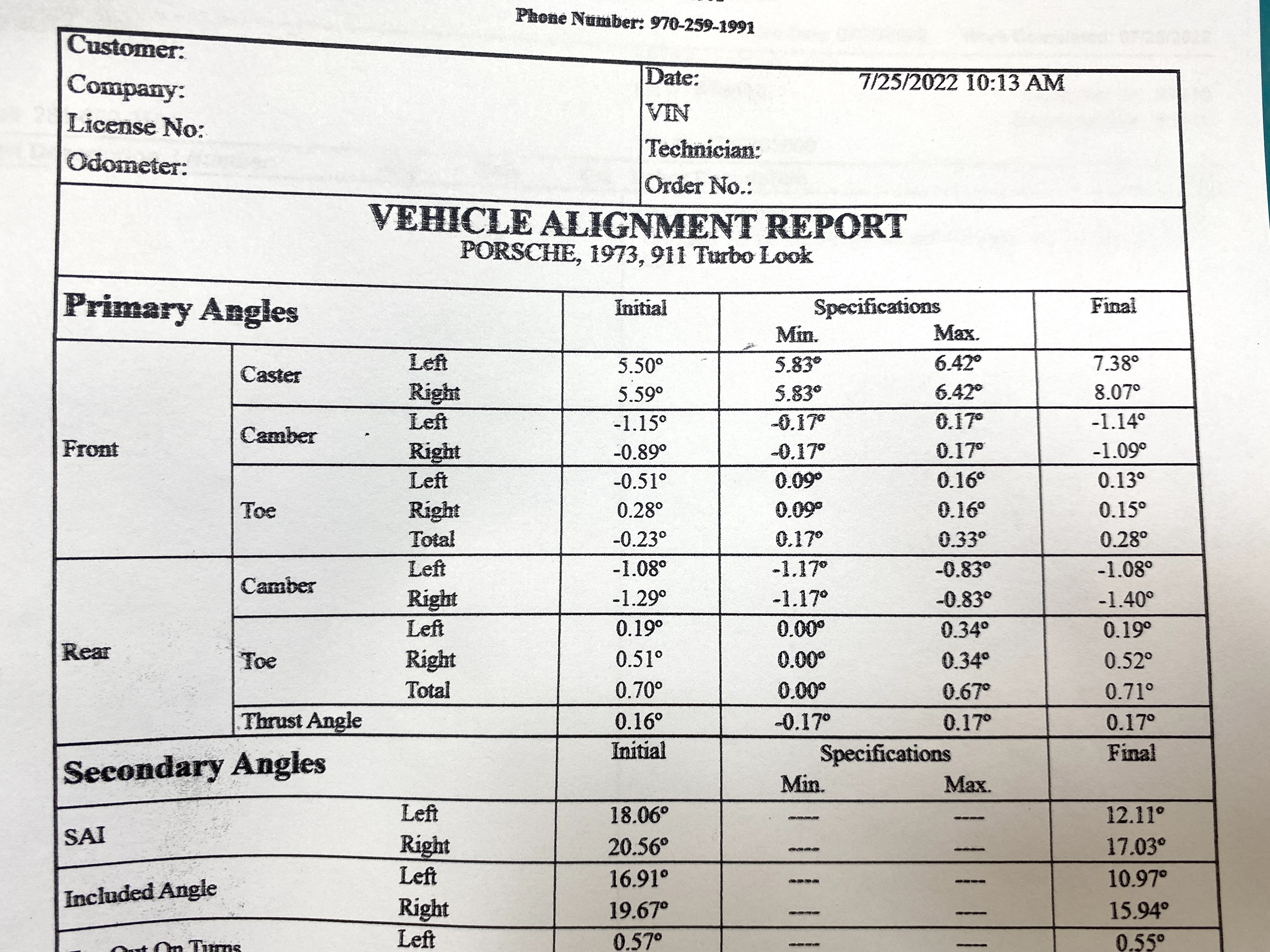 I took the 914 to a shop for a "real" four wheel alignment, but the process failed. After getting the car on the rack and some initial measurements, the tech reported that the assemblies mounted on the front wheels ran into the fenders when the wheels turned. So no camber possible and questionable measurements all around. Rats.