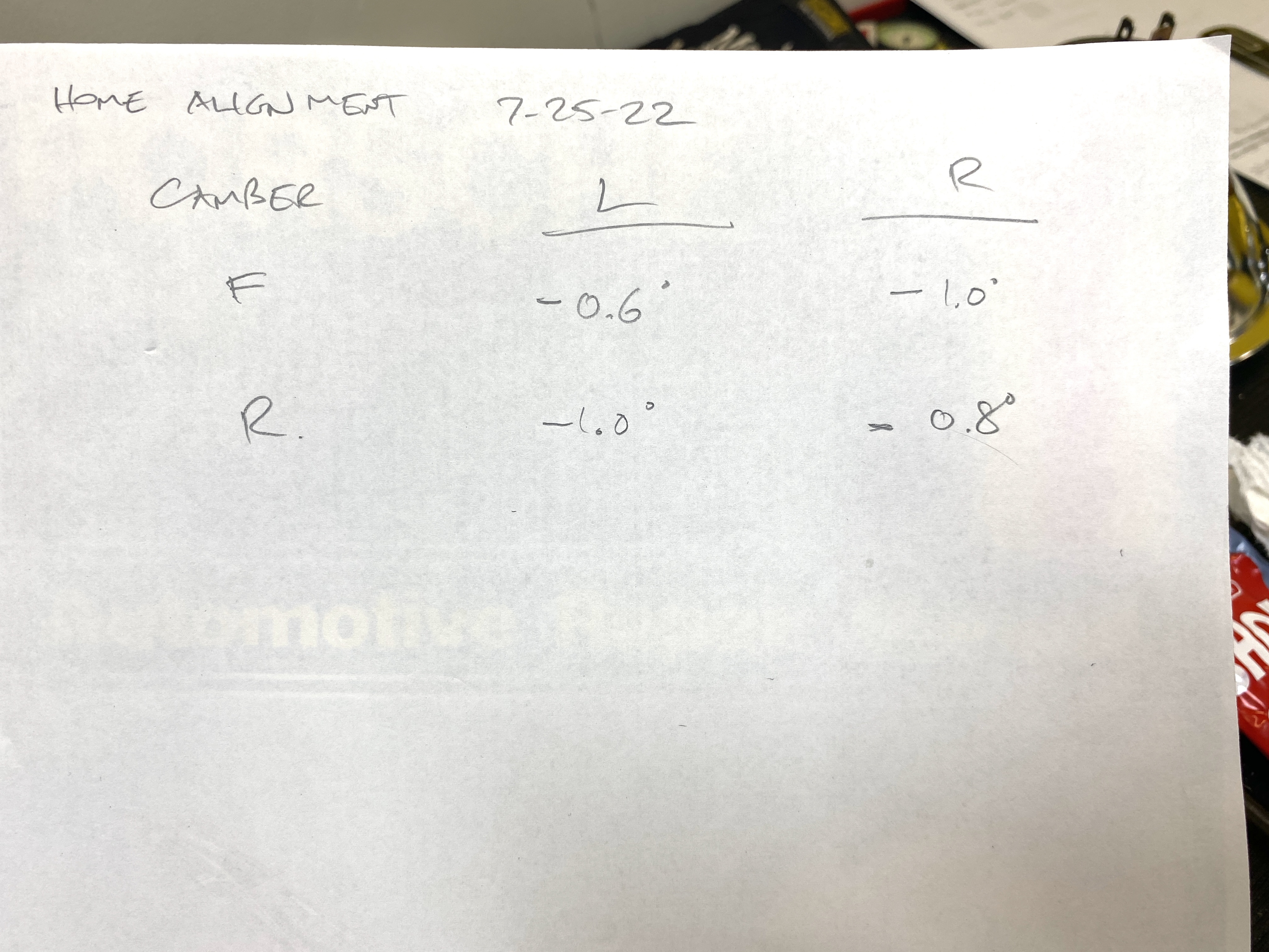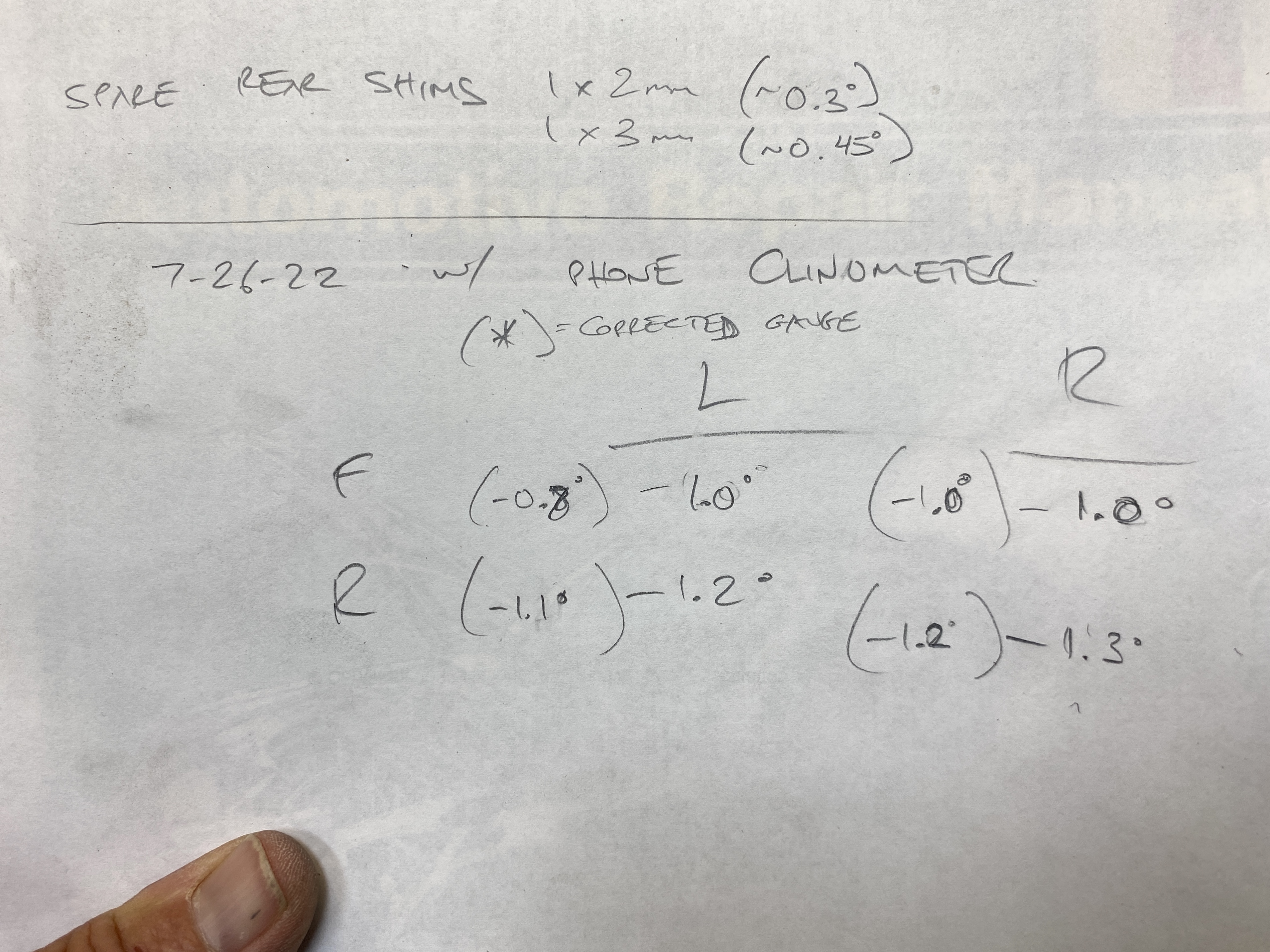 Here's my new measurements, with the phone app and the corrected camber gauge. The variation is probably within error, and these better match the preliminary camber numbers from the shop.