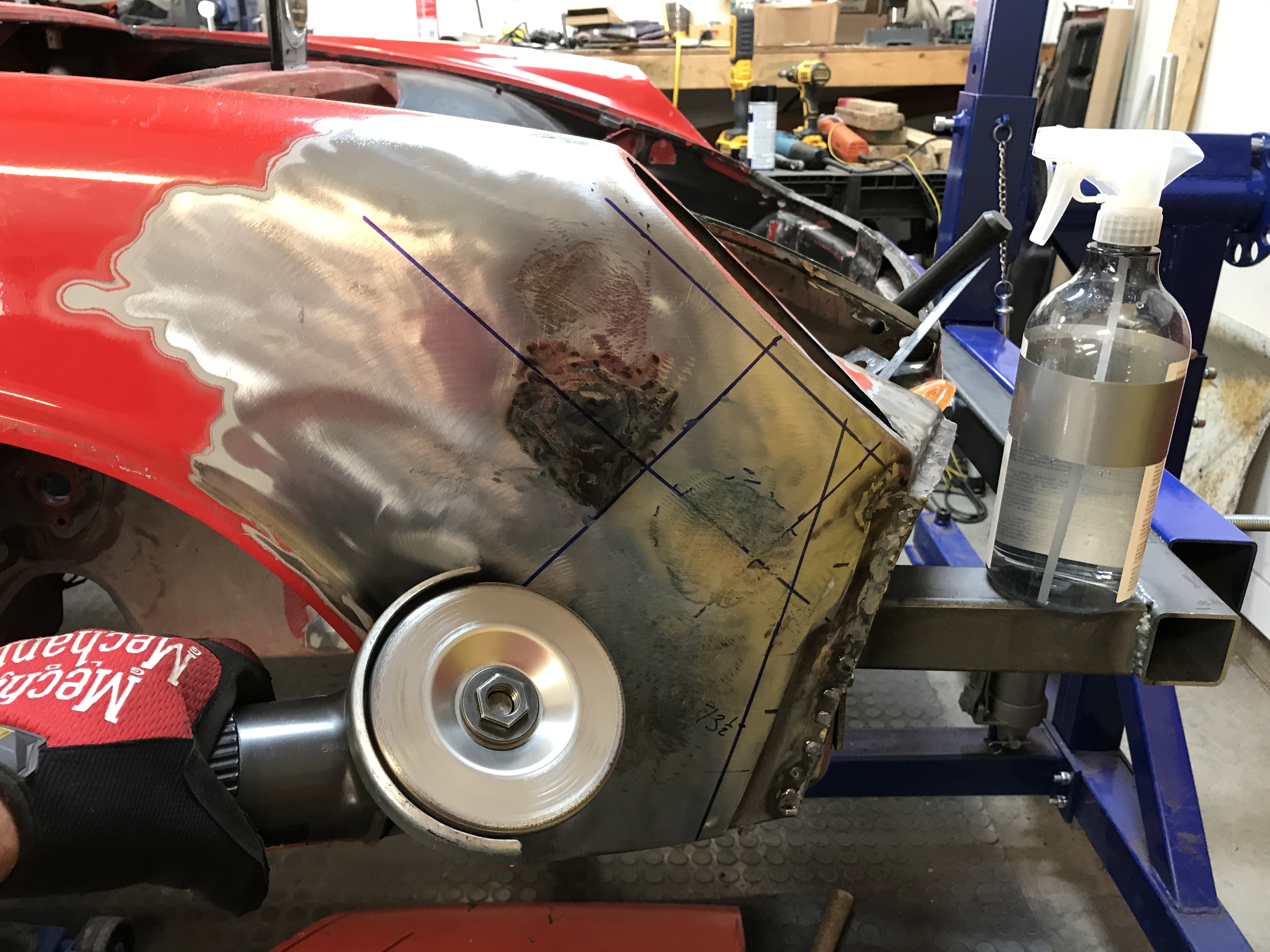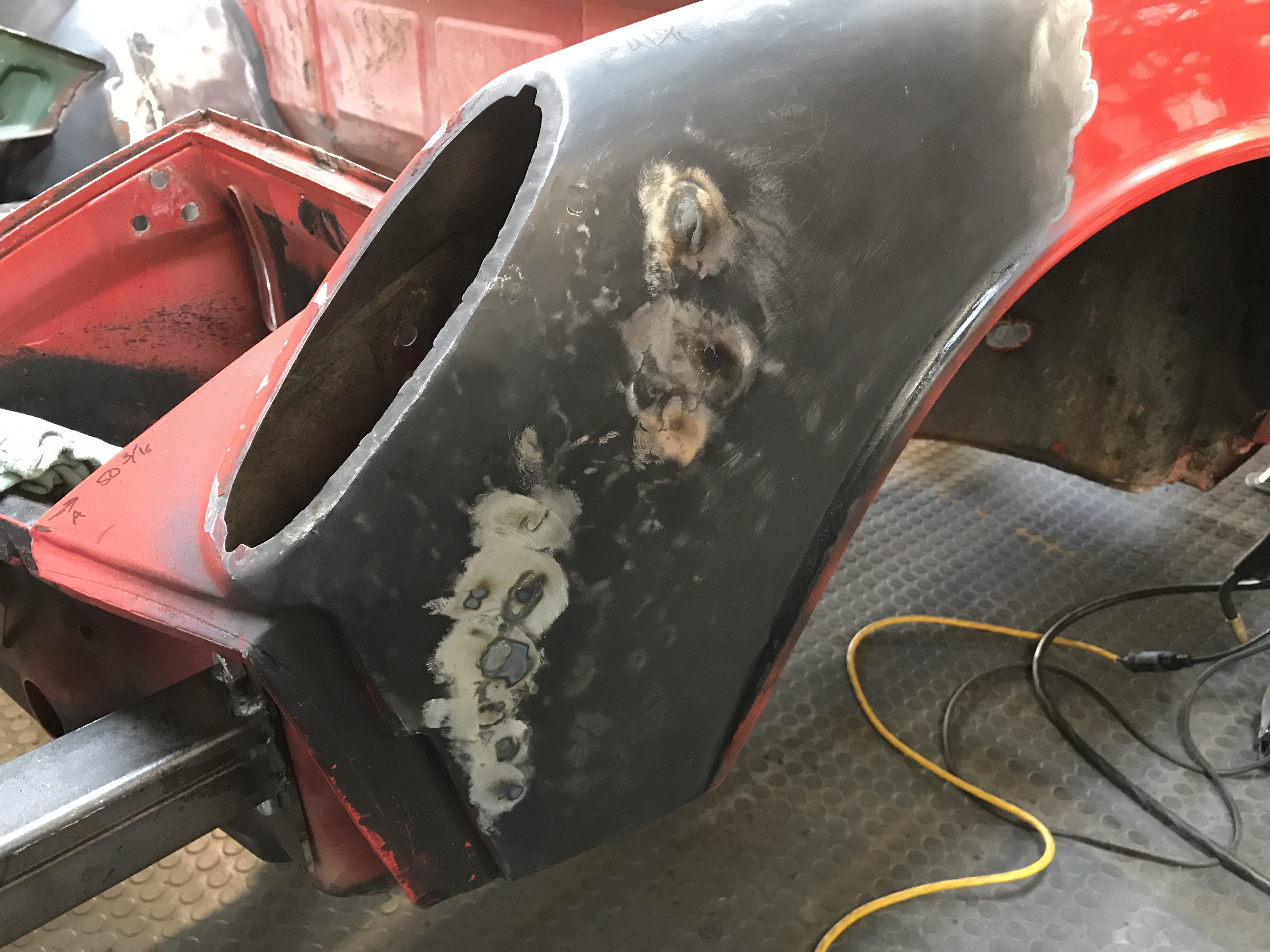 On the the next phase, trying to get the fender as smooth as possible. I might have fantasies about getting the metal ready for paint, but I can settle for a surface as smooth as possible, and then a minimum amount of filler.