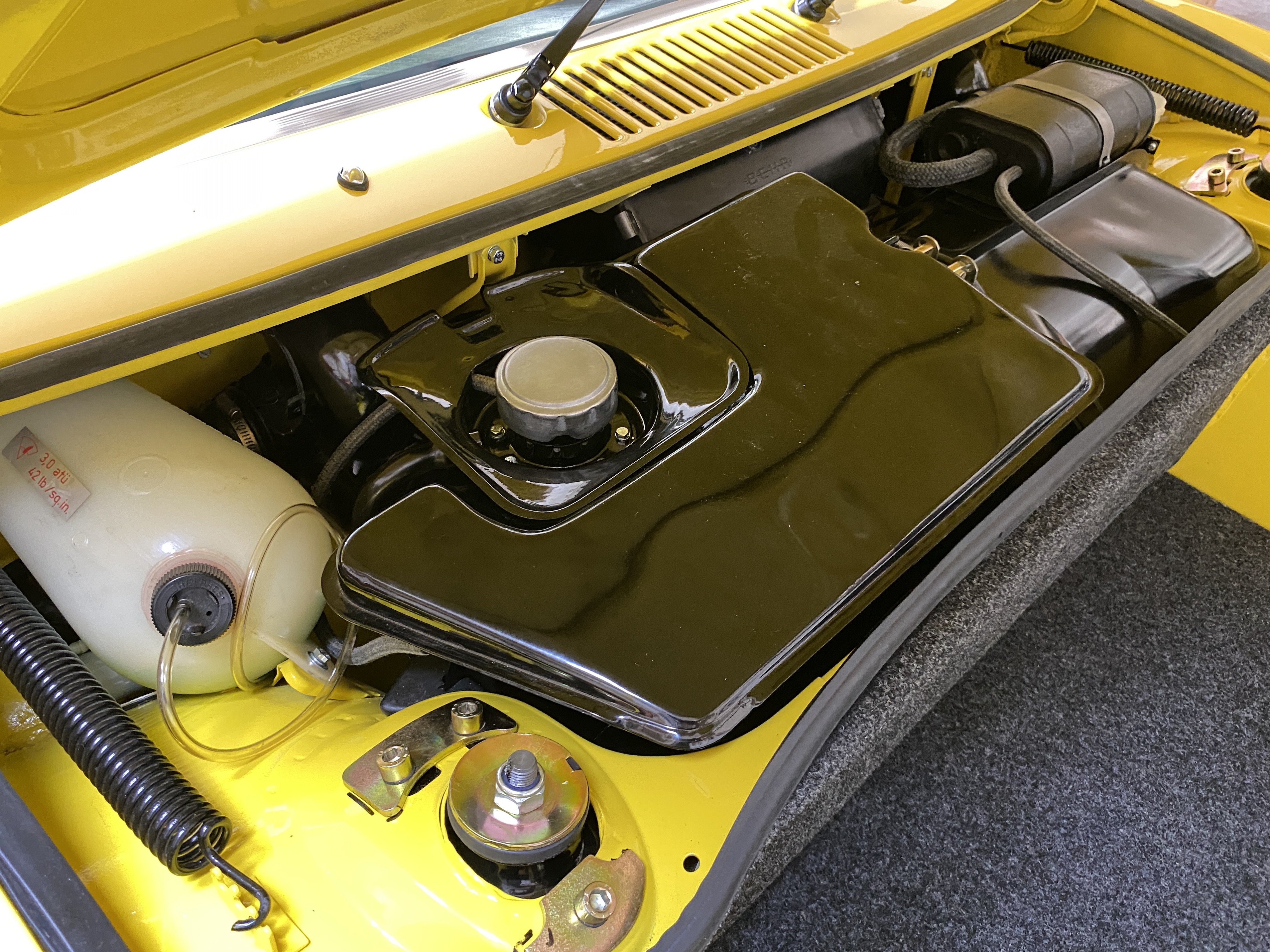 While driving I tried the brake pad bedding procedure recommended by PMB: accelerate to 60 mph, brake hard to 10 mph, repeat about 6 times, then drive without braking to cool things down. A post-drive report: The brakes are better, but still a bit spongy and not at all "grabby" Tough to get all the air out The car drives straight, with the steering wheel centered, and no wandering. It responds nicely to steering input, but I have to get used to manual steering again. Are you running stock size tires? I have found 175/65 feel very good, not heavy like larger sizes I also have to get used to my whopping 125 hp (actually, at the altitude around here, more like 100 hp). Acceleration is, um, leisurely, but steady. With a new correct angle drive, the speedometer works but seems to read fast. My tires are within 1% of original diameter, so it must be internal to the gauge. No odometer function. I stopped for gas on the way home. The gauge indicated a bit more than 1/4 tank. I put in 6.5 gallons, and it read about 3/4, so it seems to work. I have found my gas gauge somewhat inaccurate, gets you in the ball park. Is your low fuel light working? Great project, thanks for documenting. Now she's going how will you be spending your free time? Thanks. I plan to try at least one more round of brake bleeding. Not sure yet about next. I promised to help my son with a restoration of his choice. We'll see. |