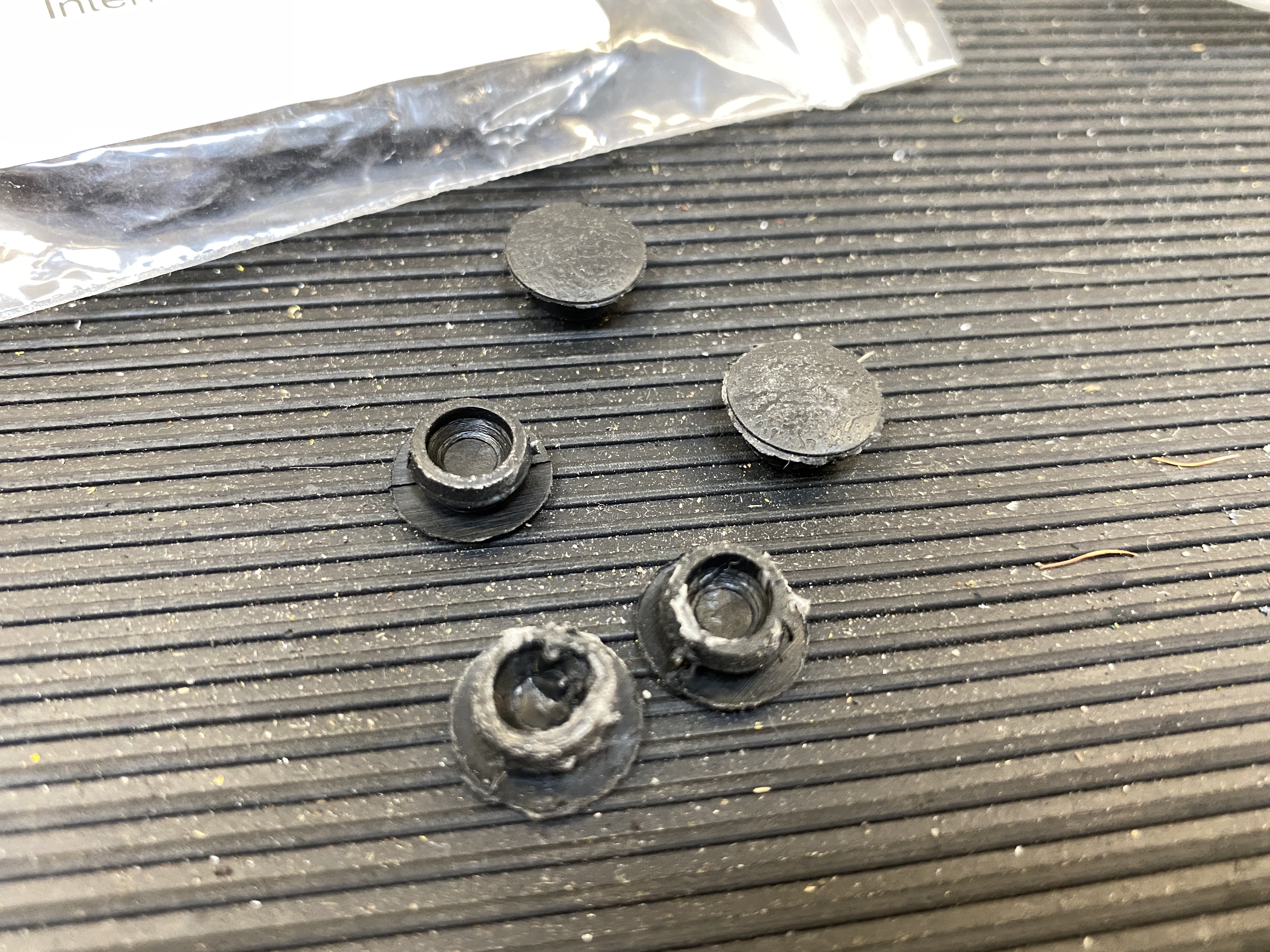 Here's my collection of plugs. The ones in the top center are the few I rescued from the car, and feel like hard plastic. Replacements are on the left, lower center, and right.
