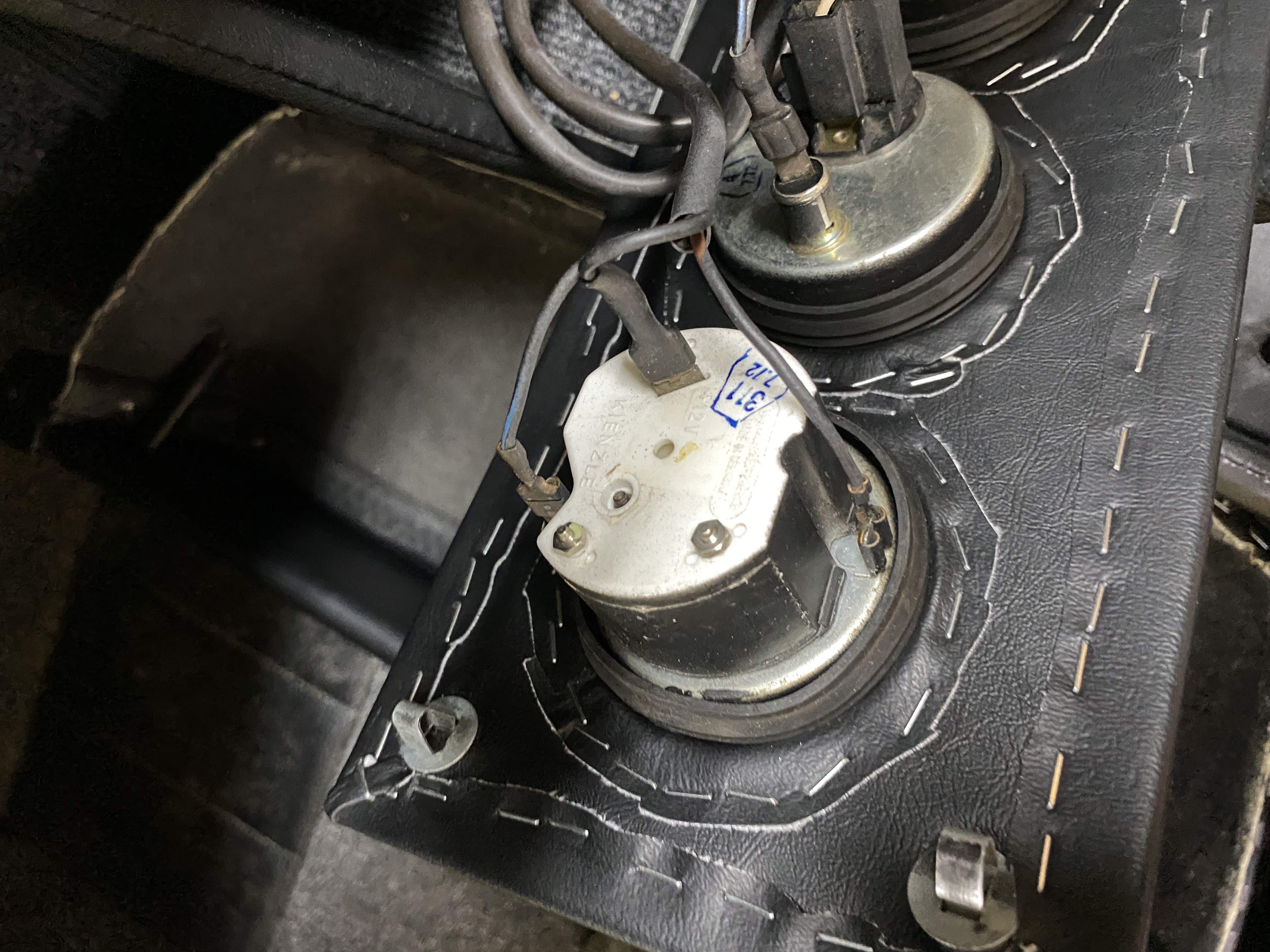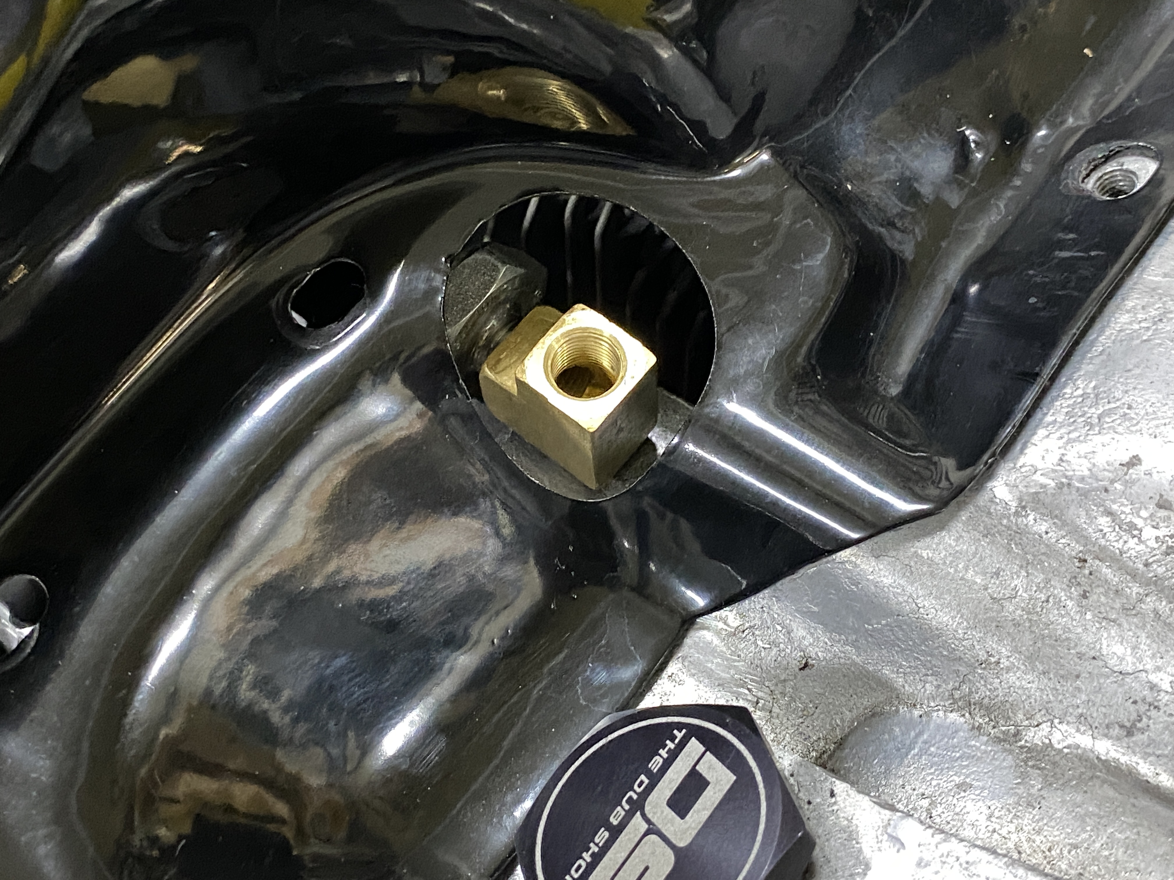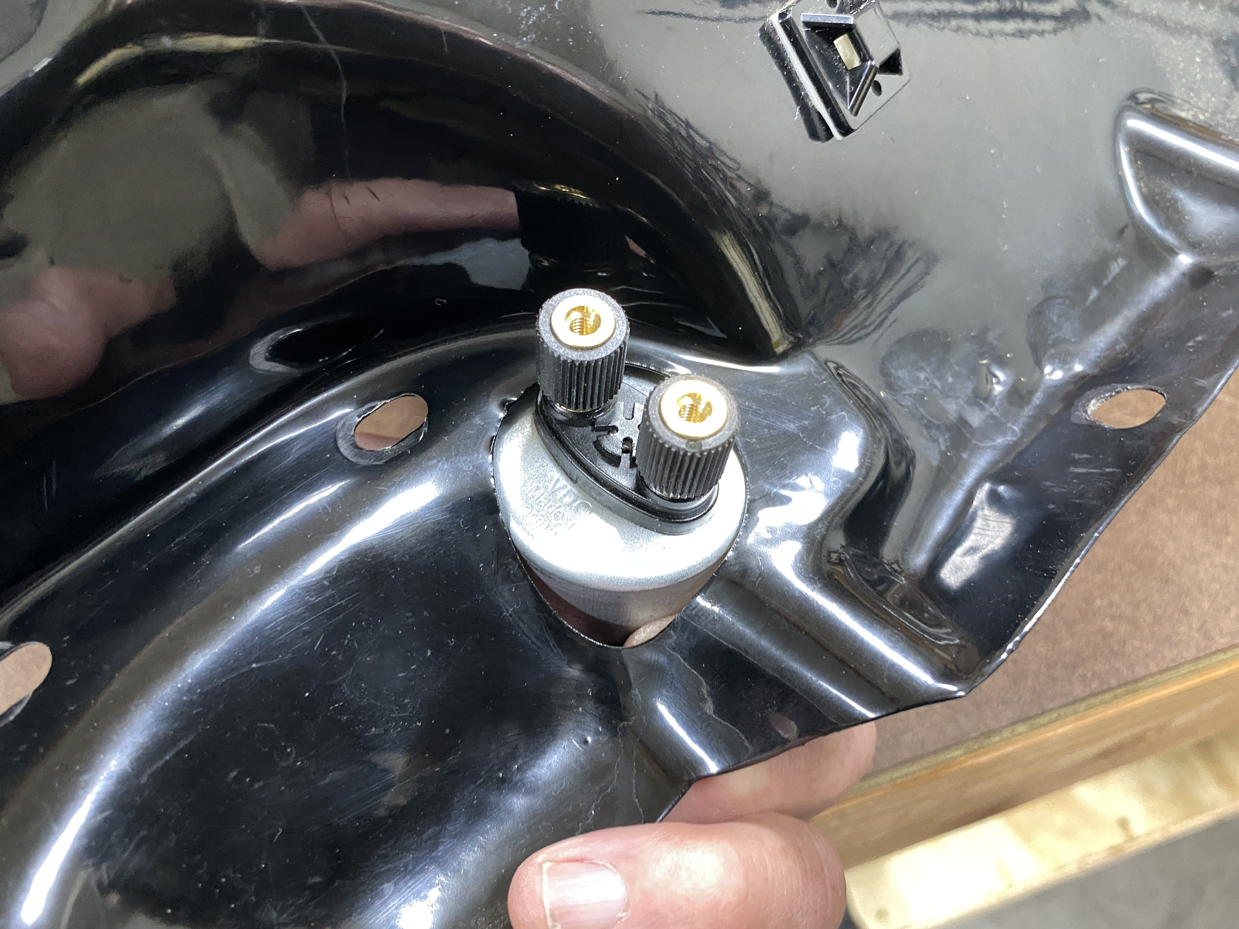 A view from above the sheet metal. The stock hole will probably need enlarging for the VDO sender. That was supposed to get delivered yesterday, but my local USPS is full of excuses.