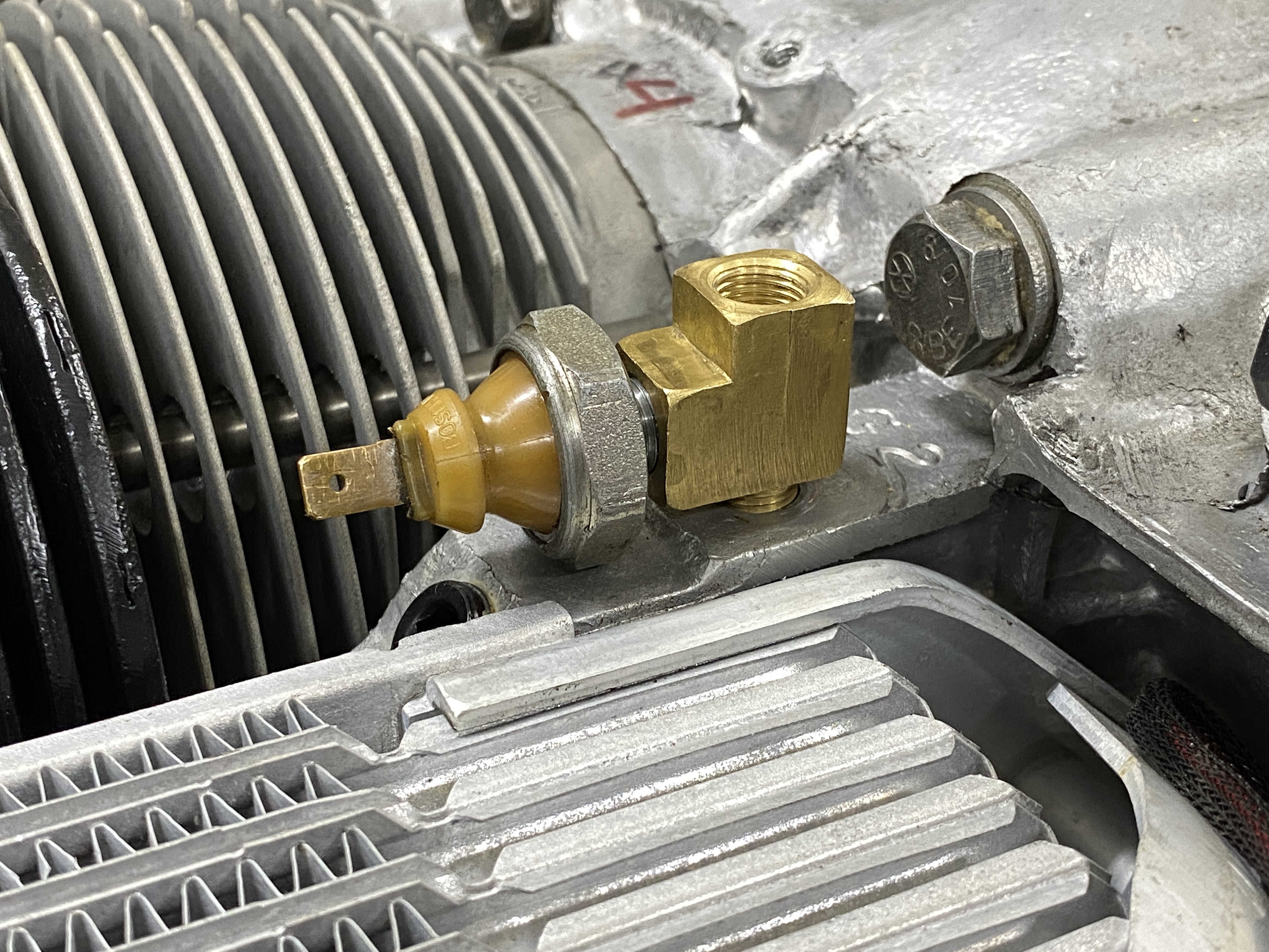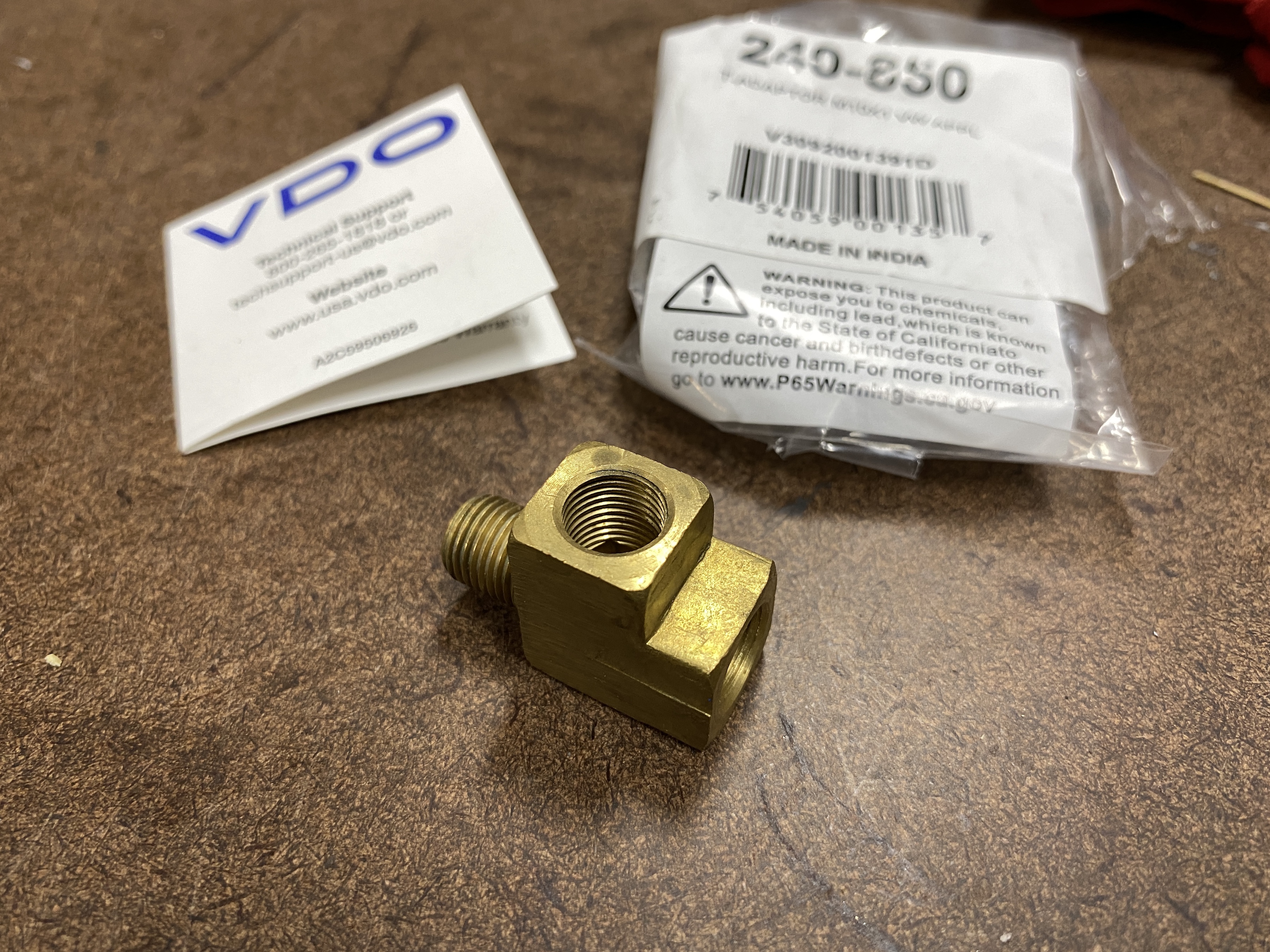 I want to add an oil pressure gauge. And I want to keep the idiot light. From what I understand, the VDO dual sender triggers the idiot light at 7 psi, which is too high. Better to keep the stock pressure sensor, which triggers at 3 psi. I also know that one popular solution is to mount a T-fitting on a flex hose. But the flax hose makes me nervous, so I want to try a solid approach. That can have other problems, but I have some ideas--have to see how things work out. Anyway, here is a VDO brass adapter. Attached thumbnail(s) |