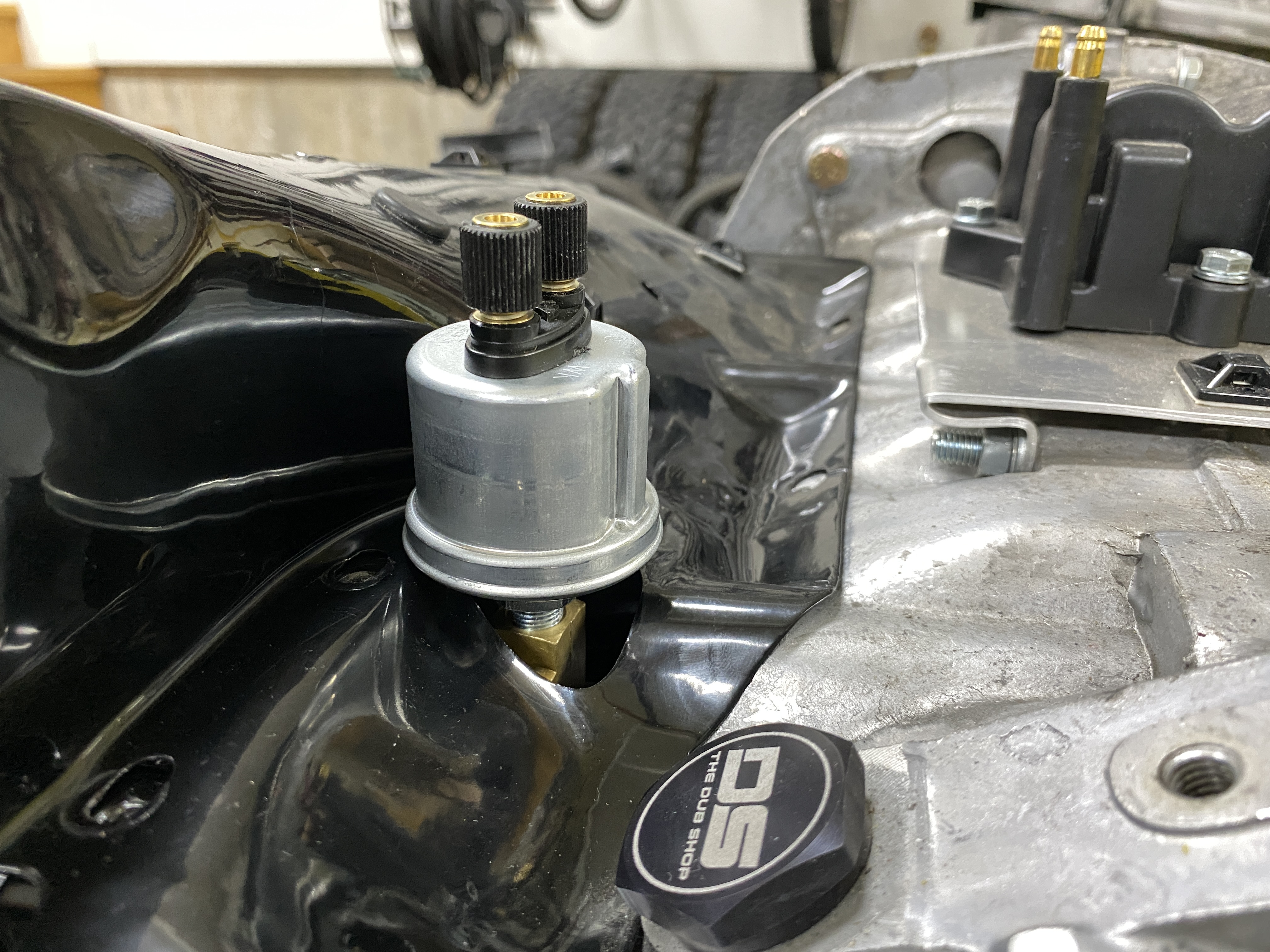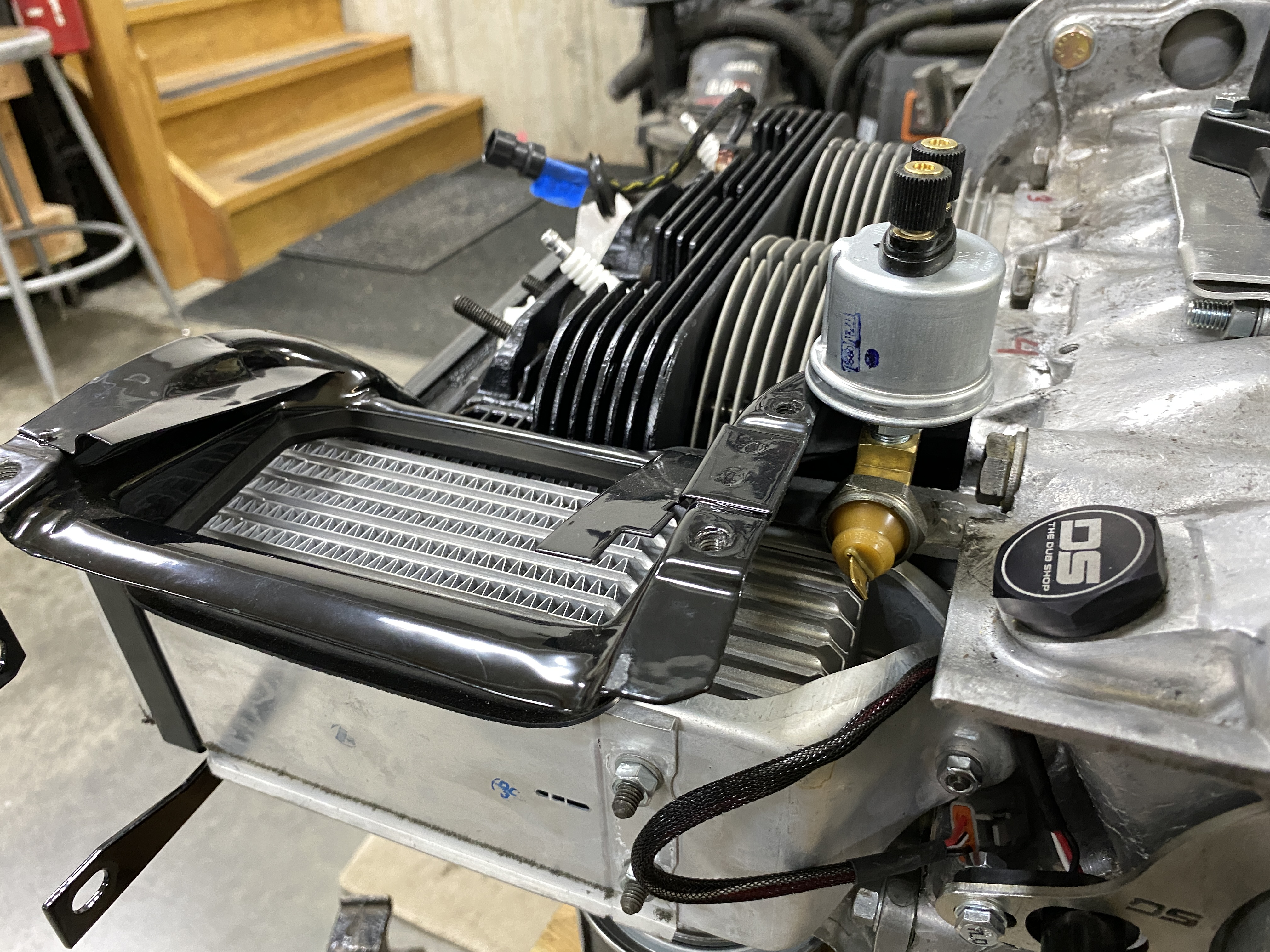 Checking the fit of my dual-oil pressure sensor set-up. The oil cooler duct requires the stock sensor to face forward, but the new VDO sensor sits nicely above the duct.