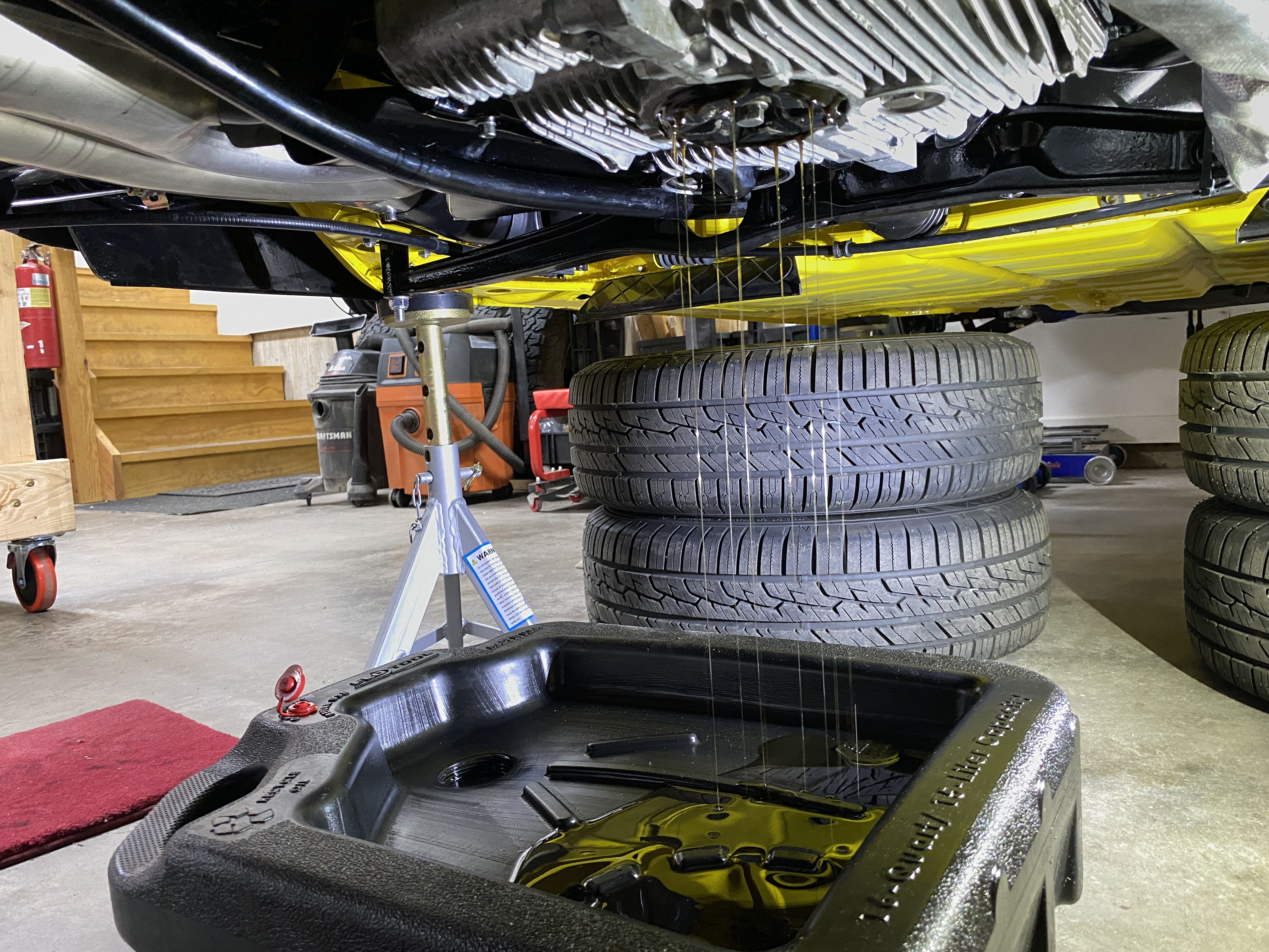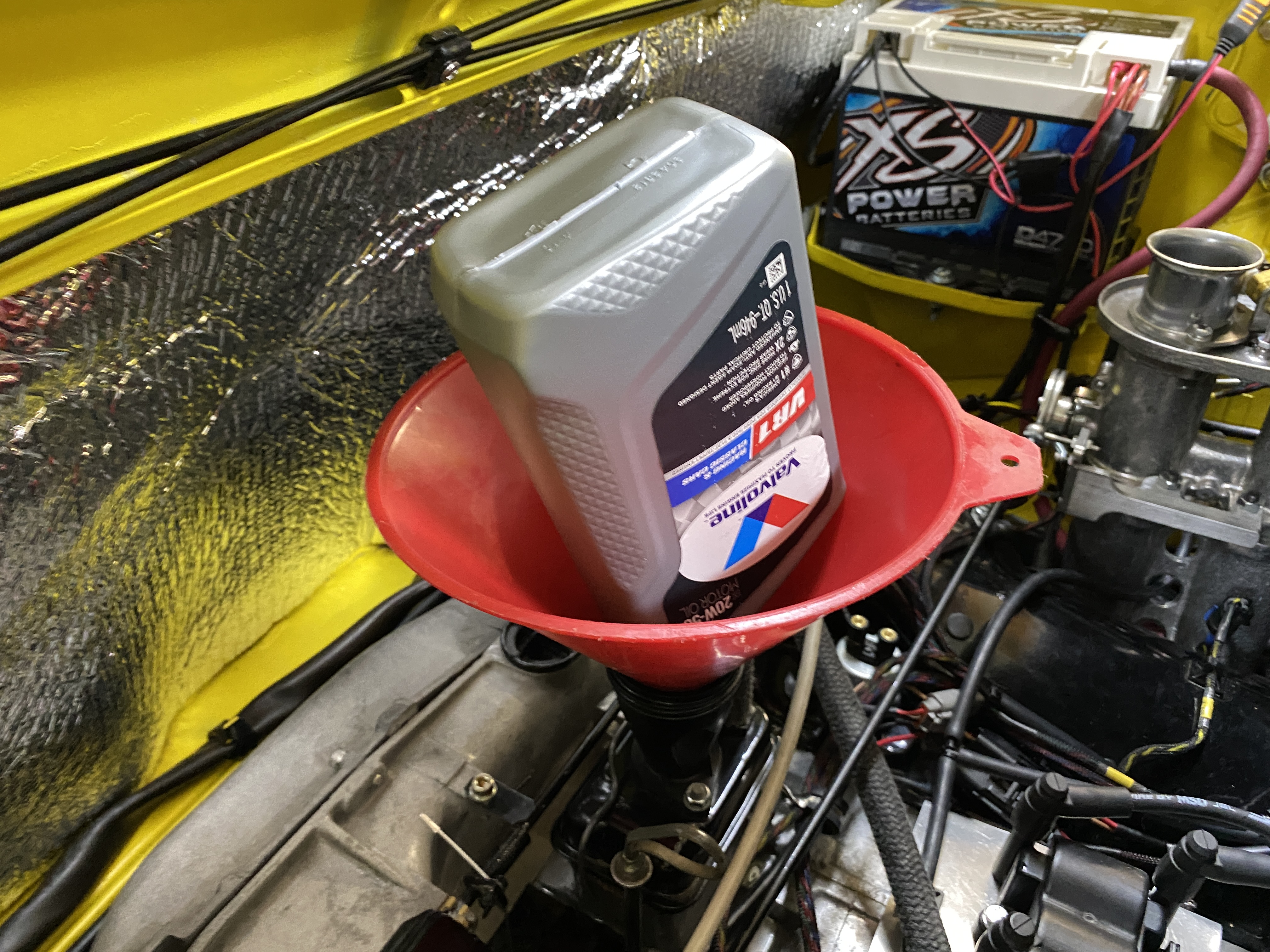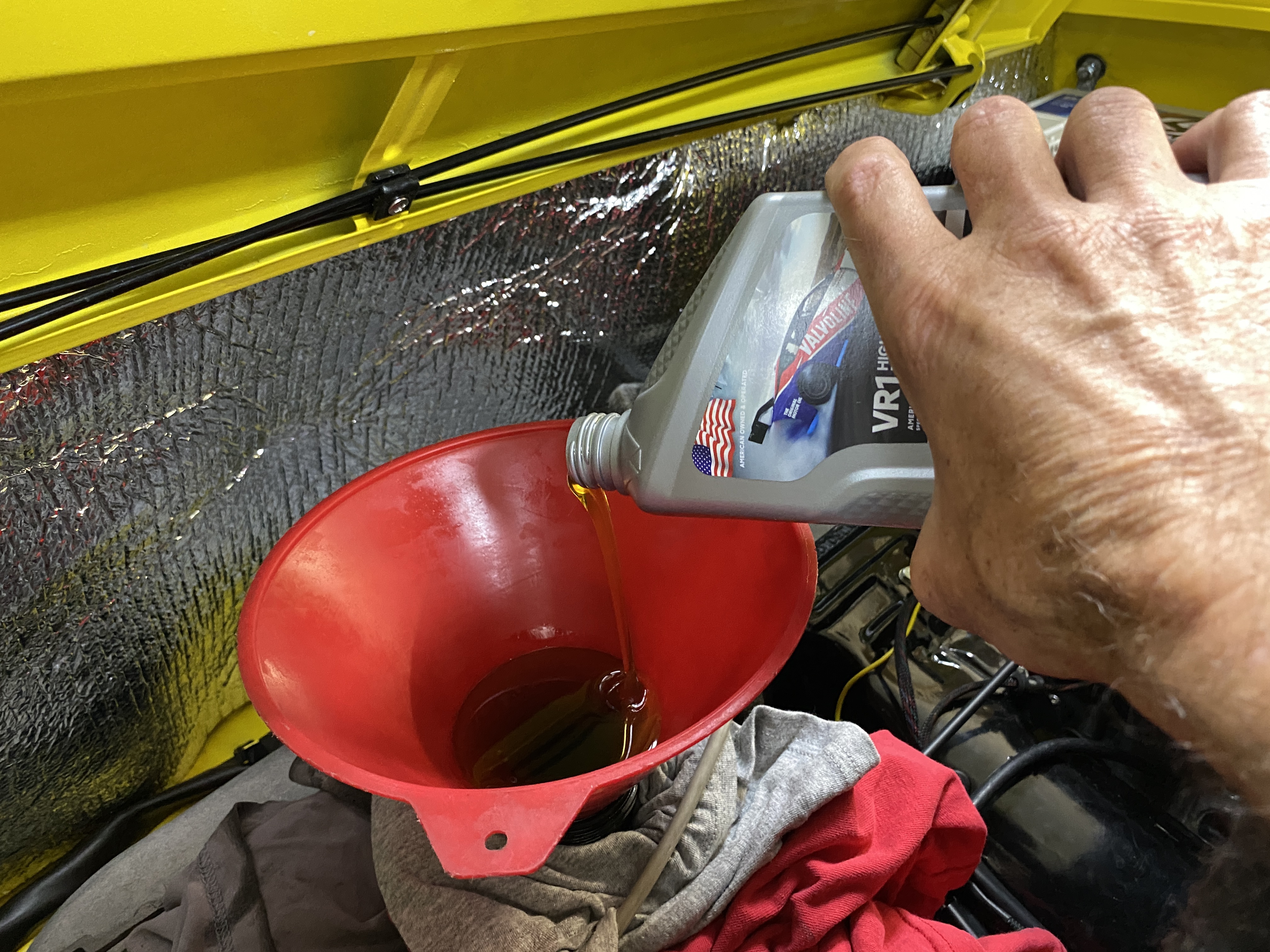 Then a puzzling moment. I tried to pour the first quart of oil into the case and it backed up. Over 5 minutes it gradually went in. I wondered if the cold oil (my garage was about 40° today) was too viscous. Then I started to think. Was I stupid enough to leave the paper towel in the oil breather cavity (to prevent anything from falling into the case while it was out of the car) when I put the breather on?