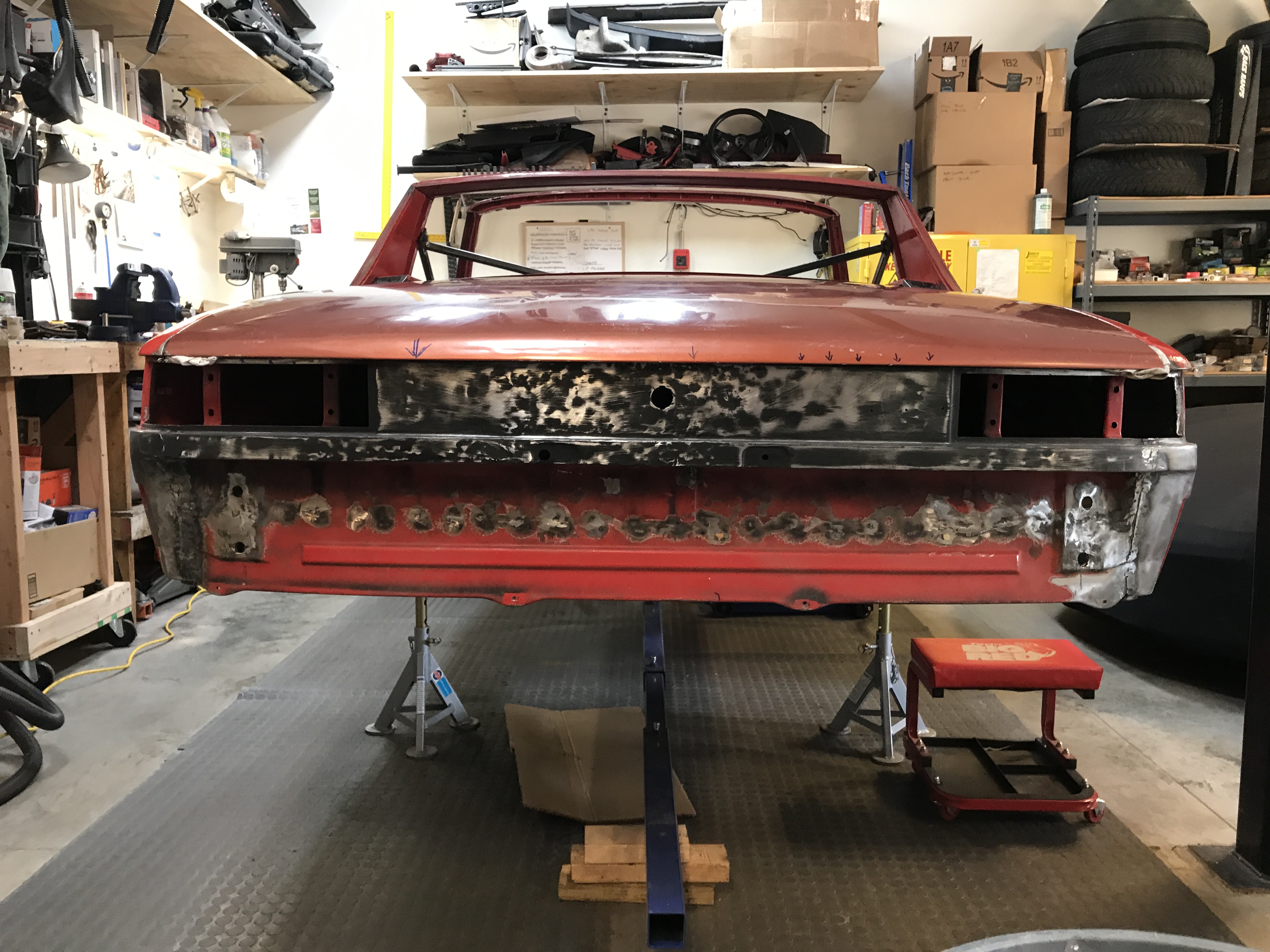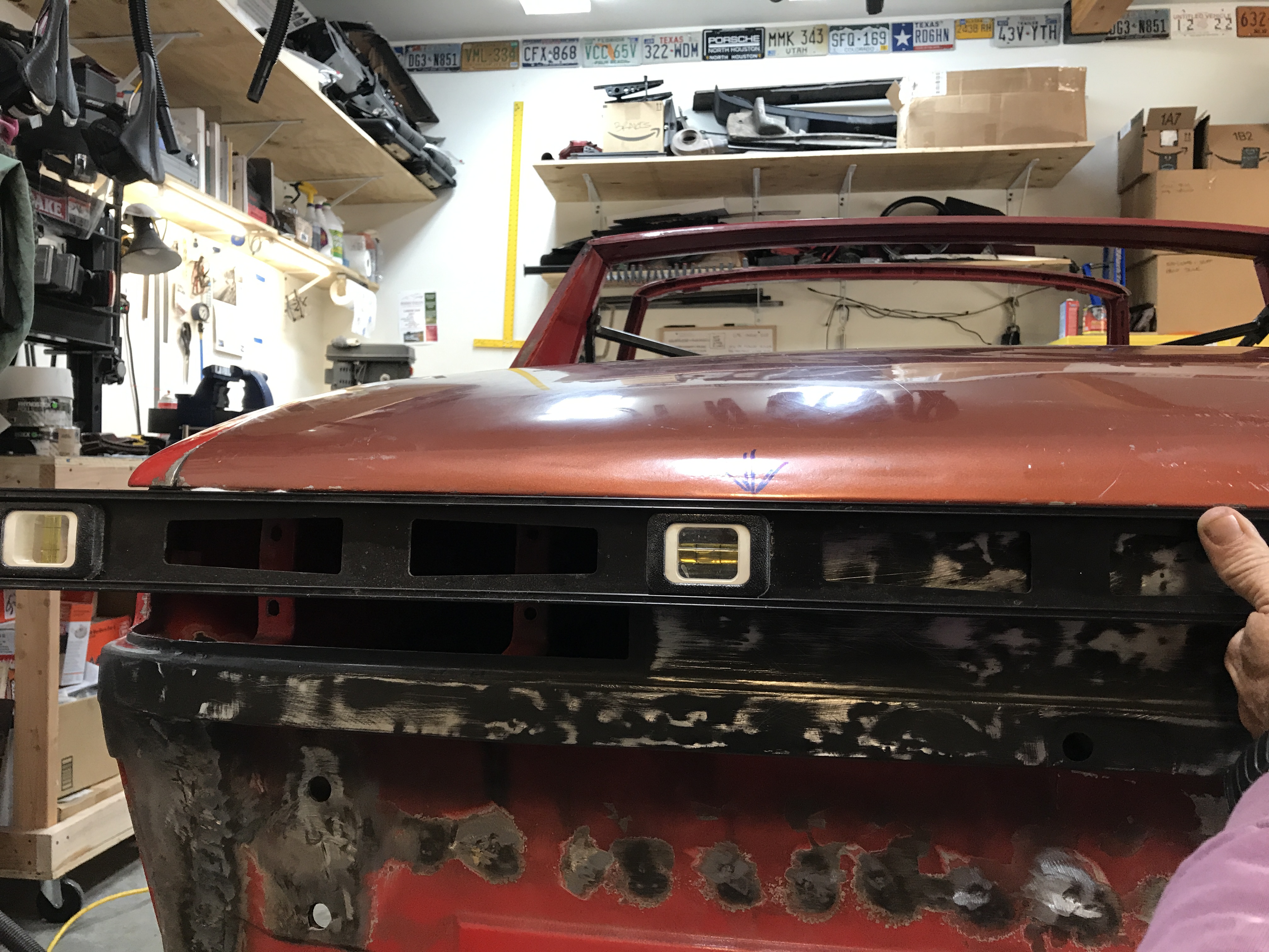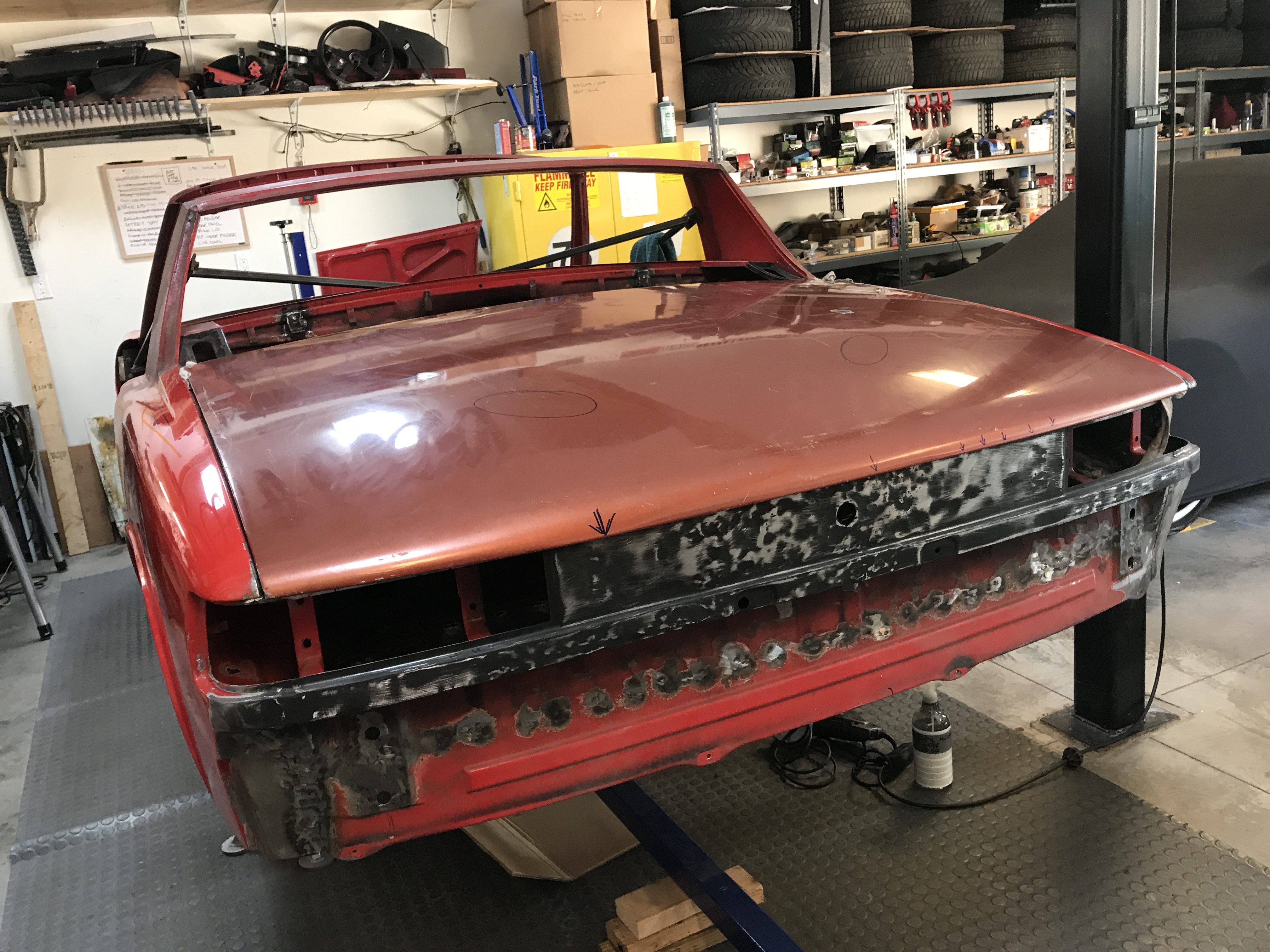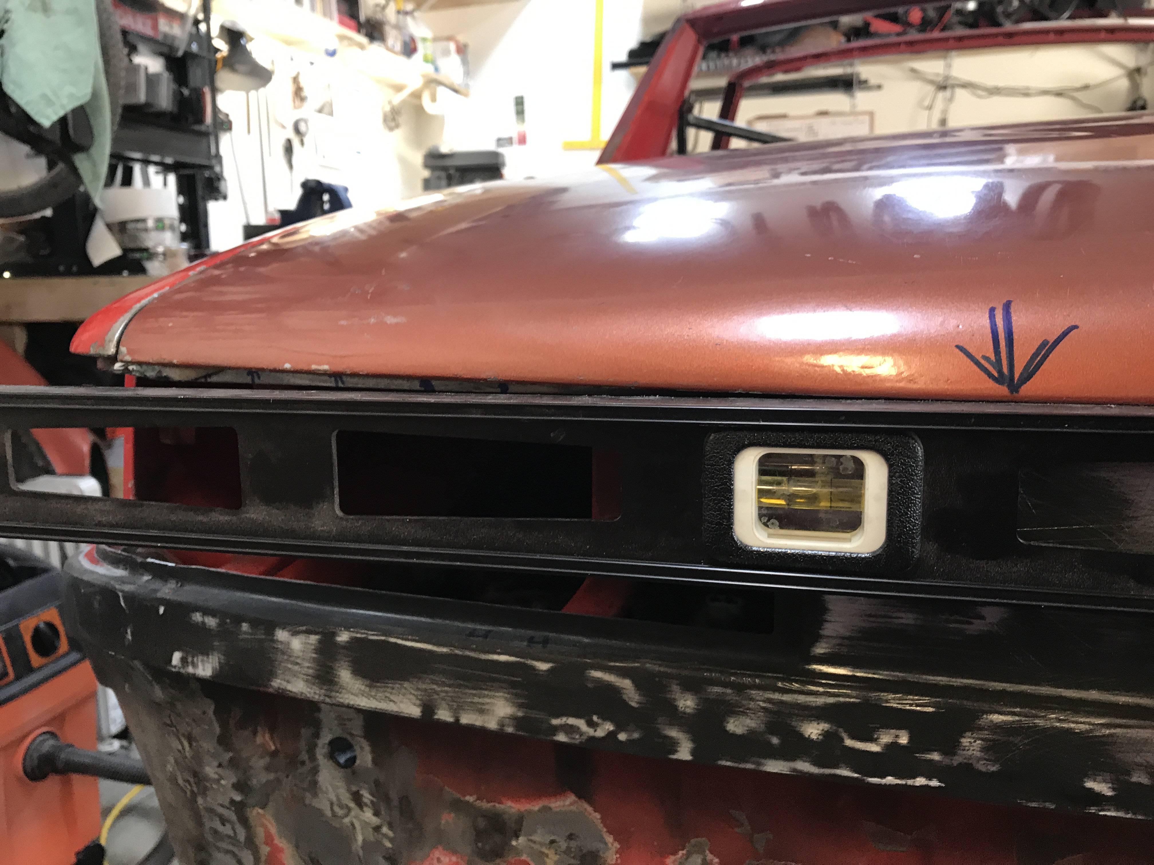I then set the trunk lid back on the car, propped in rough alignment. The next step is to straighten out all the dings, including the trailing edge. From 10 ft it looks pretty good, but...