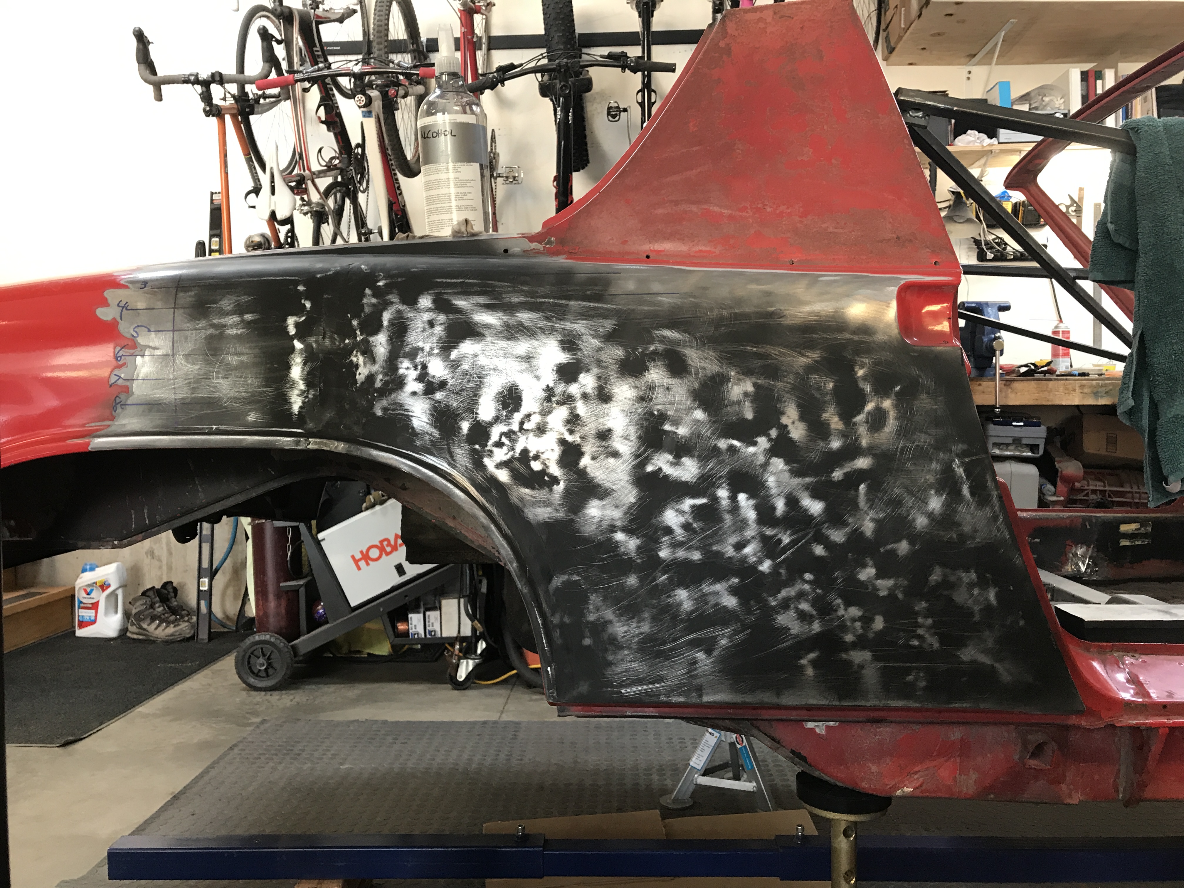 Meanwhile, I finished up the metal work on the right rear fender. The sanded spots in the guide coat make it look worse than it is. The highs and lows differ by only about 1 mm.
