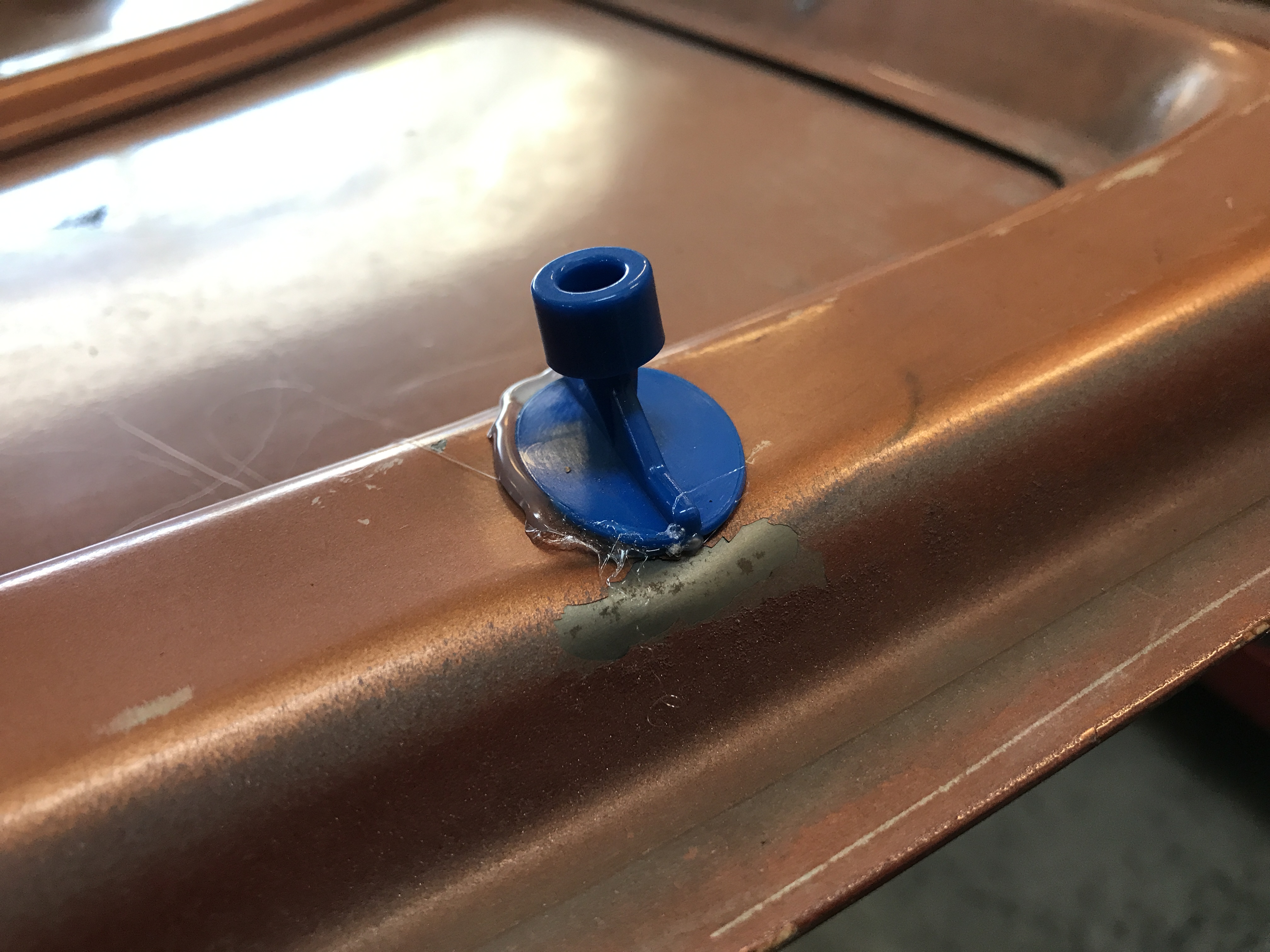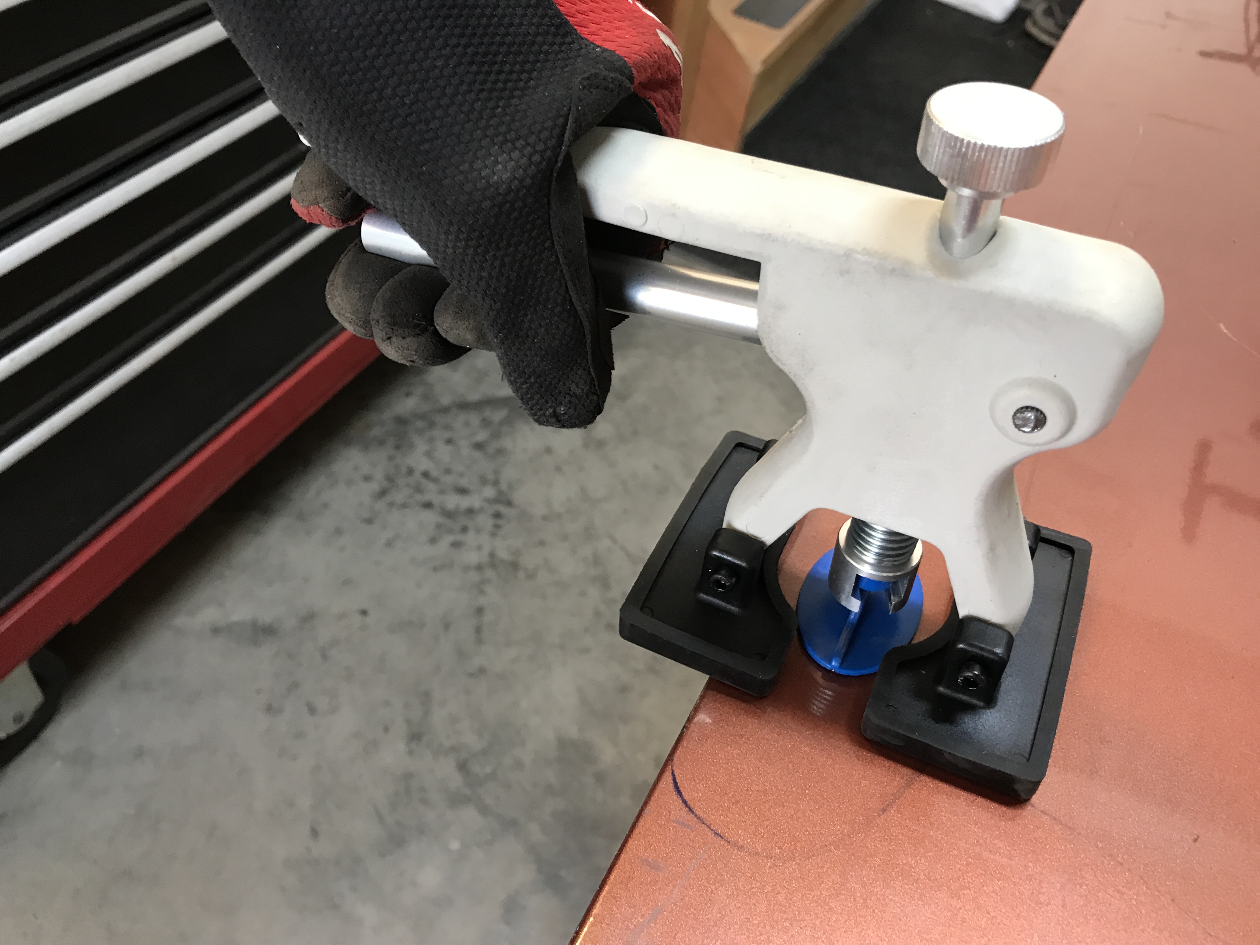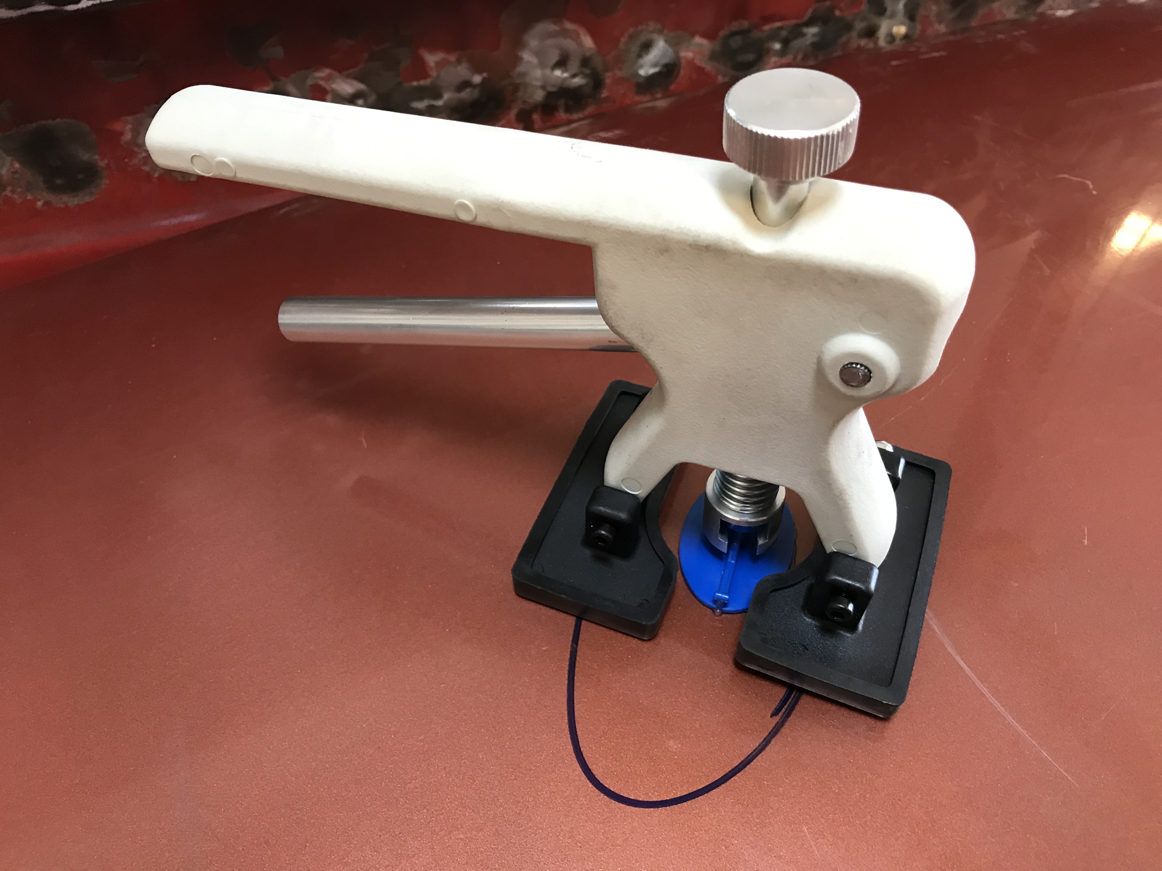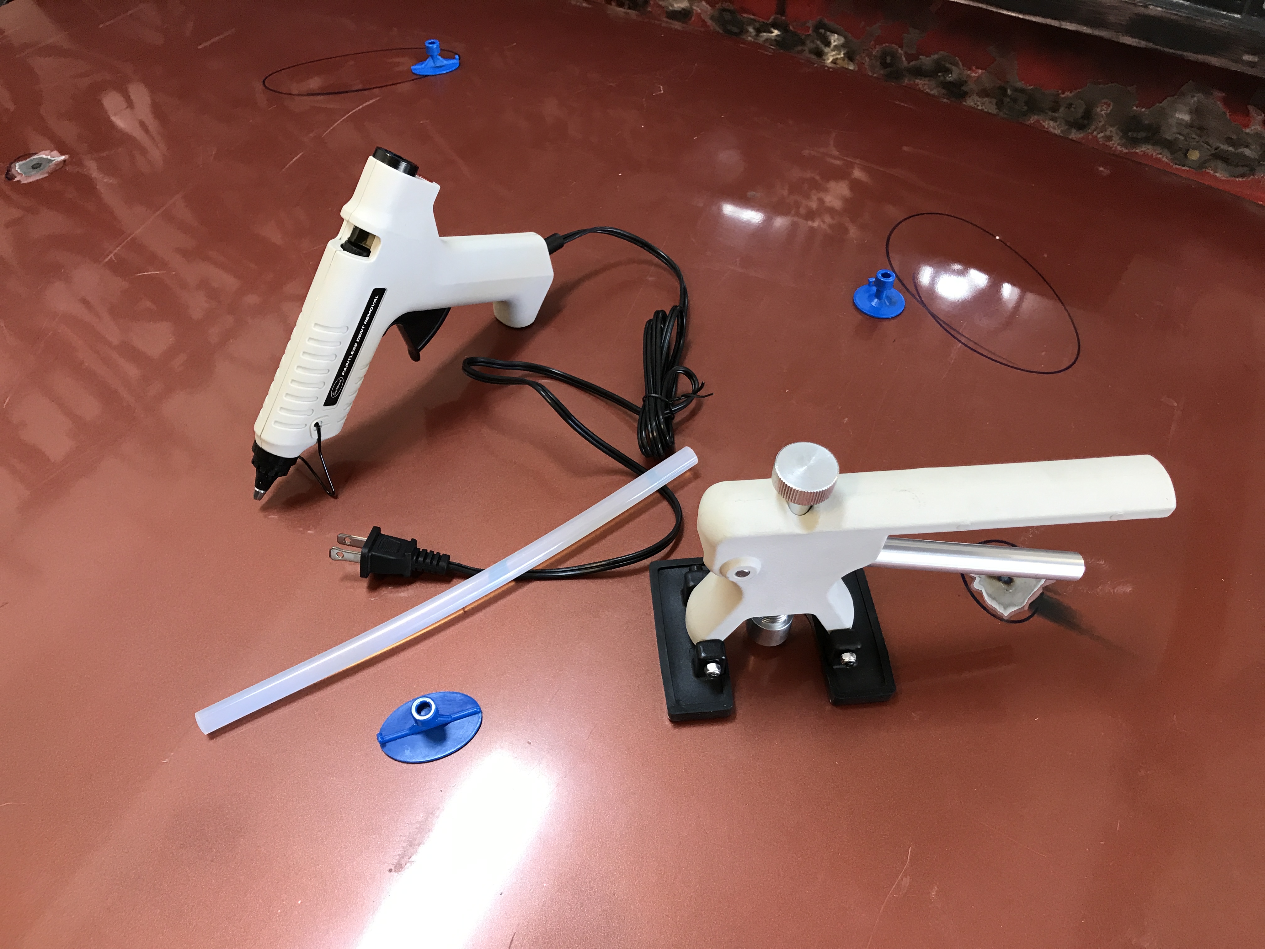 More work one the trunk lid today, and playing with a new tool kit. This is the pointless dent remover set from Eastwood. It comes with a glue gun, plastic pulling tabs, a hand lever pry thing, small slide hammer (not shown), and tab remover.