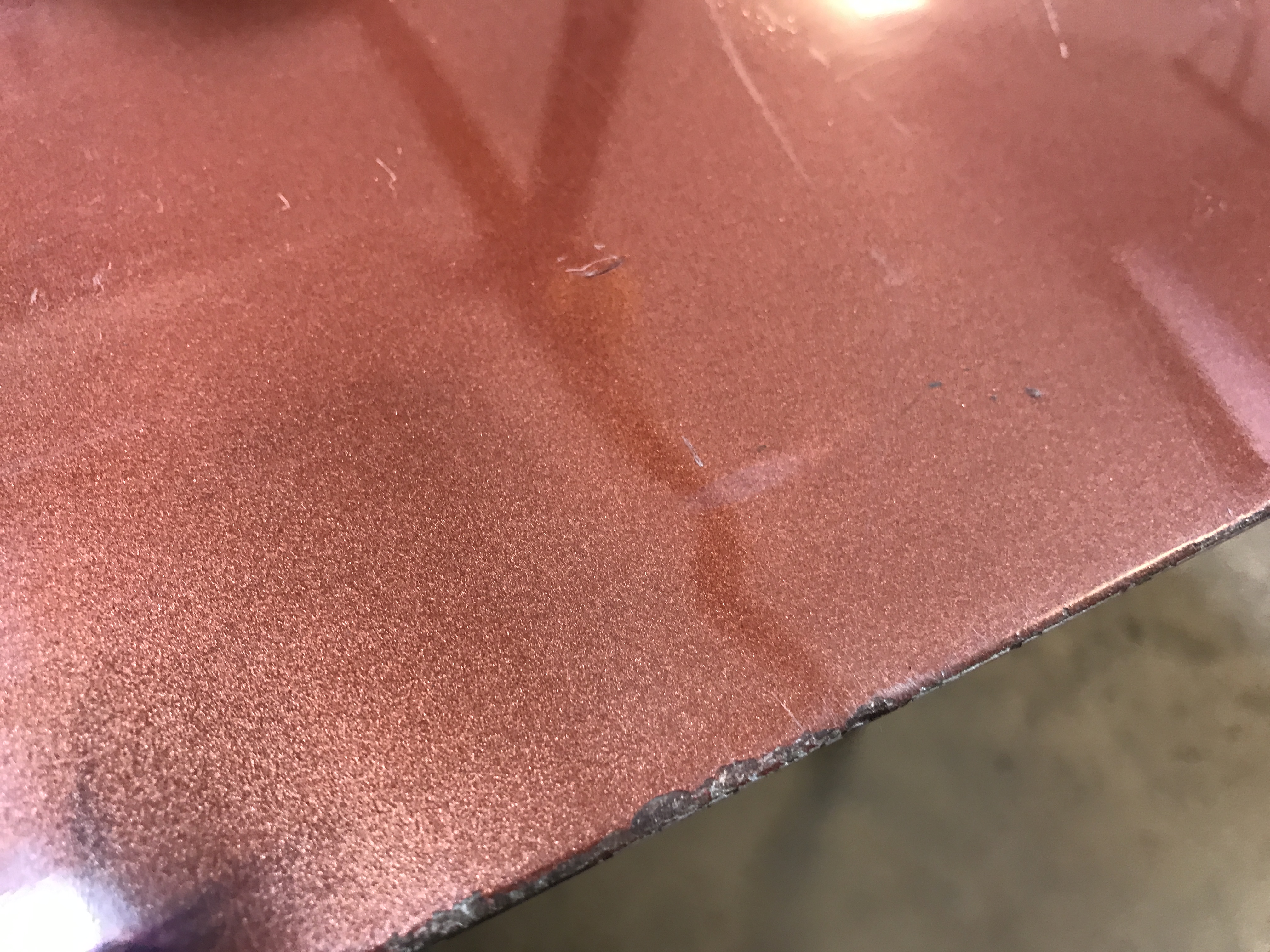 The trailing edge has been bent inward. I suspect it got set down hard enough on that edge to roll it under a bit. From the right side to the center, I see a gradual drop of the edge.