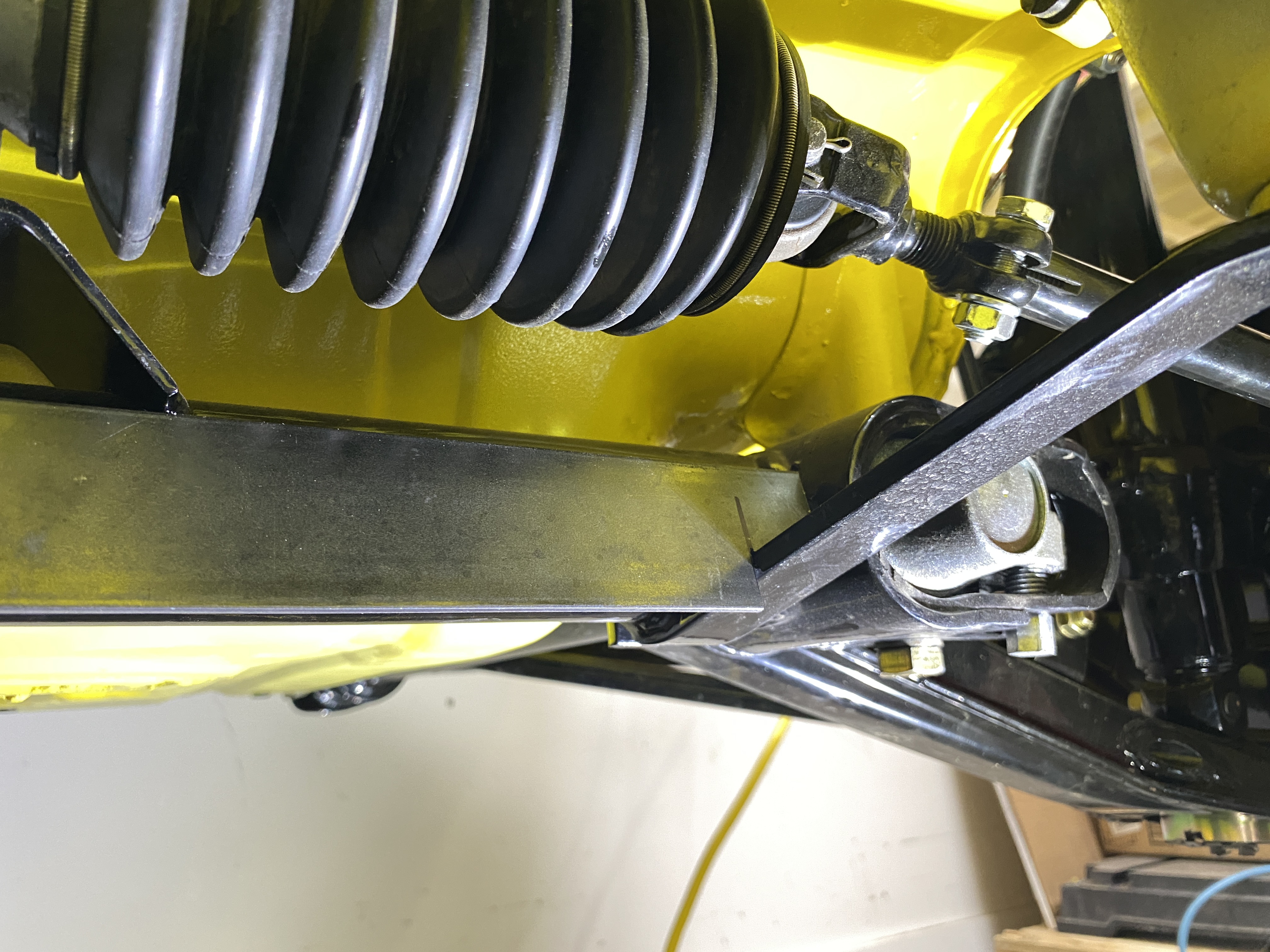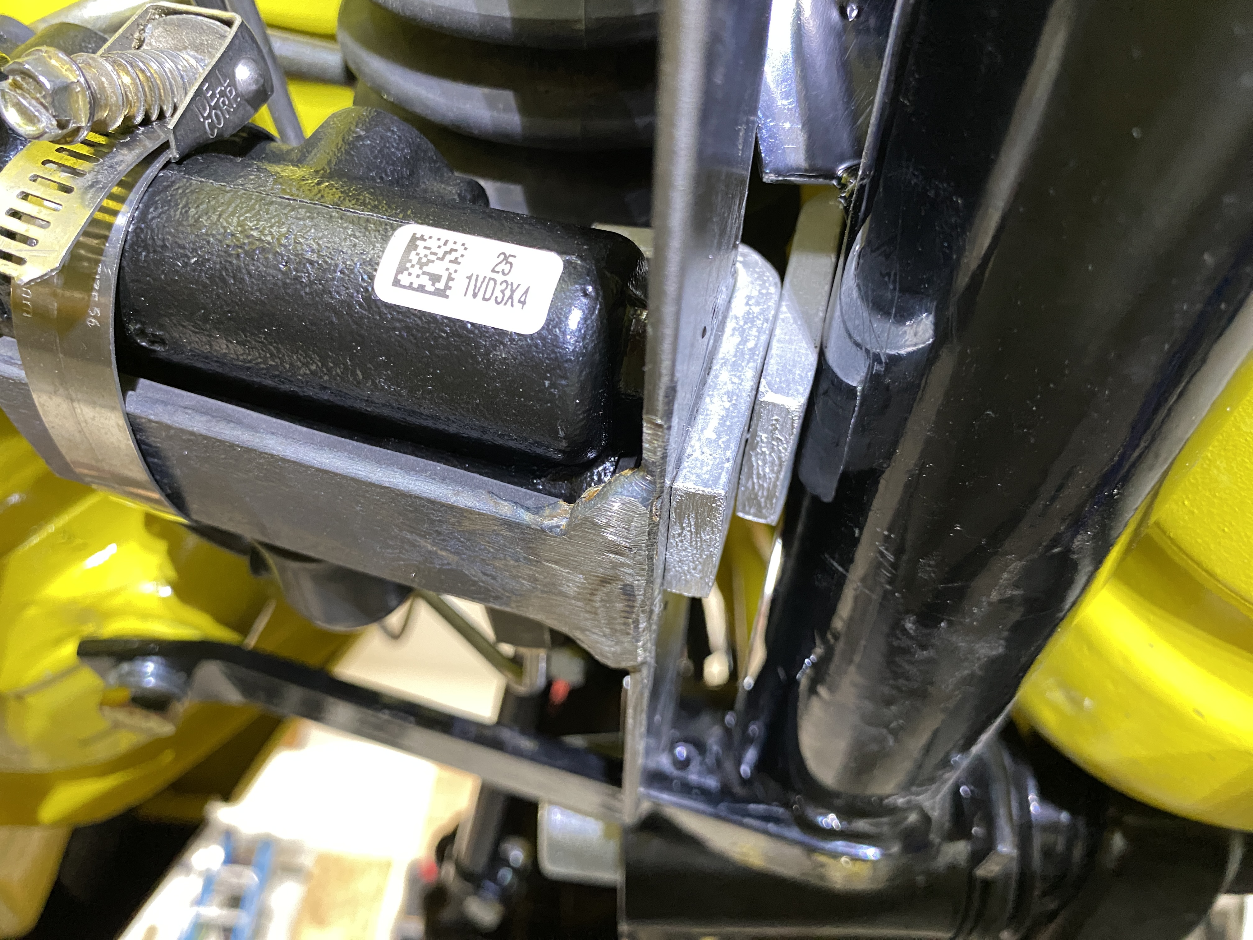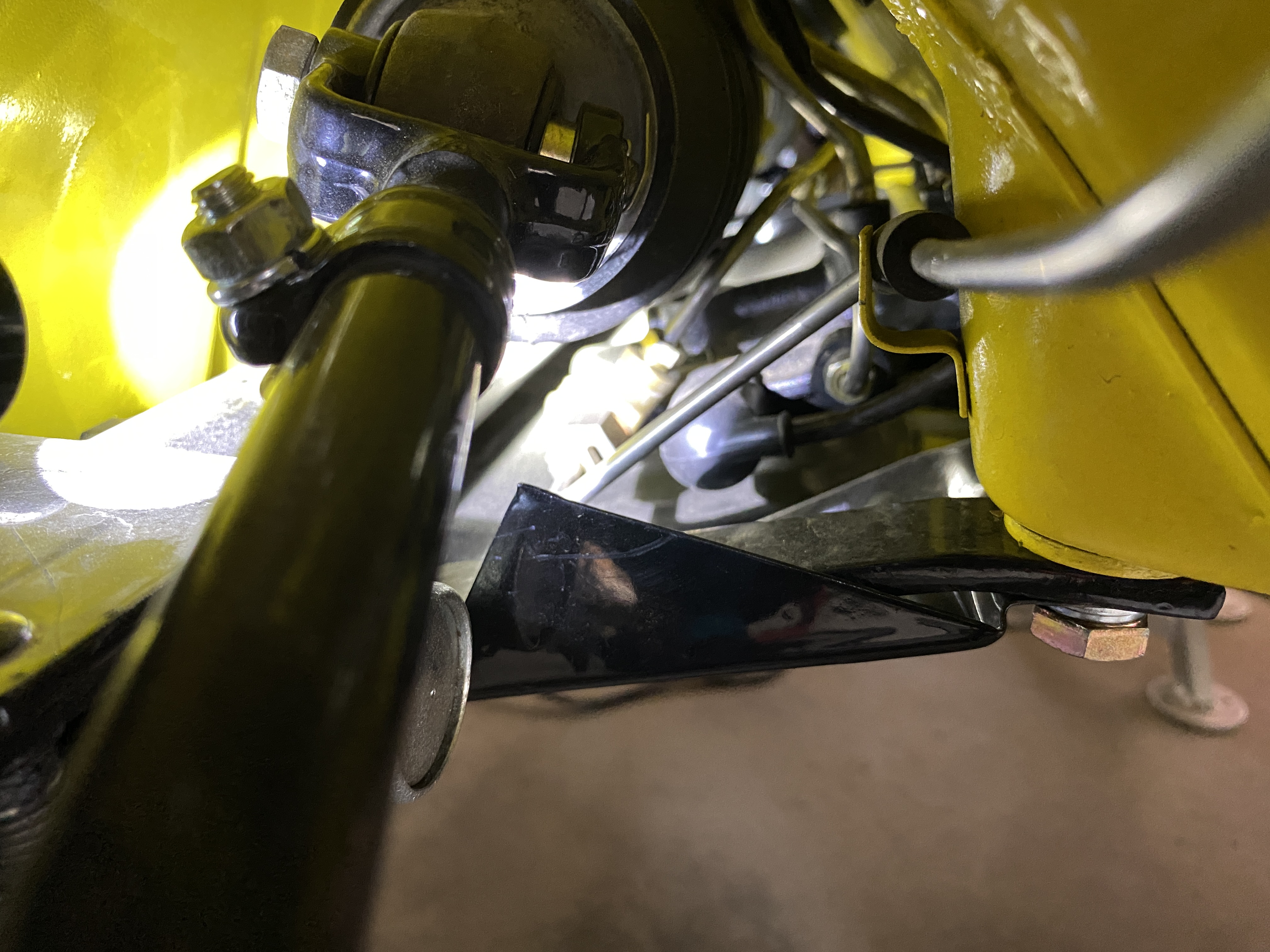 I know that people have applied different devices that brace the MC against the suspension cross tube. For fun, I tried to create something new. Here's my solution, a section of 1/8 x 1.5" bar, with a short bracket welded to it. I notched the bar to fit between the trailing braces on the cross tube.
