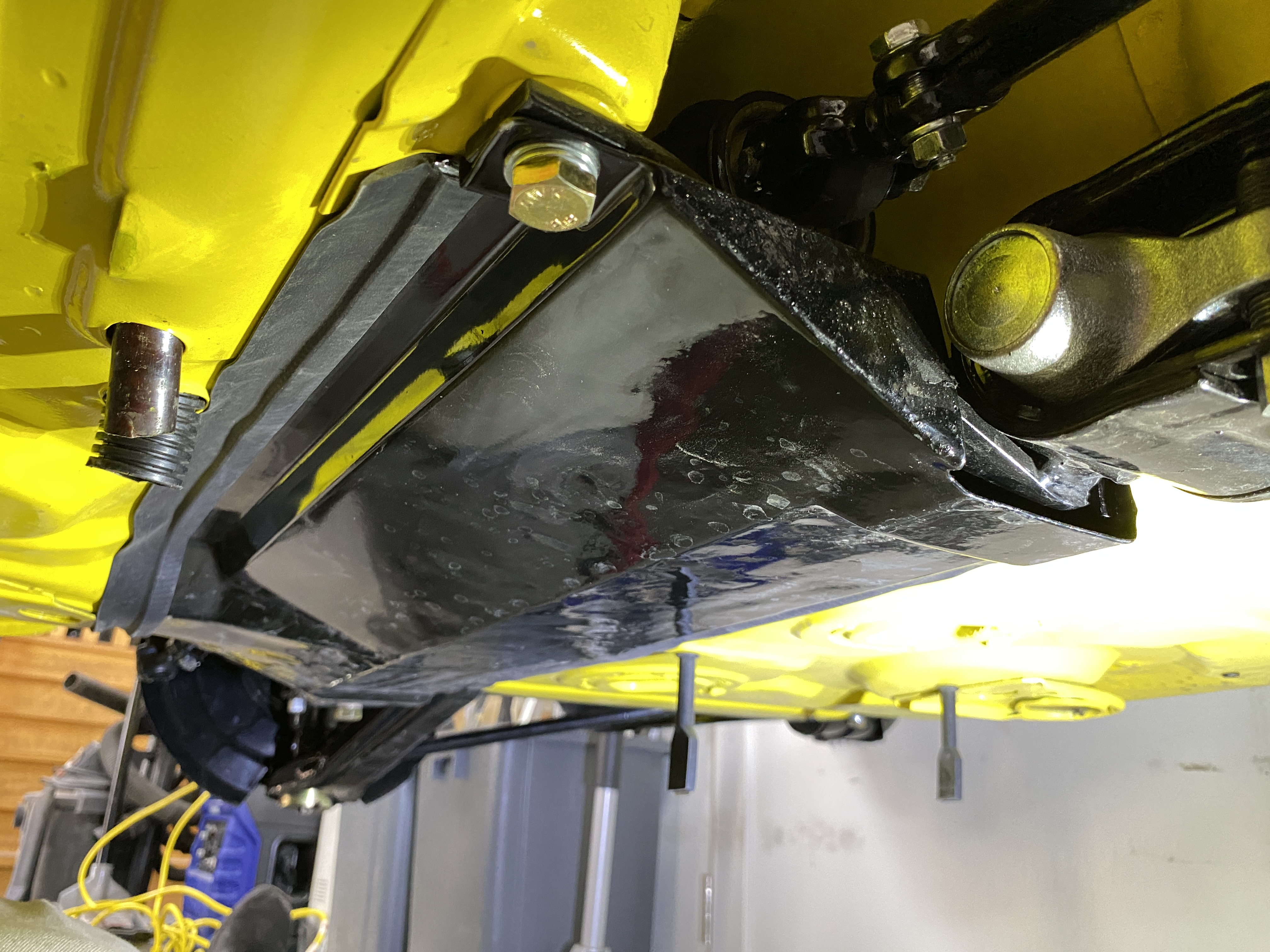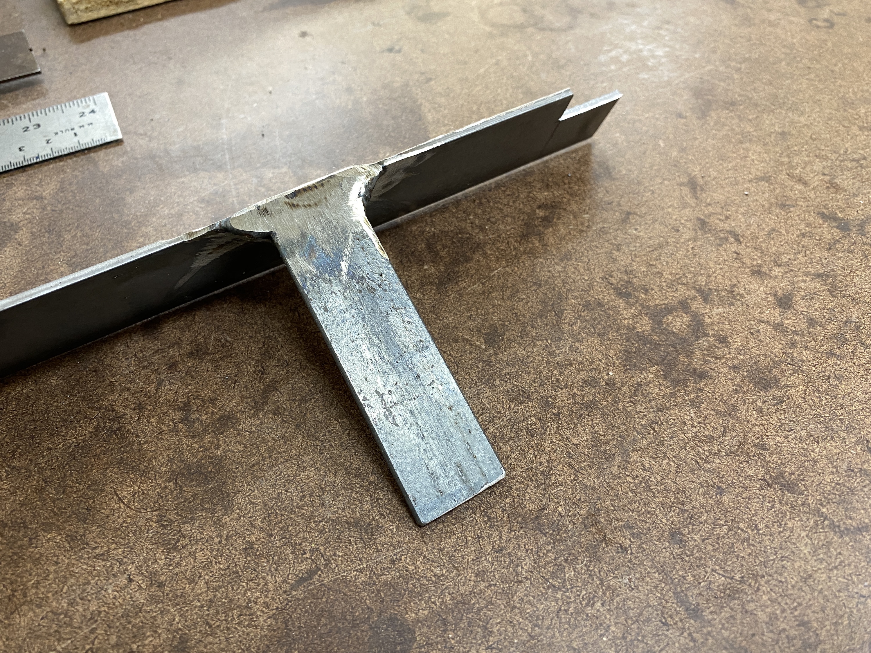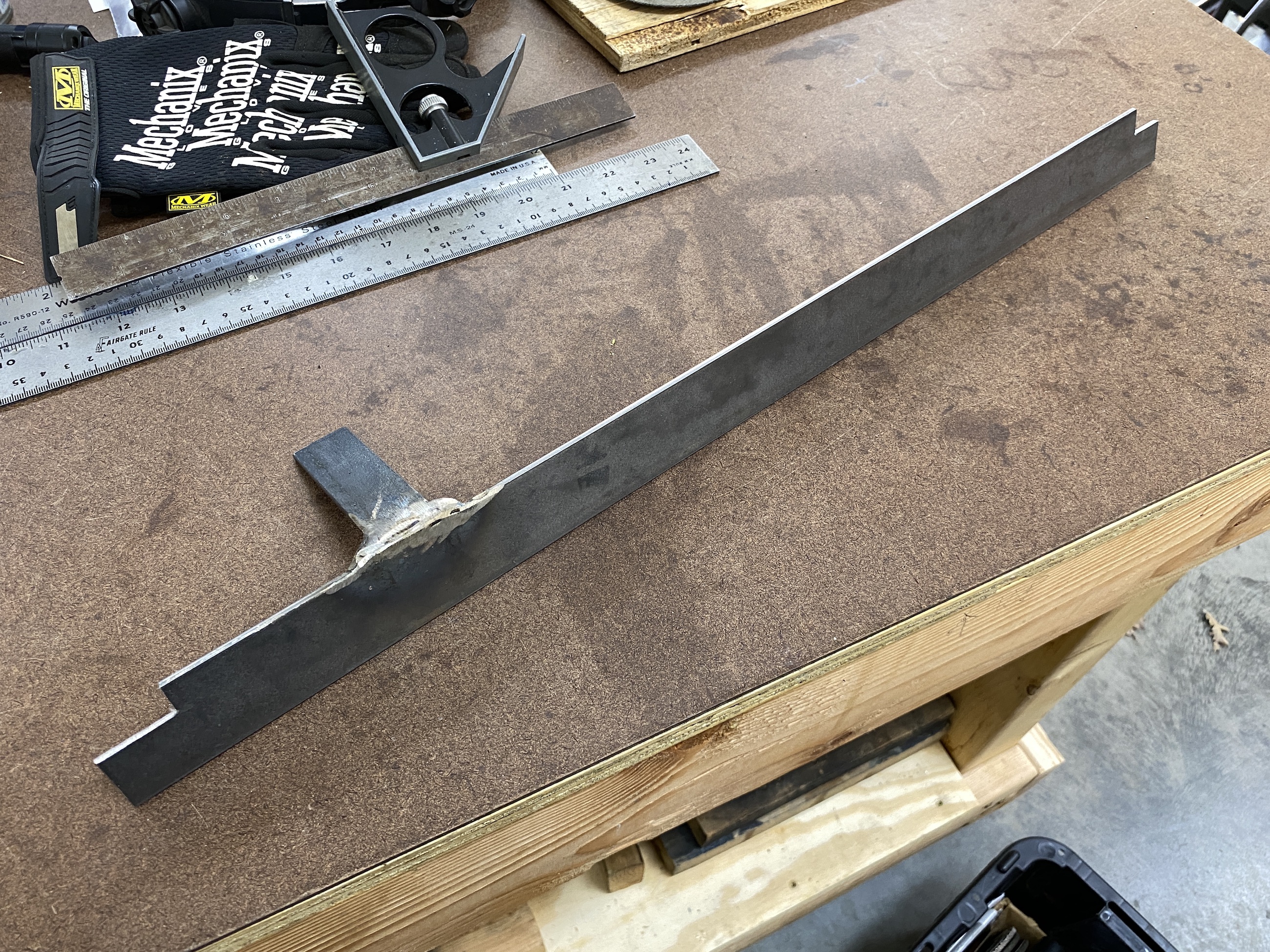 I know that people have applied different devices that brace the MC against the suspension cross tube. For fun, I tried to create something new. Here's my solution, a section of 1/8 x 1.5" bar, with a short bracket welded to it. I notched the bar to fit between the trailing braces on the cross tube.