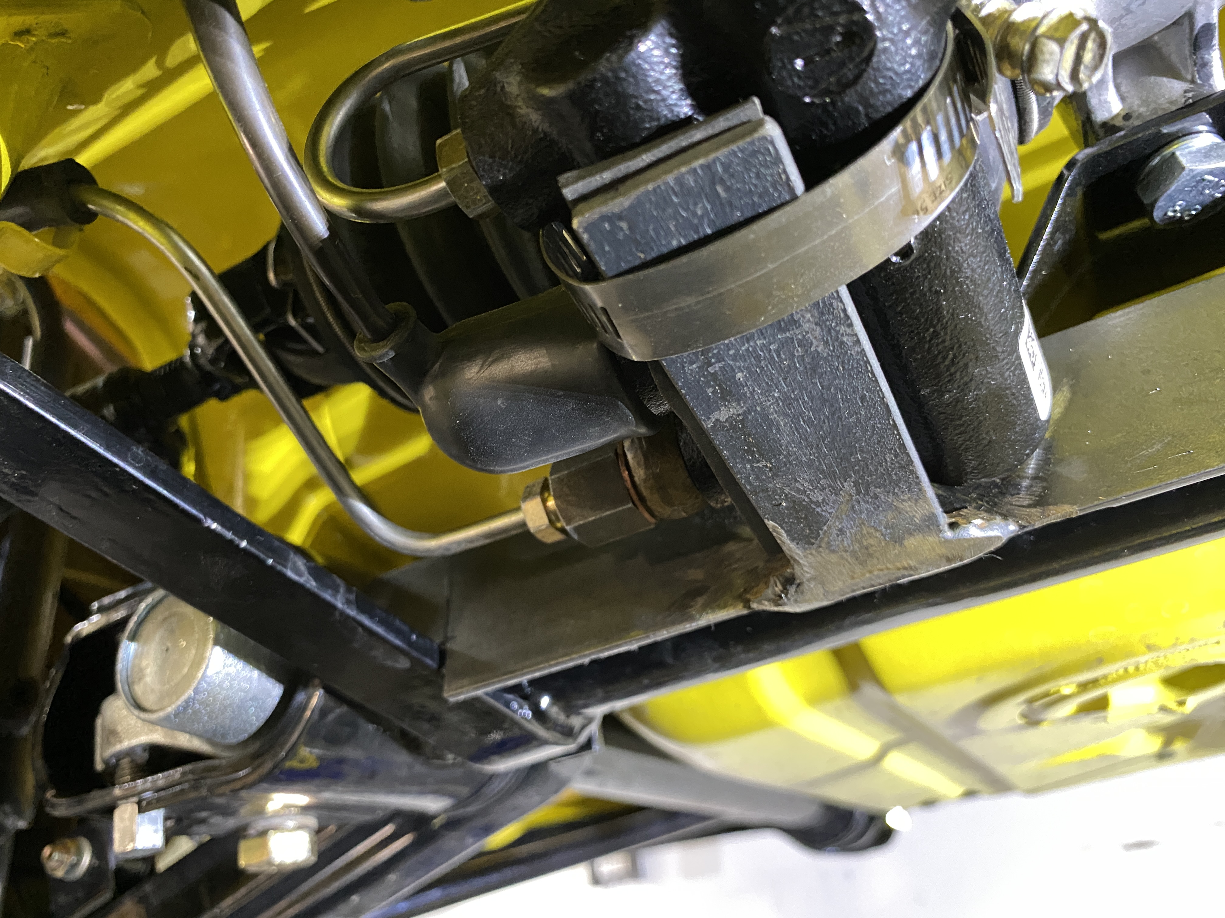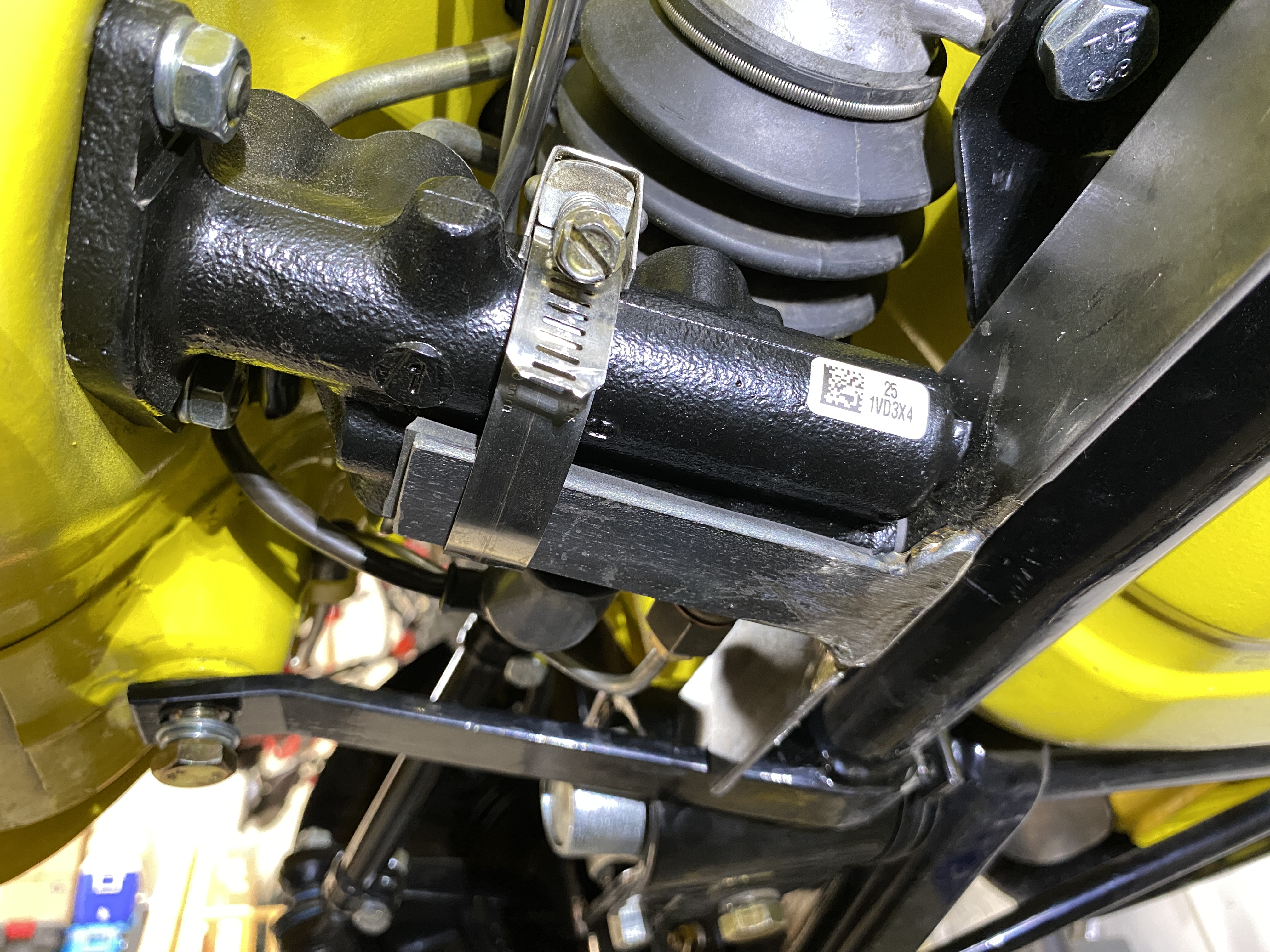 First installation. I know the hose clamp is a bit ghetto, but I want to see how it works. I used some 1/8" dense rubber sheet as a pad. The end of the MC sits in metal to metal contact on the new bracket.