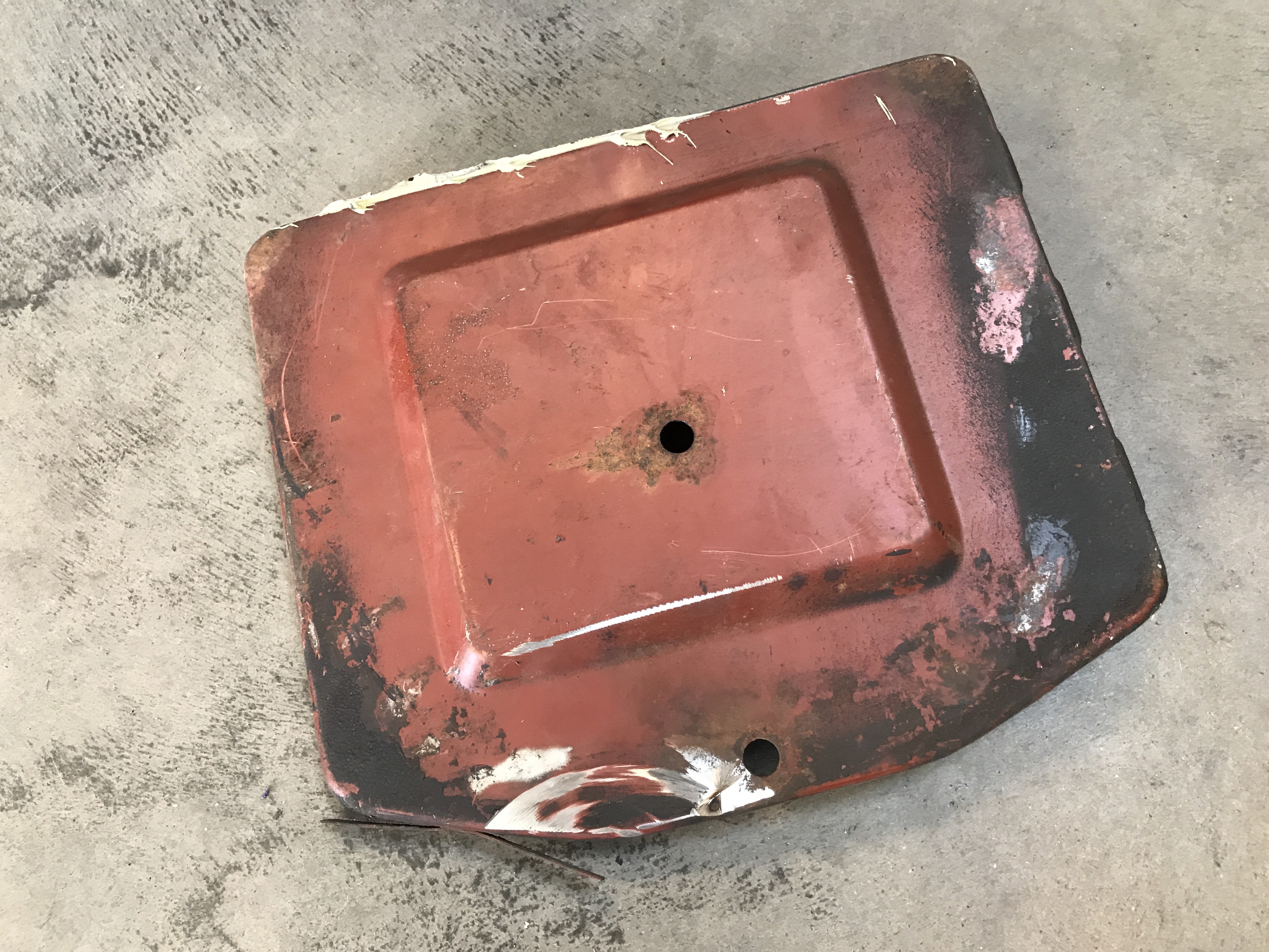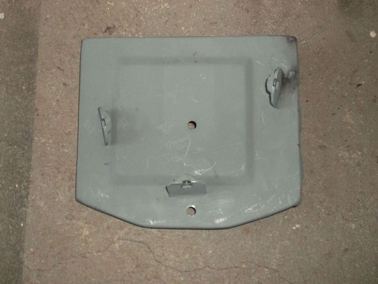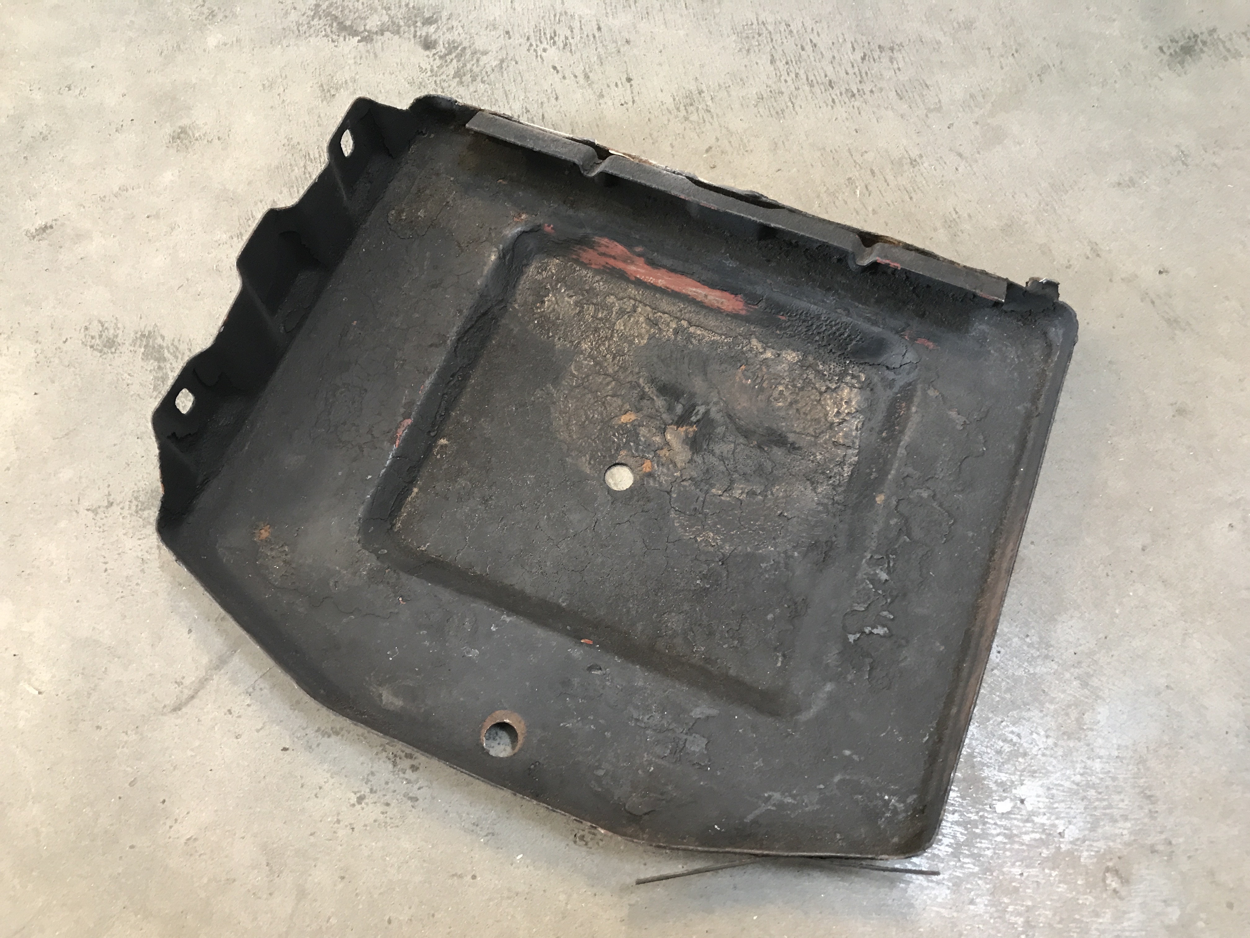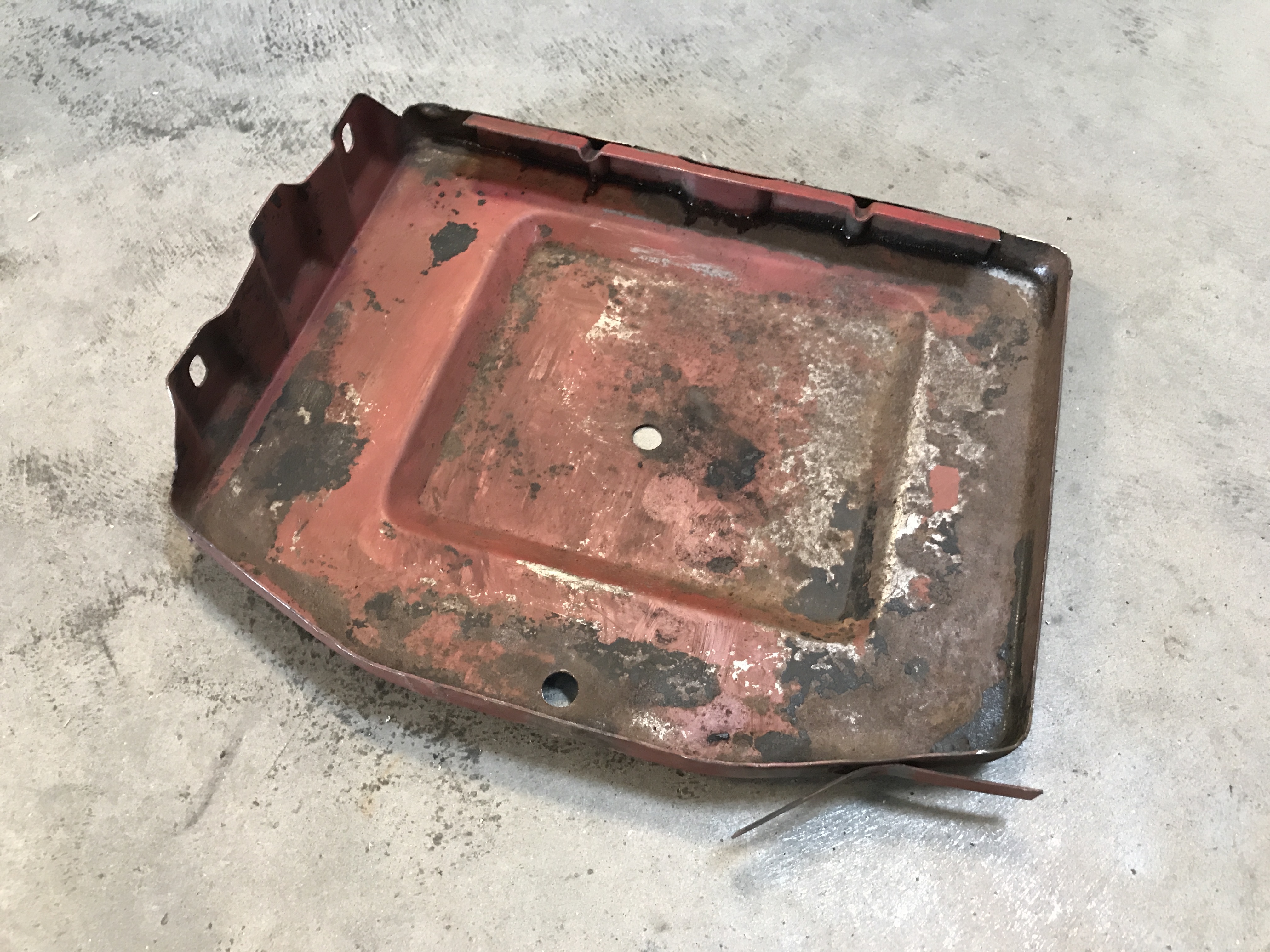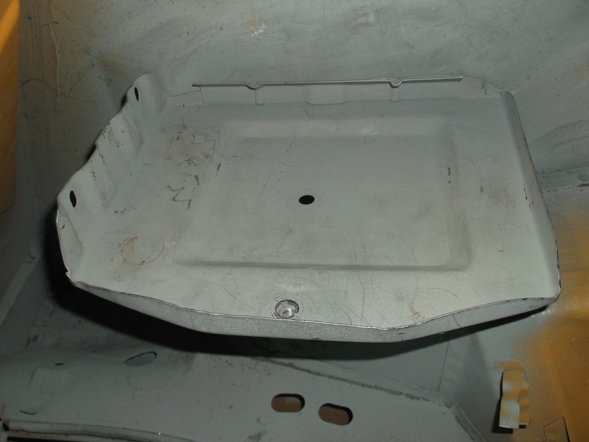 But first I pulled out the battery tray that was on the car. It had plenty of undercoating and other gunk, but the quality of the pressing, the presence of cable tabs, and the red primer makes me think this is a factory replacement part. Attached thumbnail(s) |