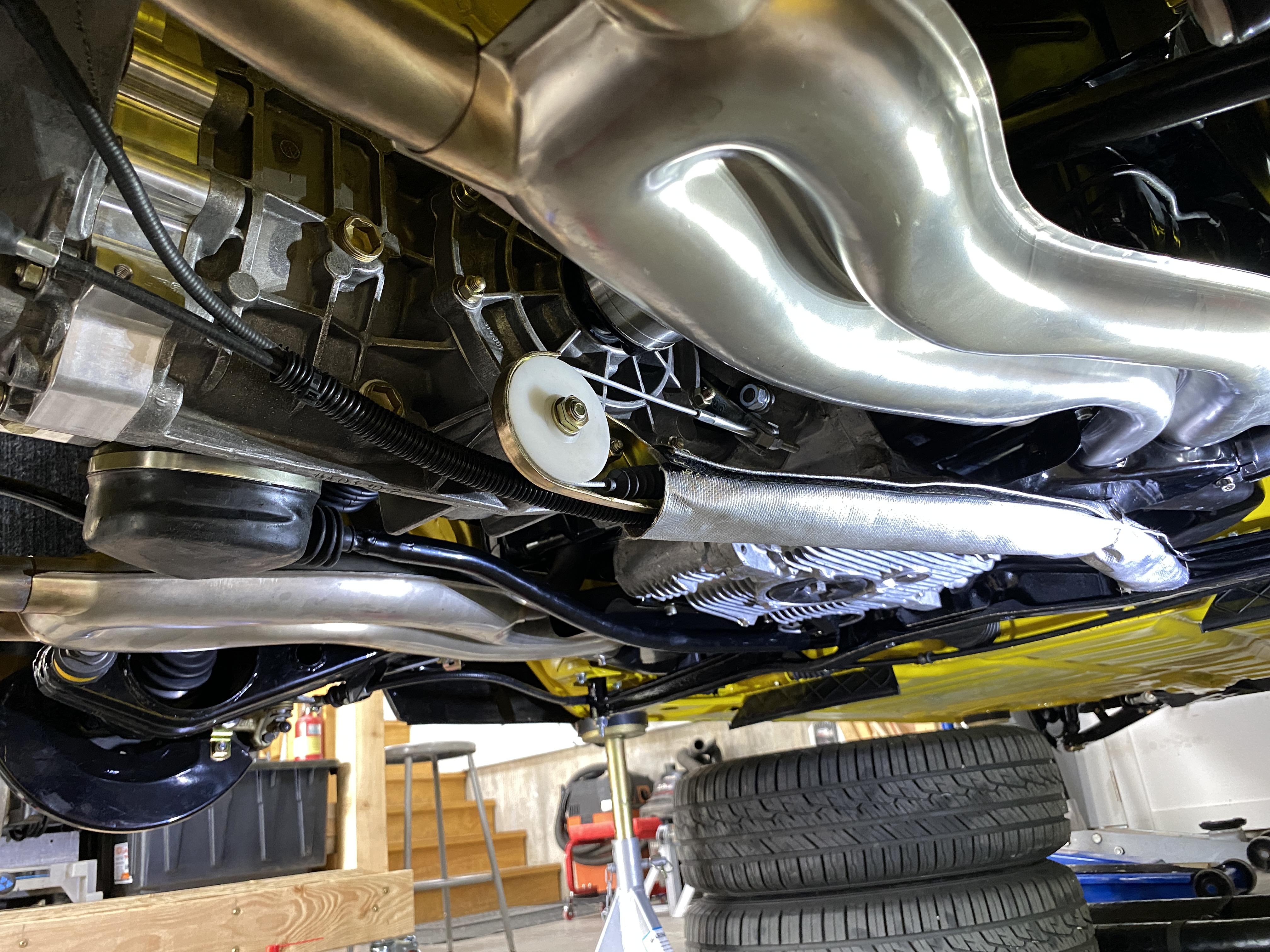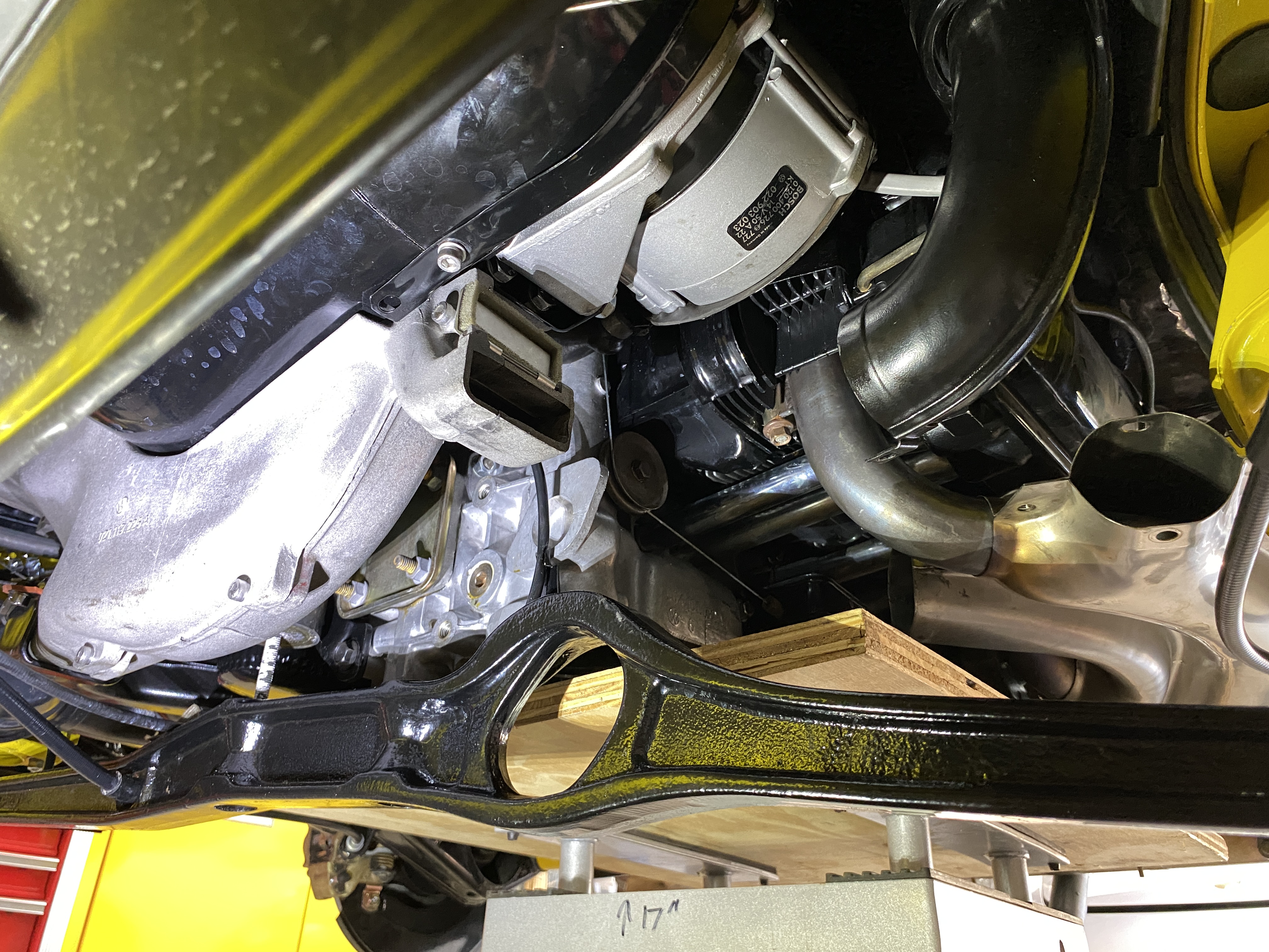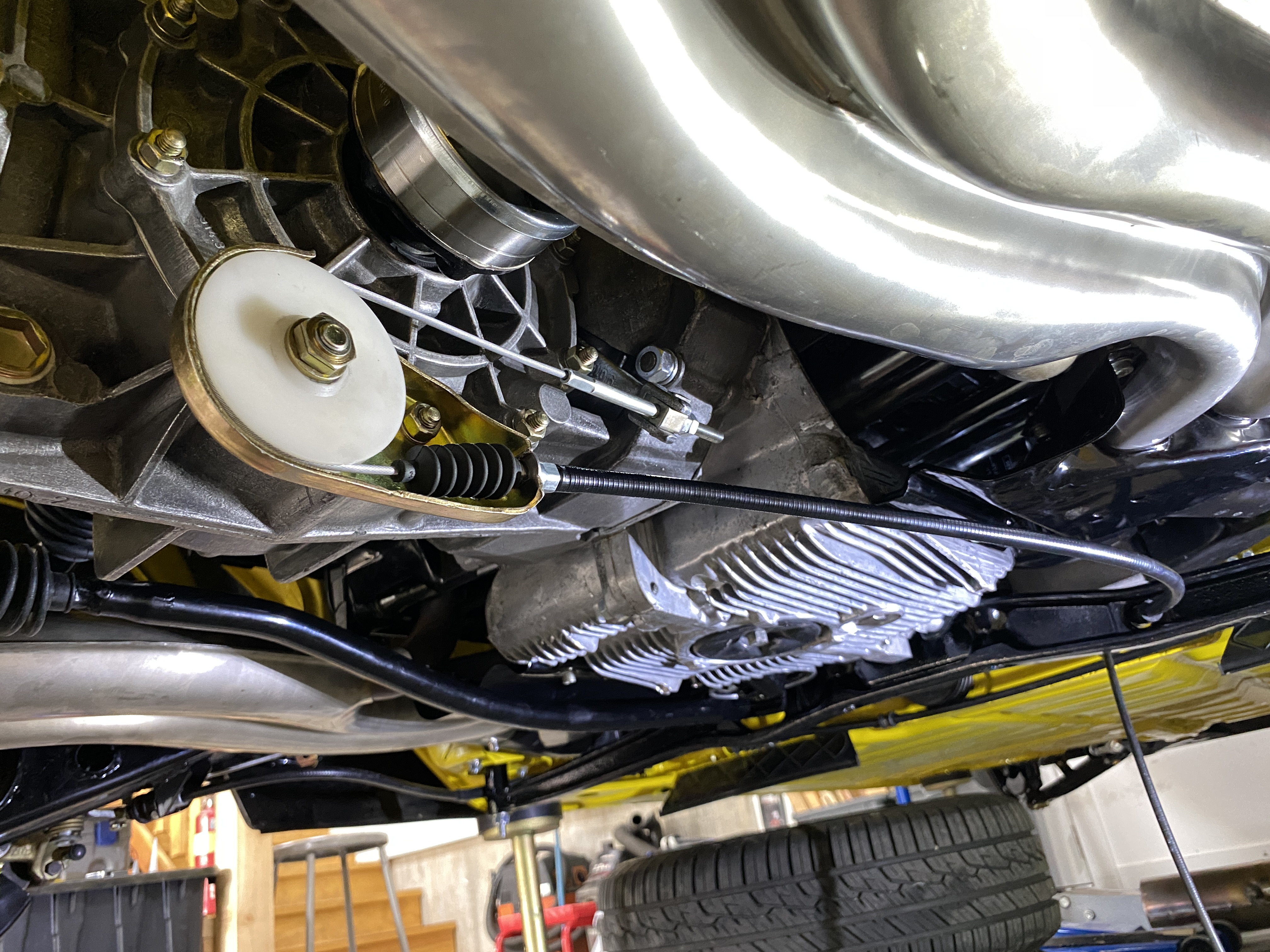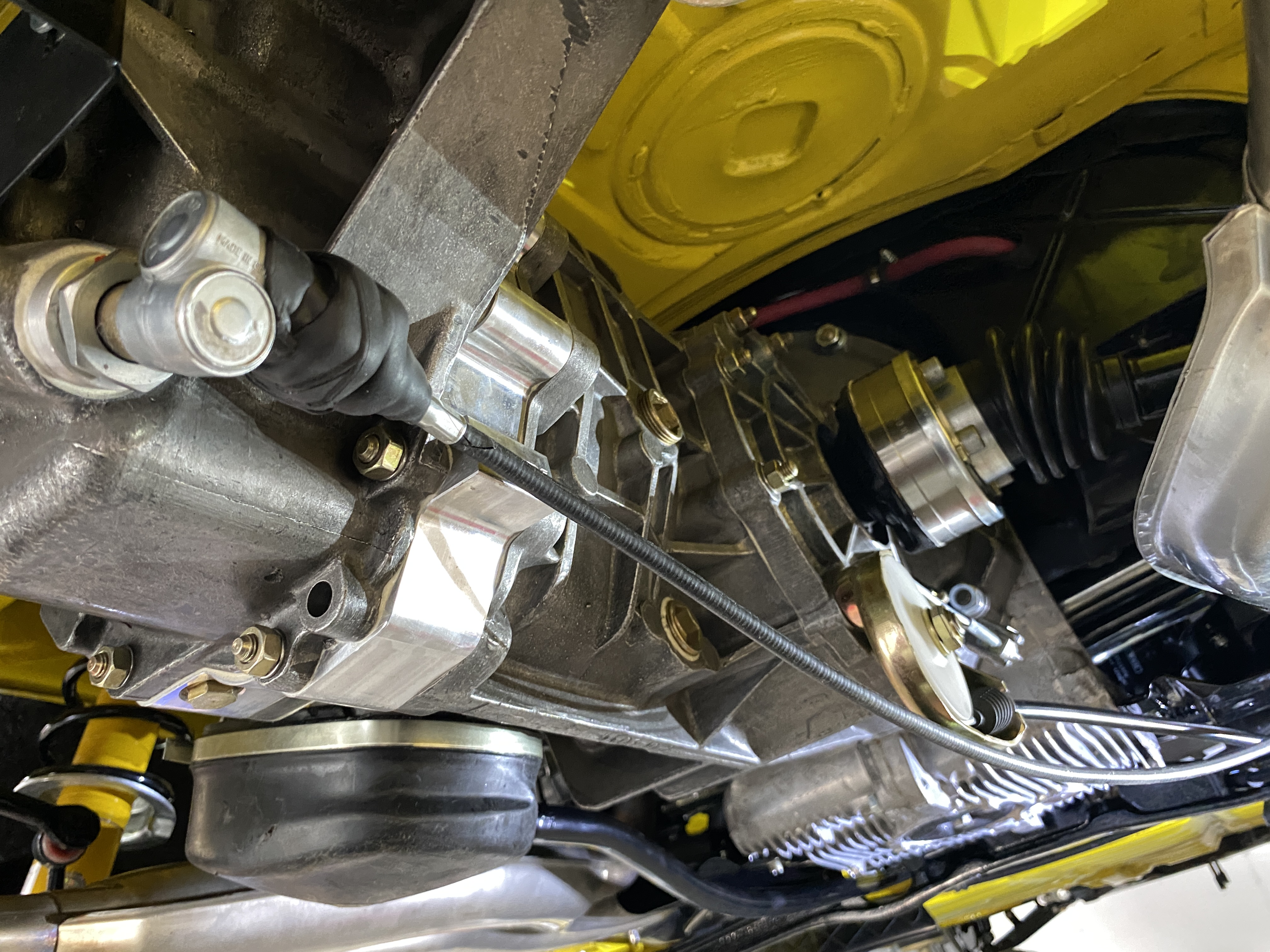 To do this, I removed the shift rod, all the heating ducts on the left side, the engine support cross bar, and the left front motor mount. At that point the access was not bad. (note the cross bar is still captured by the clutch cable) Attached thumbnail(s) |