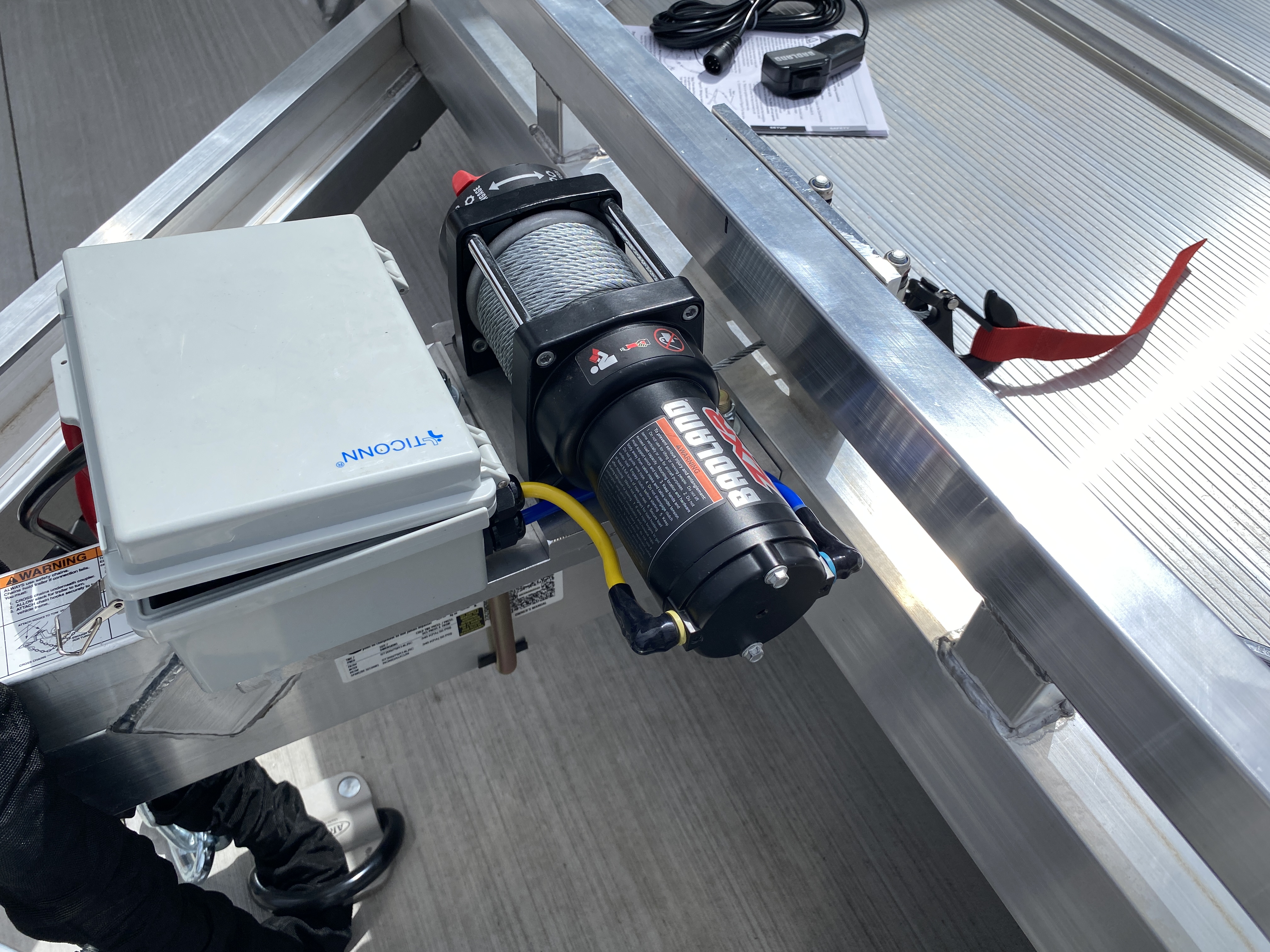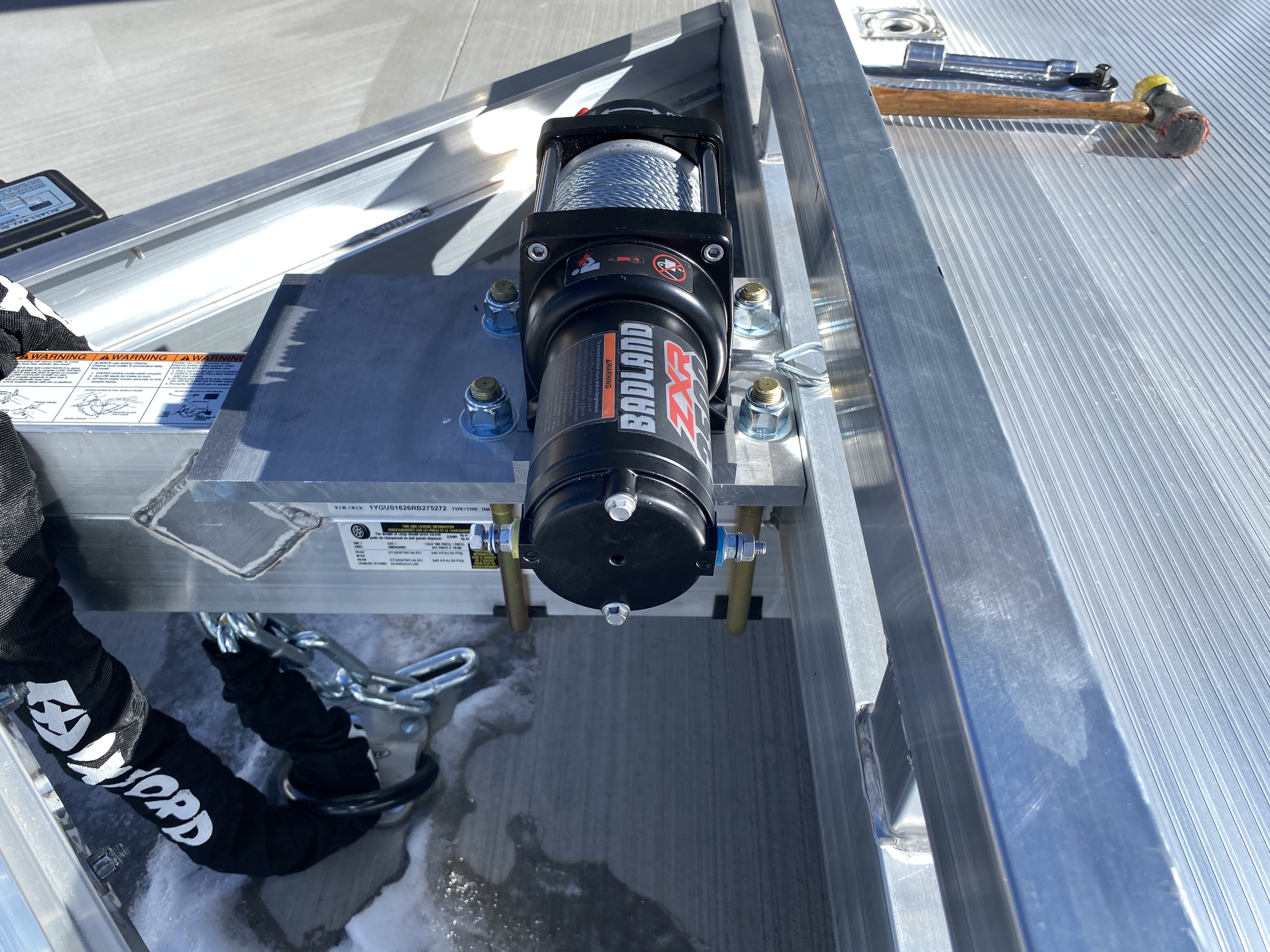 To make loading easier (including on my marriage) I added a 3500 lb winch. I installed this using a 5/8 inch thick aluminum plate. The winch bolts to the plate, and the plate is held to the main trailer member with some big square-end U-bolts.