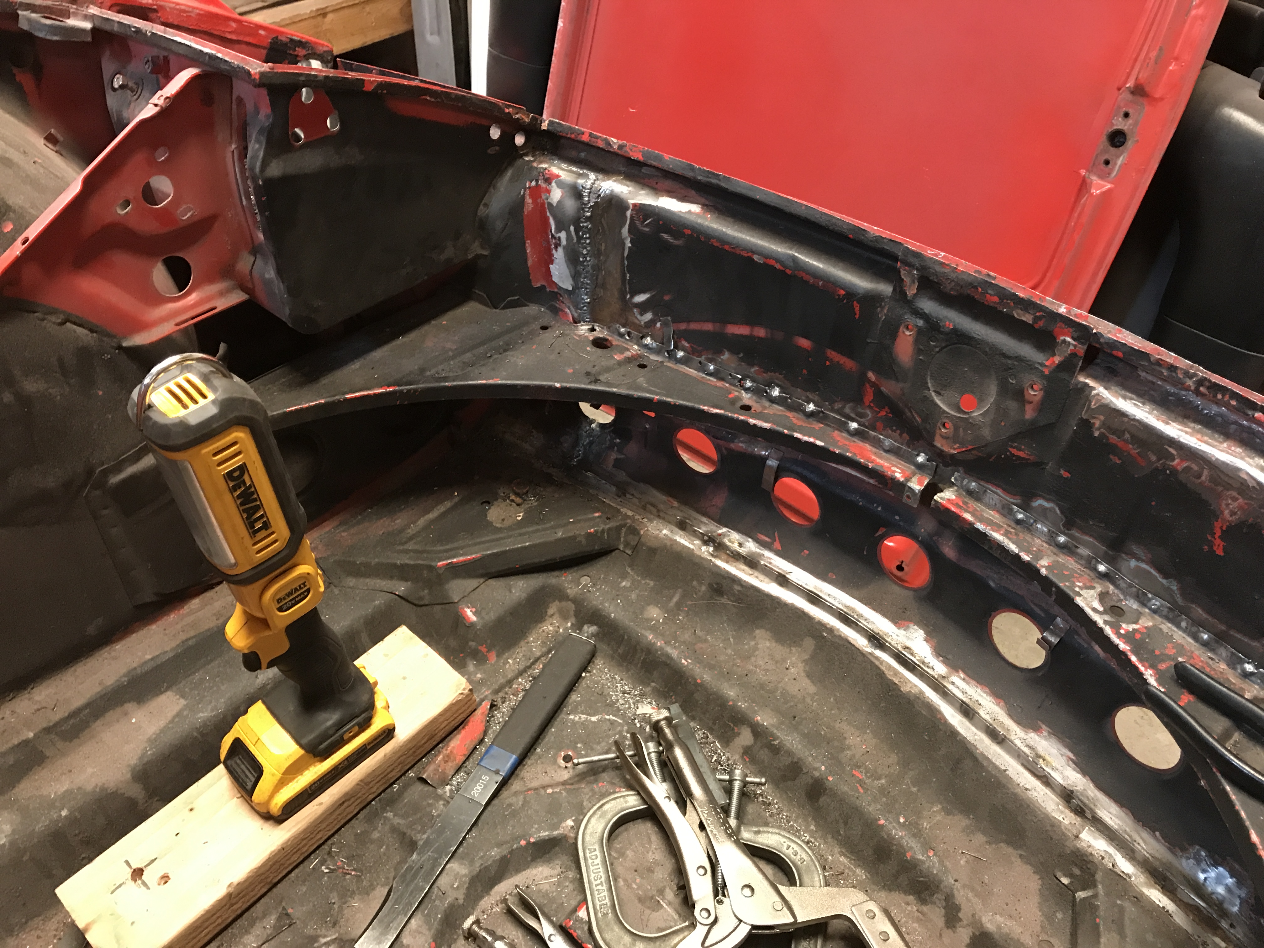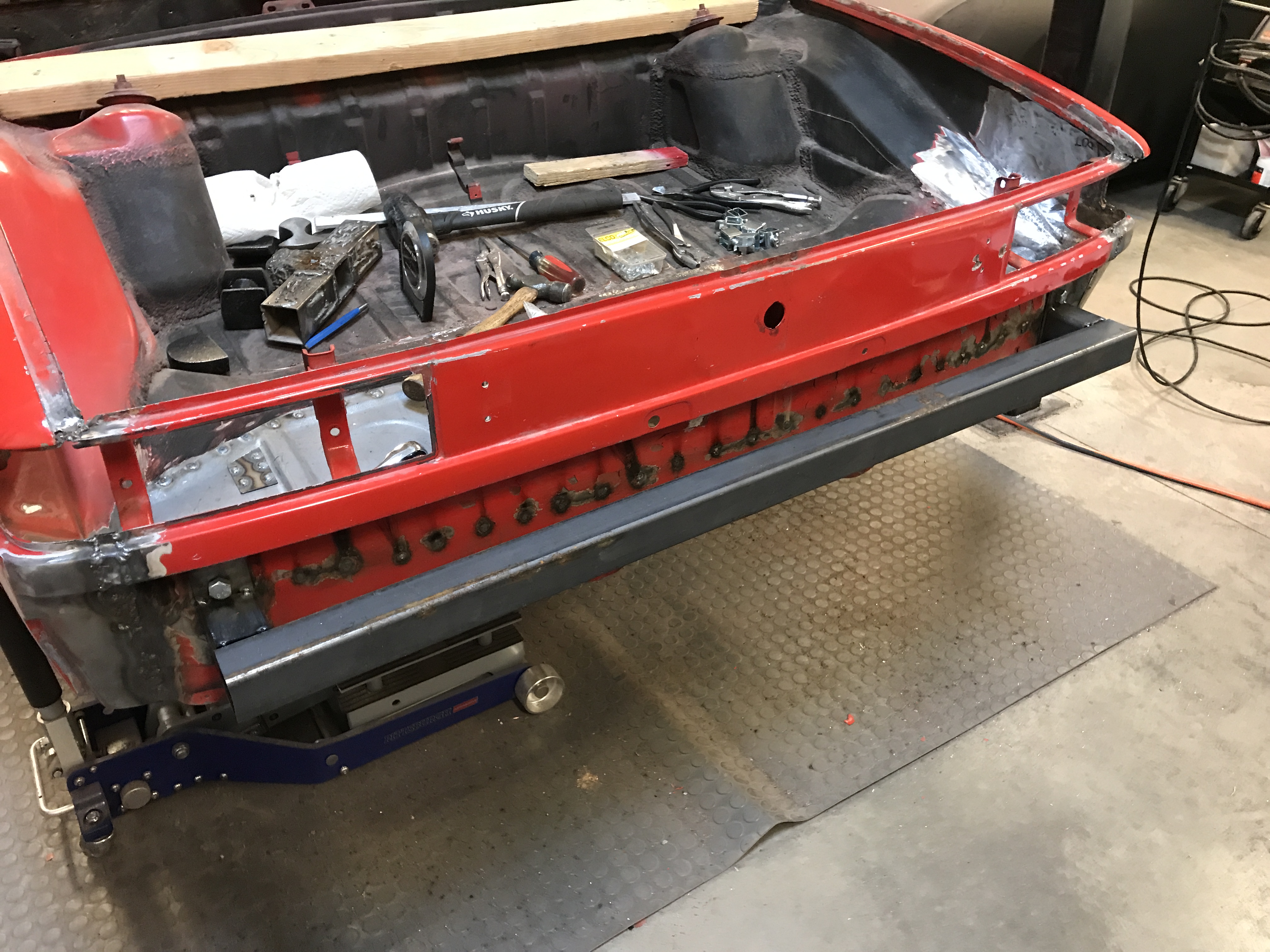 Got the trunk floor welded in, with plug welds all around, and some creative thick beads in the rear corners (these will get ground down).