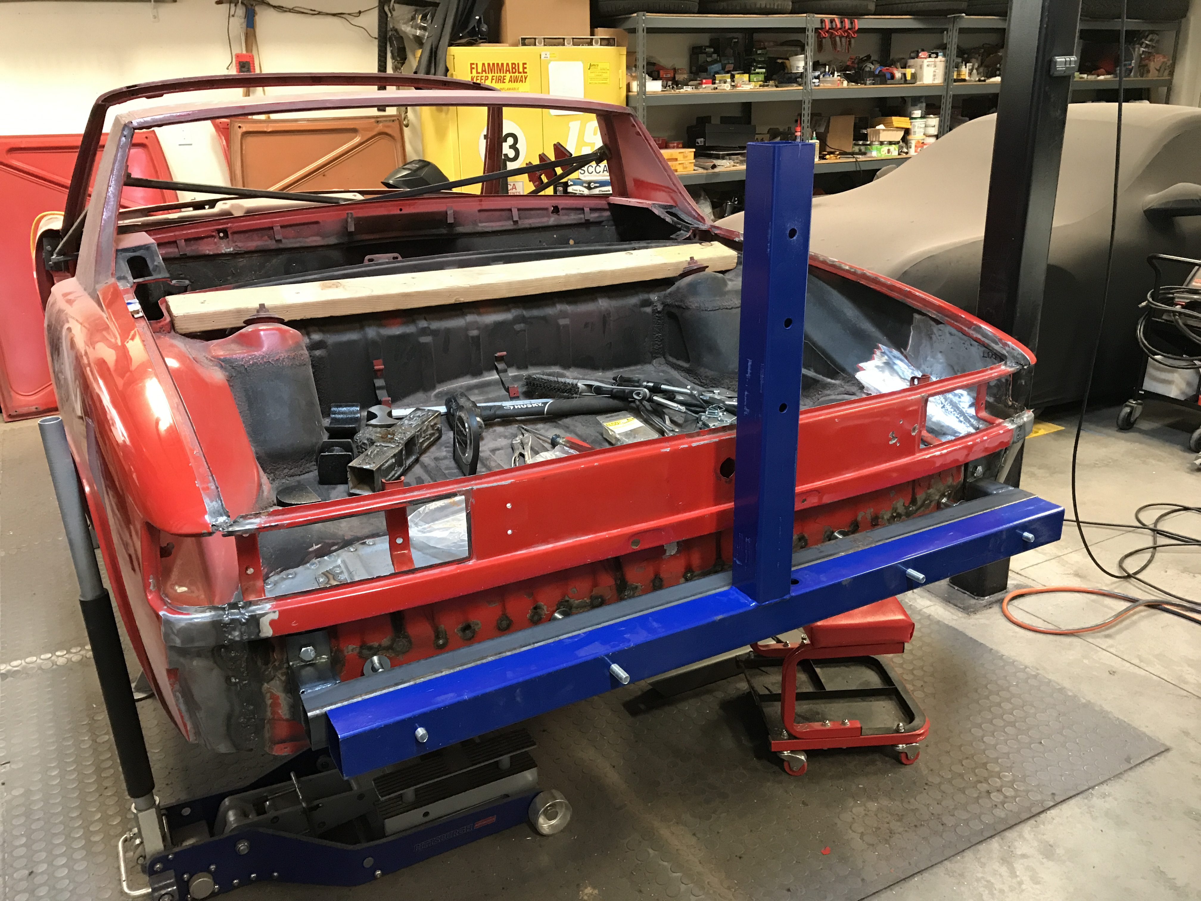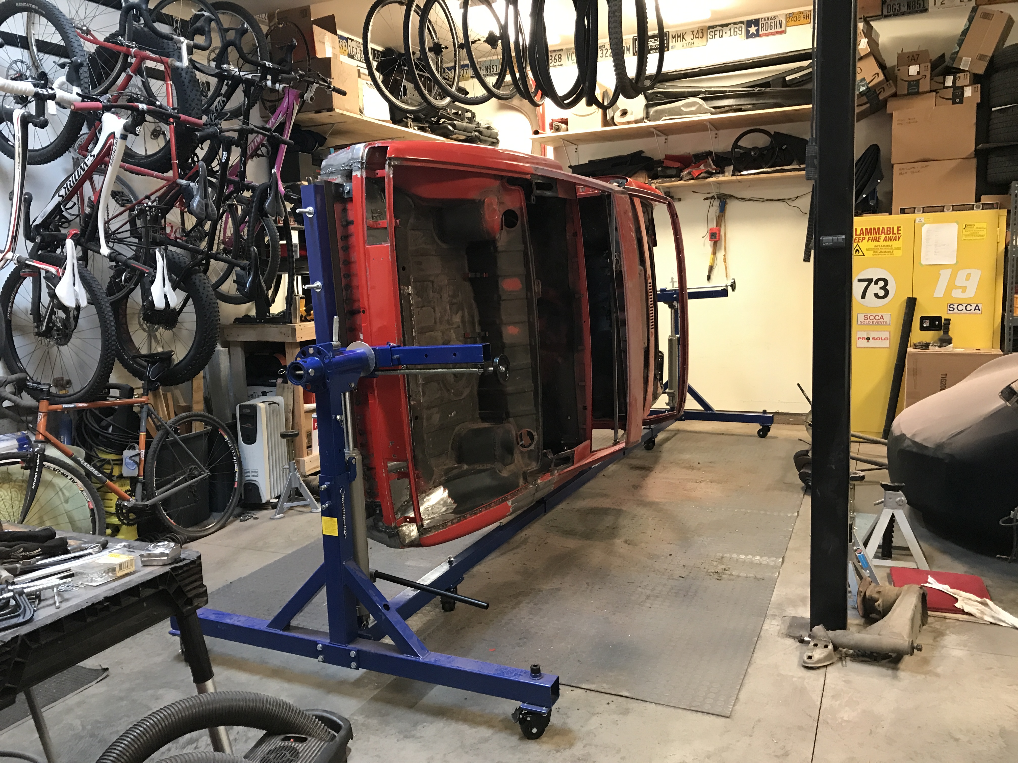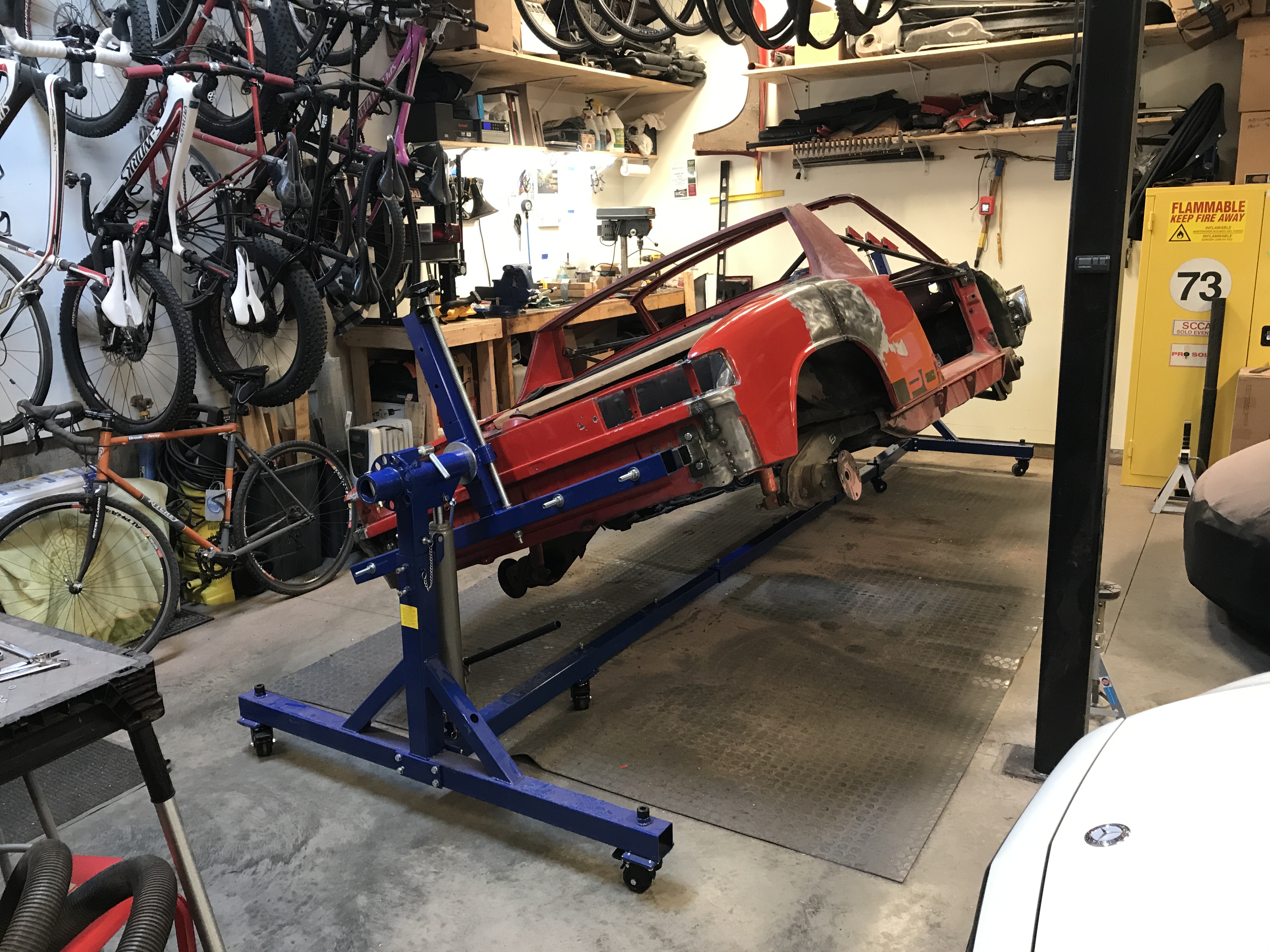 Finally! The car is on the rotisserie lift. This was the big milestone I hoped for, with my son visiting for 2 weeks. His willingness to help, and welding skills, made it possible.