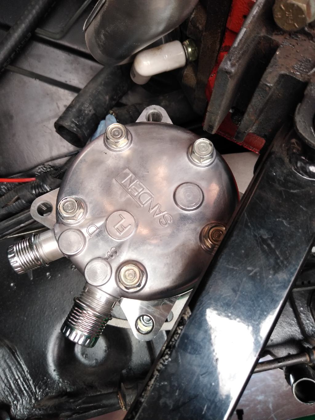 Then it was working on the business end. Here is the Sanden compressor with the mount finished and the new back on it for the rear hose connections.