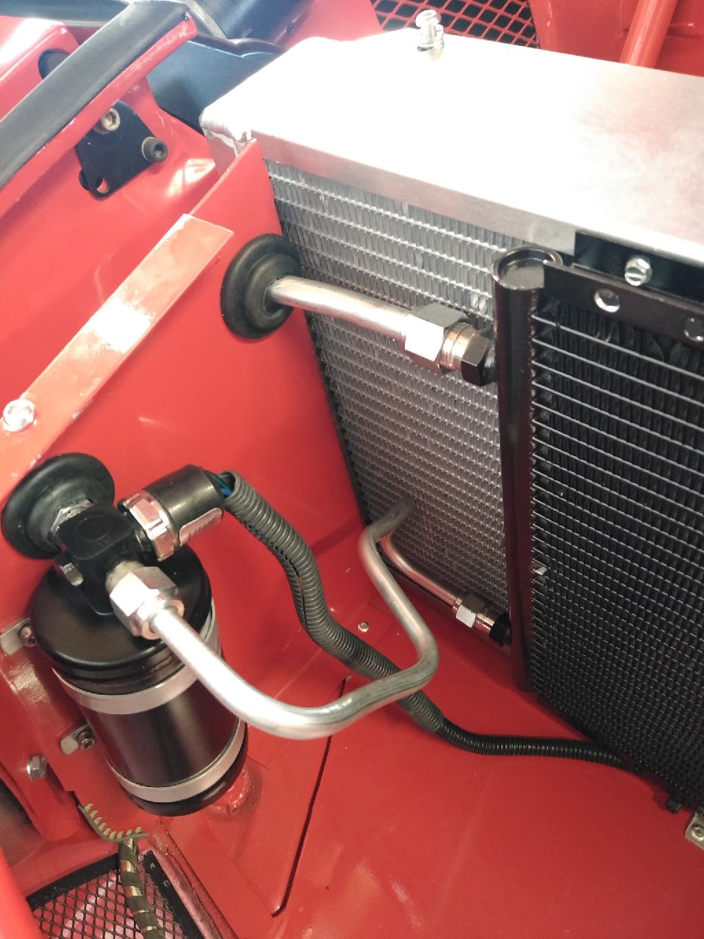Everything is a compromise right? I decided to go with the smaller condenser for a couple reasons. I didn't like the options I had for mounting the receiver/drier outside the current location; a lot of heat behind radiator and no room inside the cabin. The condenser is a high efficiency one, so not overly concerned with its ability to cool the small interior. I have heard of many people having issues keeping their V8 engines cool, and I have never had a problem. Hopefully this won't be the start of any (IMG:style_emoticons/default/idea.gif) |