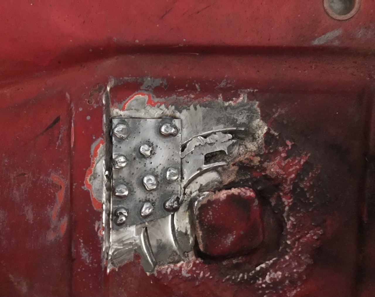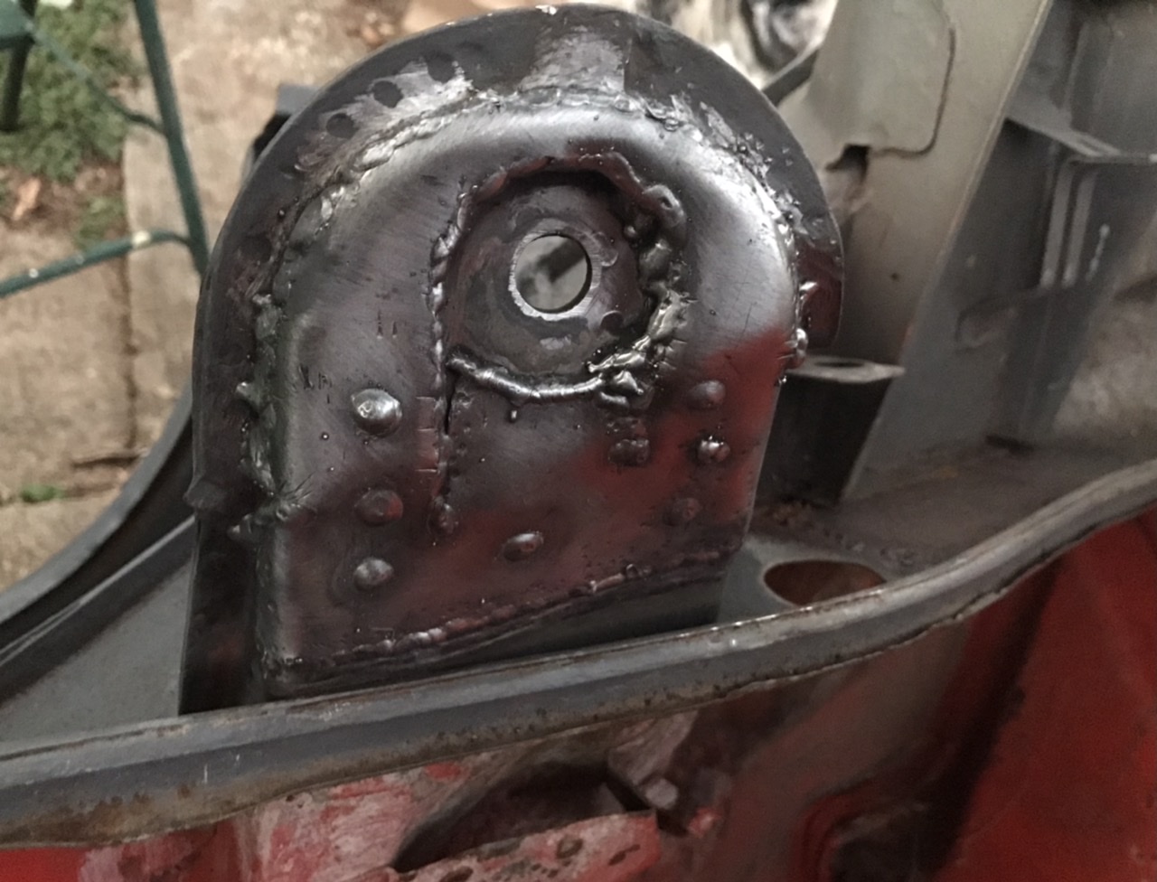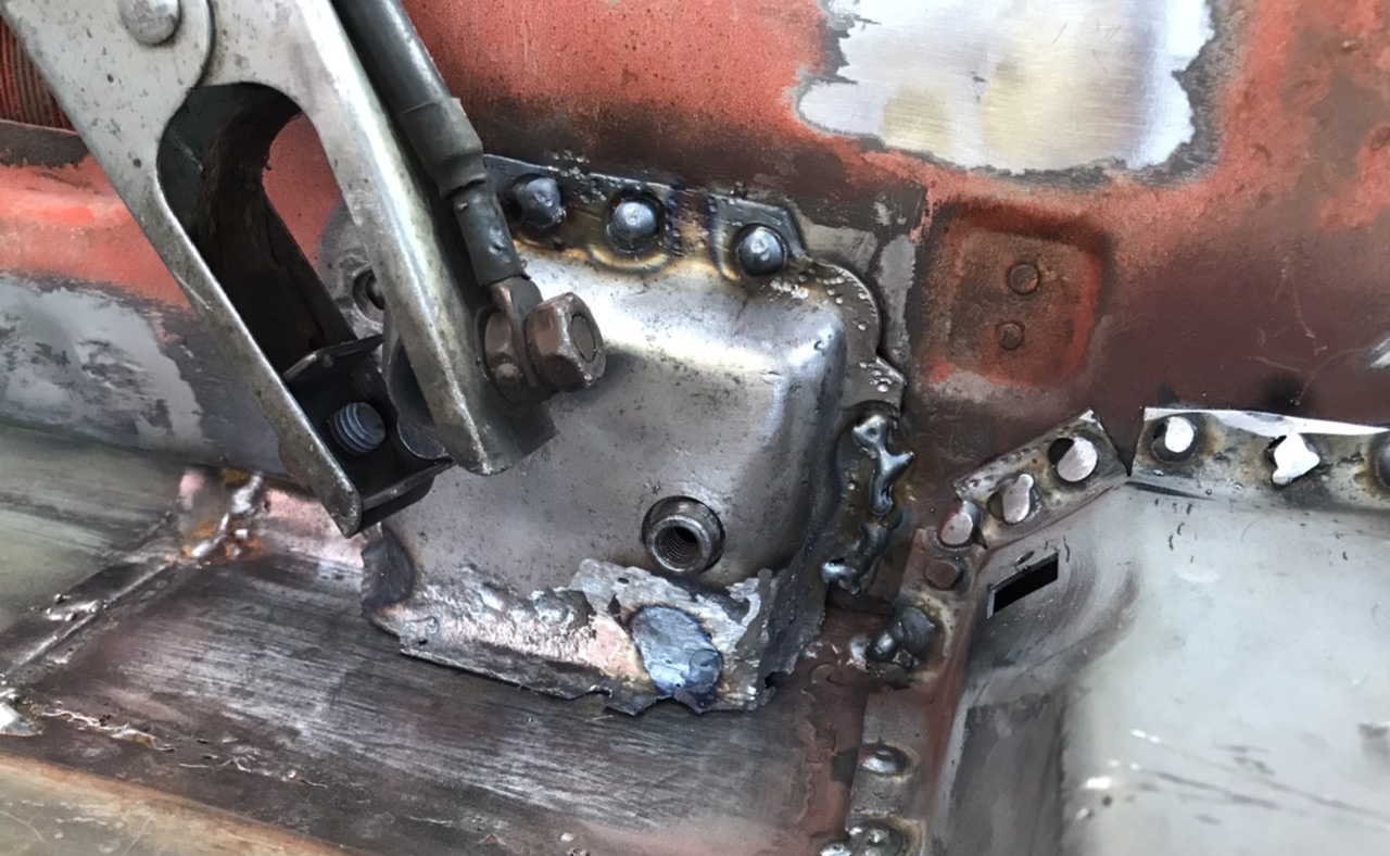 The top of the original bracket was easily accessed from my port but I needed to drill a couple holes and plug weld the bottom from the outside: