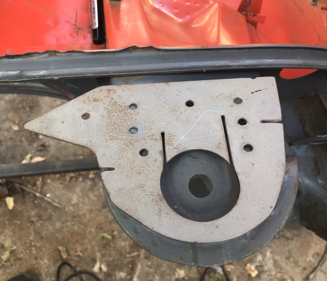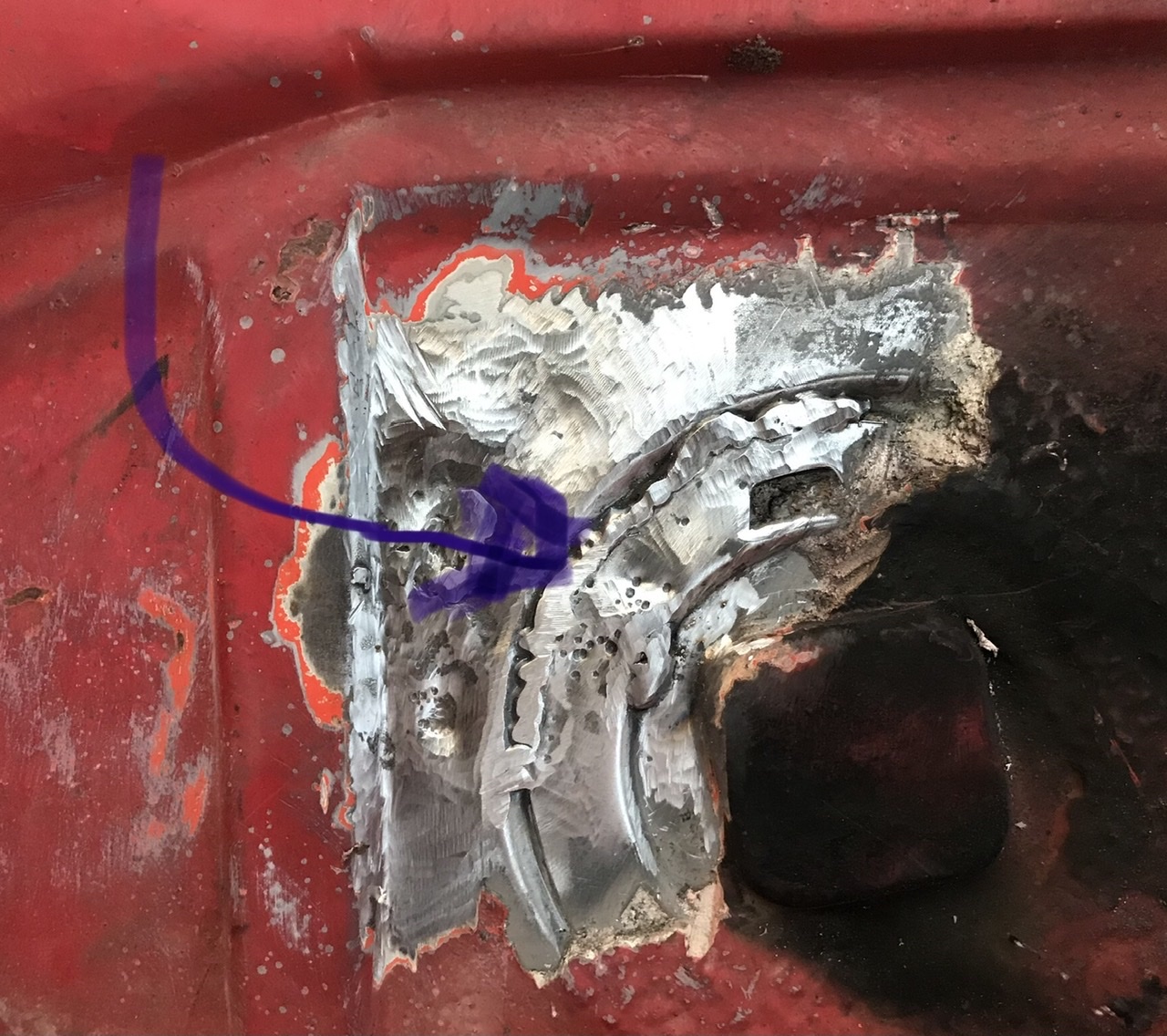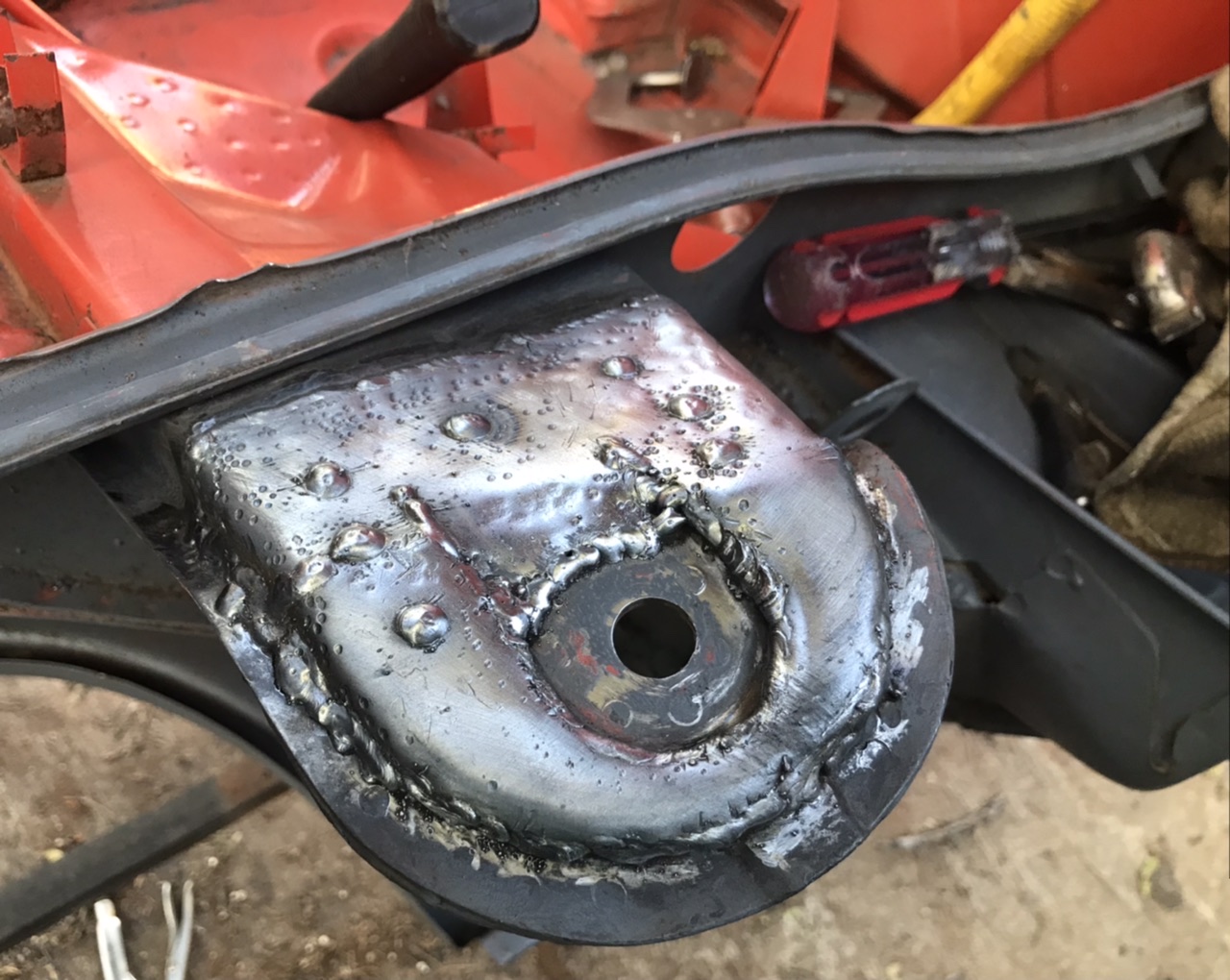 Before making the welds though, I needed to weld the circular “factory access caps” so that they would not shift under hard cornering (the brackets I welded underneath are welded over the seam slightly), and not create a crack in the mount’s attachment welds. Highlighted with purple arrow: