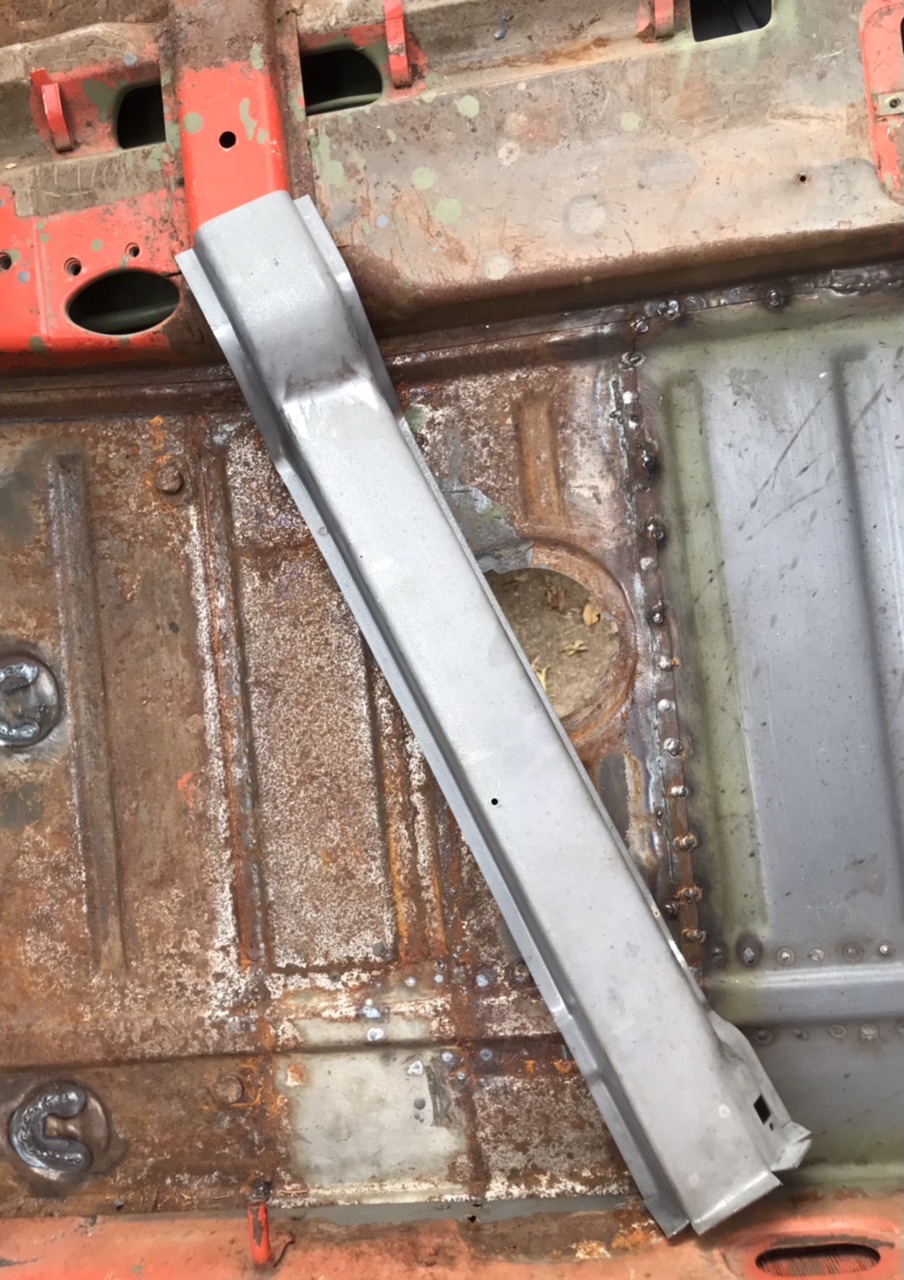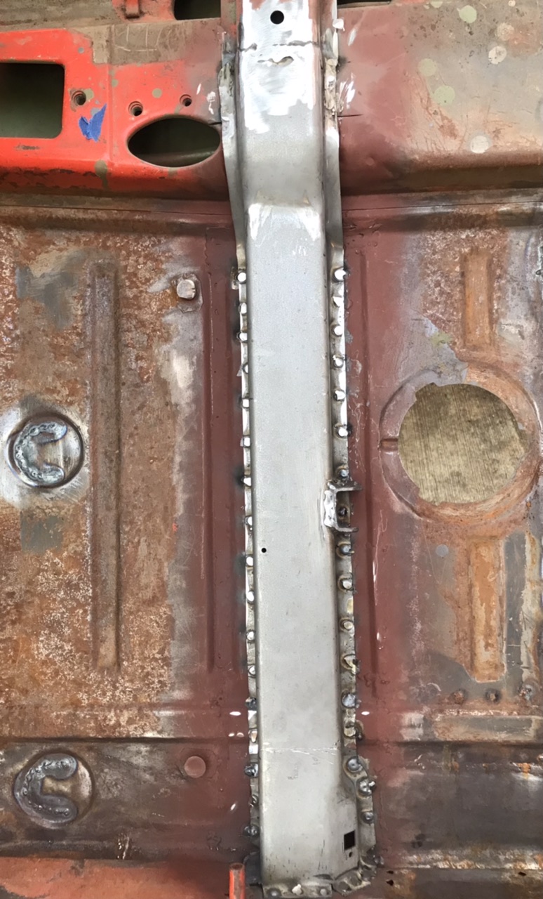 I cleaned the metal up real good, and primed the metal after laying tape at the weld spots.. and then welded on the seat adjuster bracket holder that I saved from the old cross-member. I finished welding this new unit in place but it got too dark for a good pic: