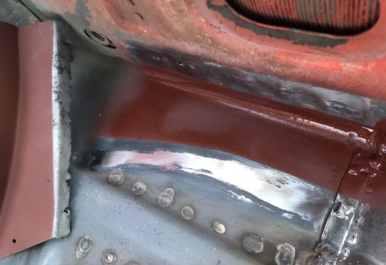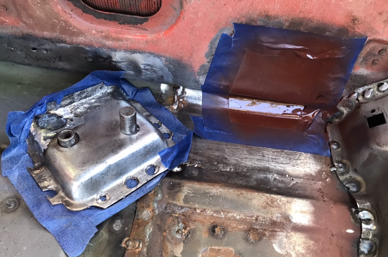 Parking Brake mount went back on today. It was in good enough condition that I recycled it. I sprayed a protective coating on the backside and on the inner long side too: