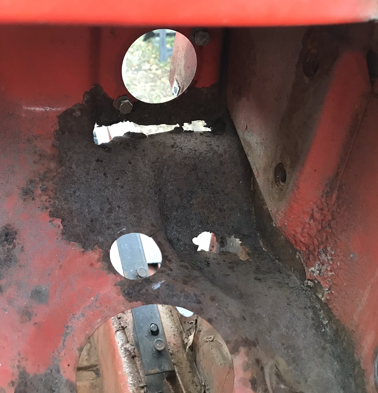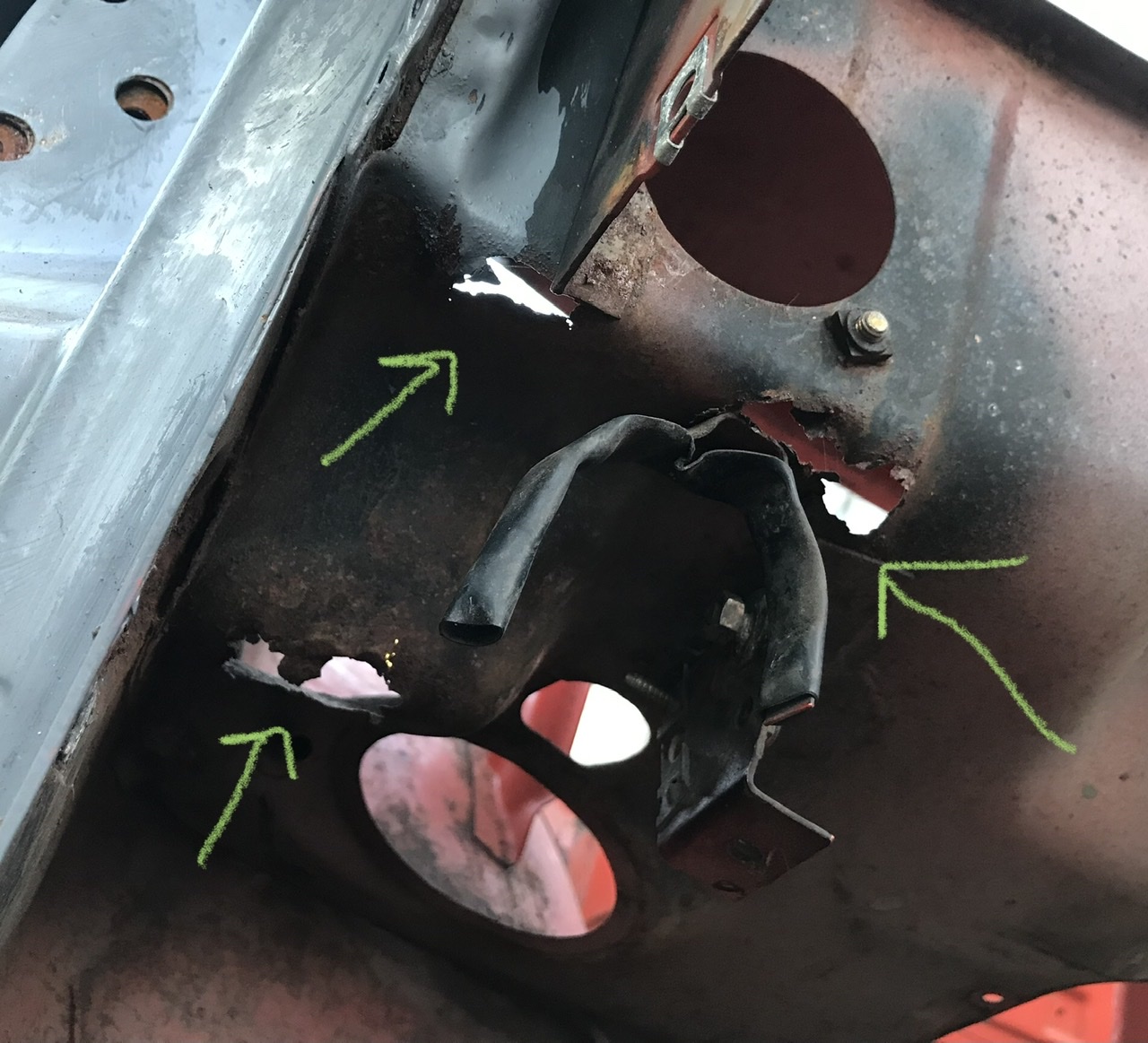 Next on the agenda is to repair the rusted out area that the frunk handle pull mounts to.. under the dash on the driver’s side. I made this repair over a few days work. First picture highlights the rusted out holes, but the area in between was pitted and thin so I opted to cut a large area out: