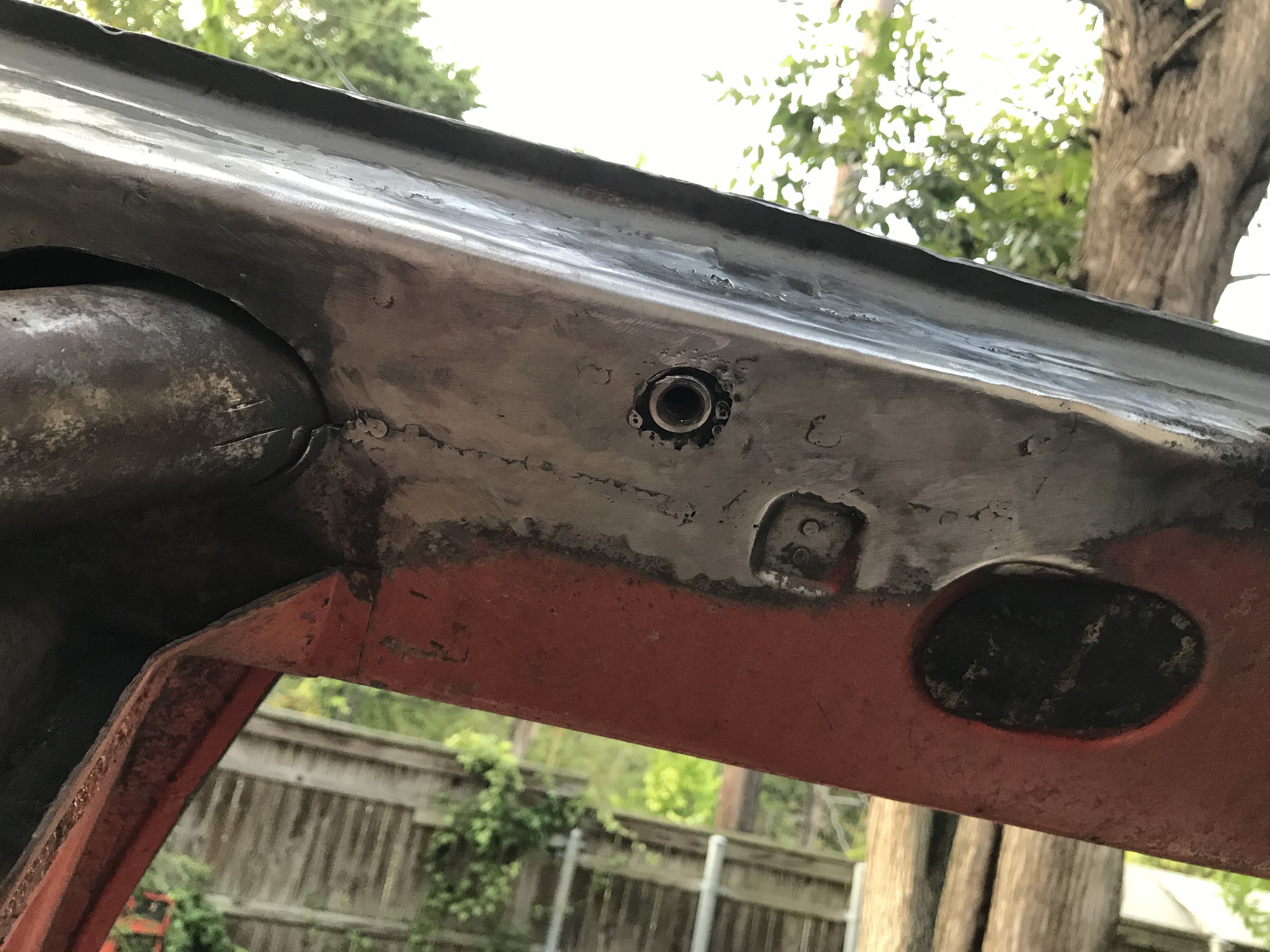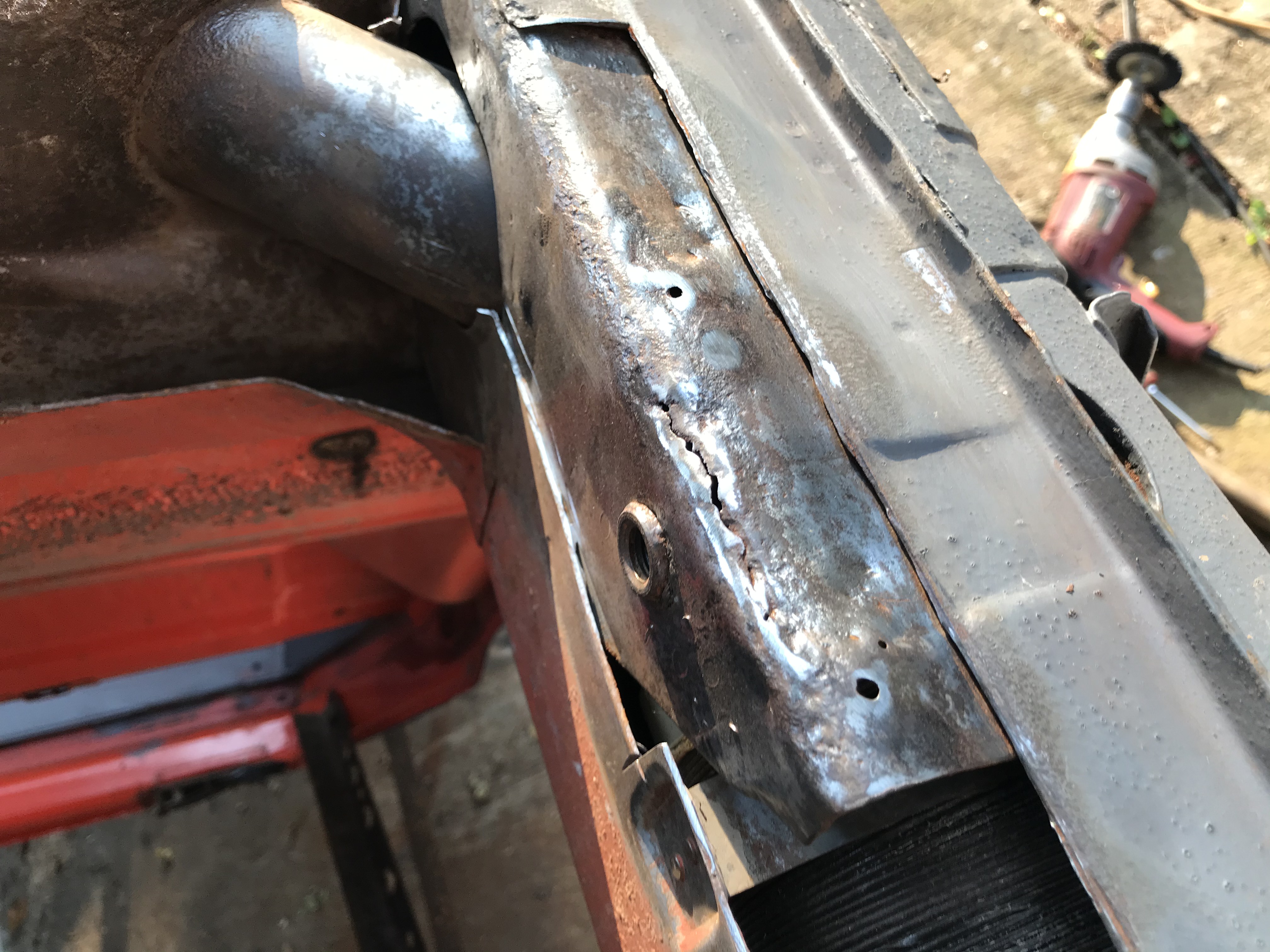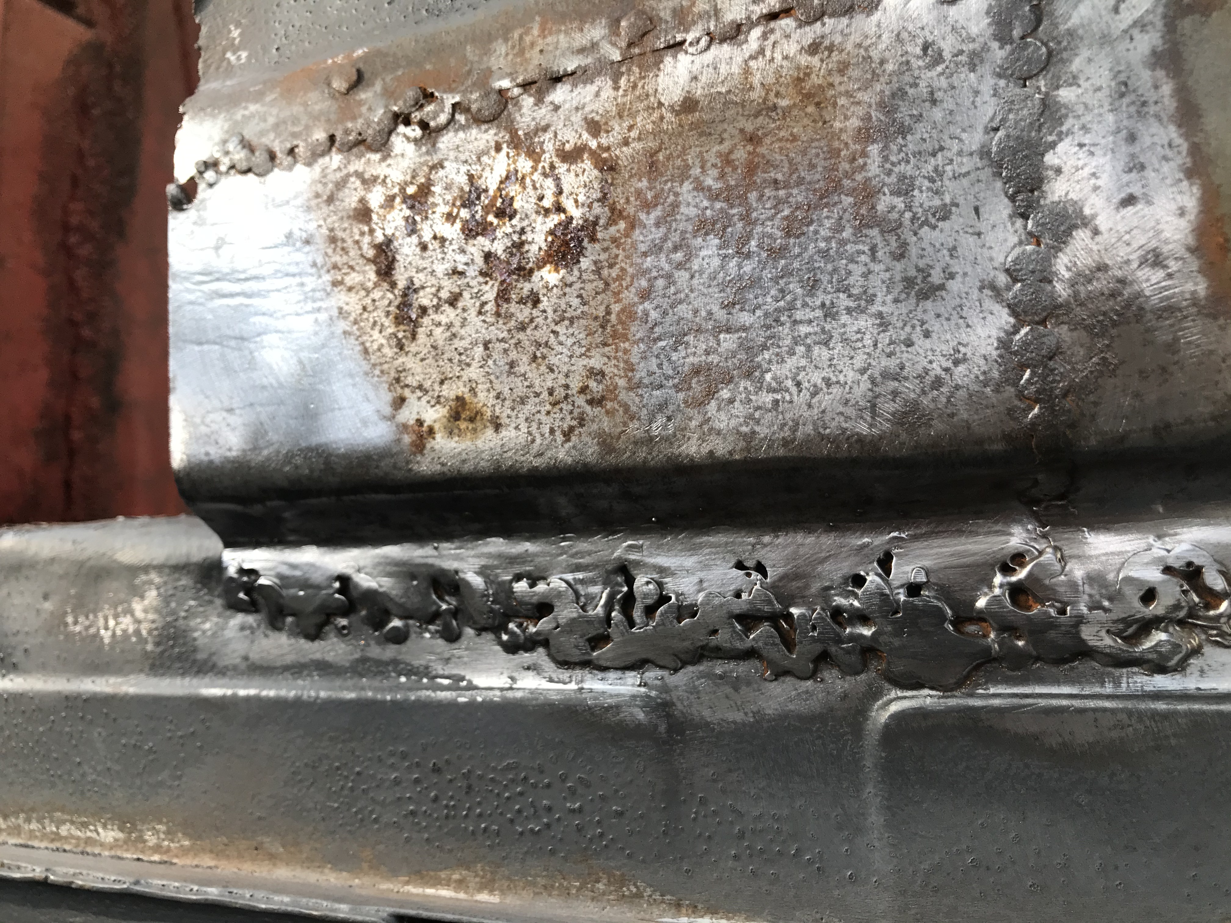 The first pic is what my miserable welds were looking like while trying to weld a patch to the floor while laying on my back and the car a ft or so off the ground (IMG:style_emoticons/default/barf.gif) . Couldn’t really even manage to get anything clean enough for consistency. Had hot slag dripping on me and trying to dress the welds with a grinder between me and the car felt really dangerous. The second pic is the very same area that I managed to clean up today and make look a little less embarrassing. So much easier with the rotisserie! |
