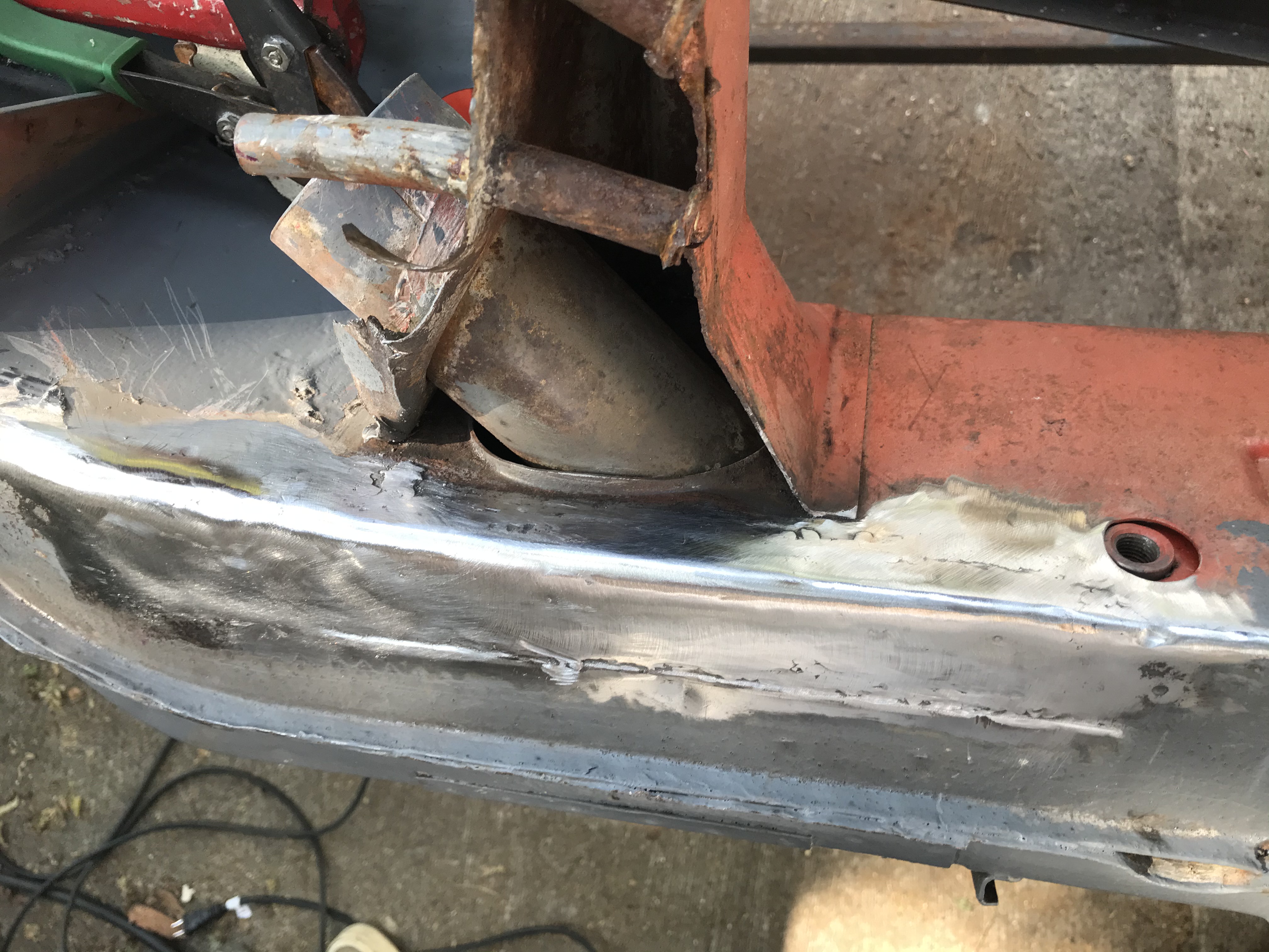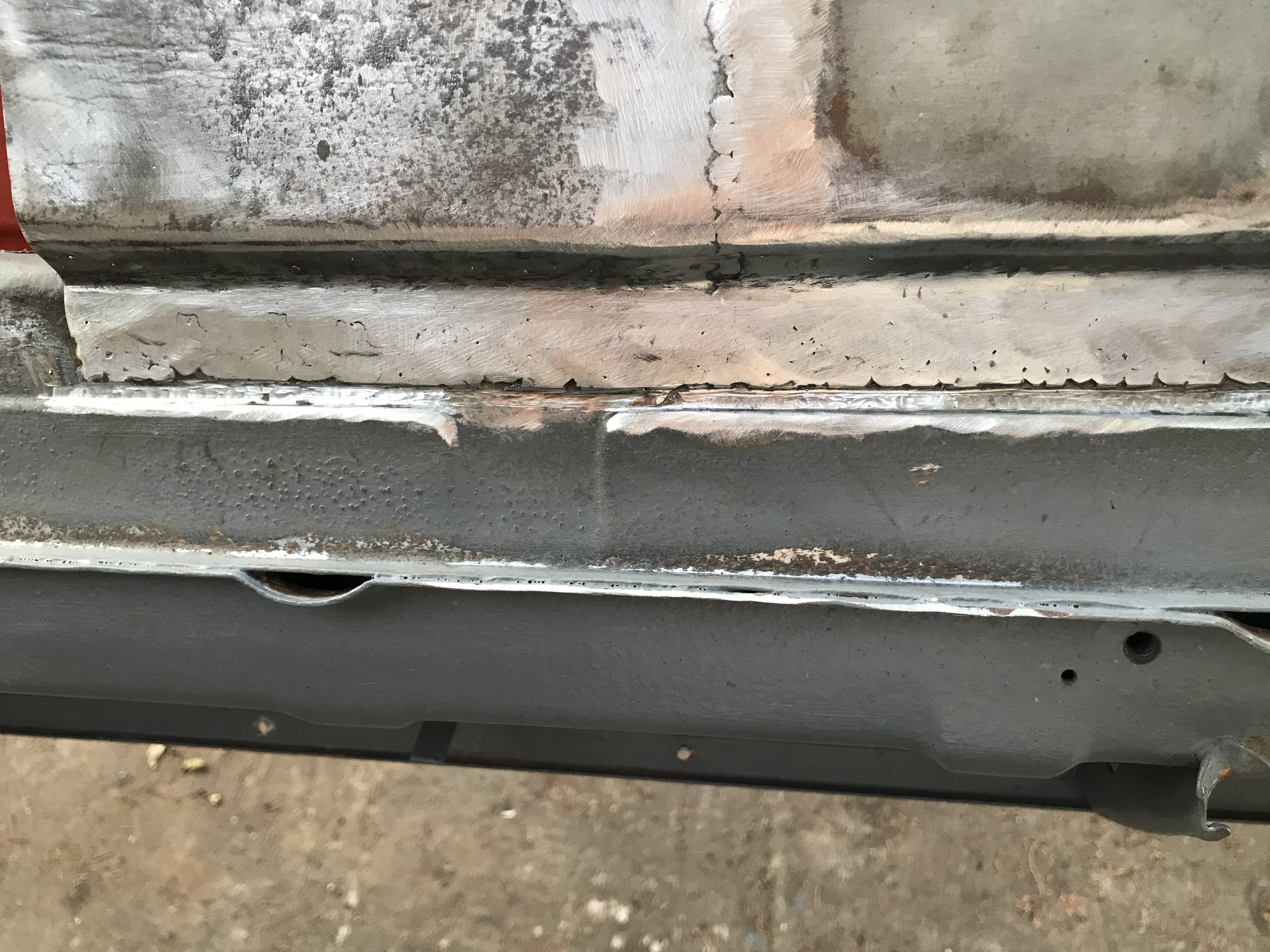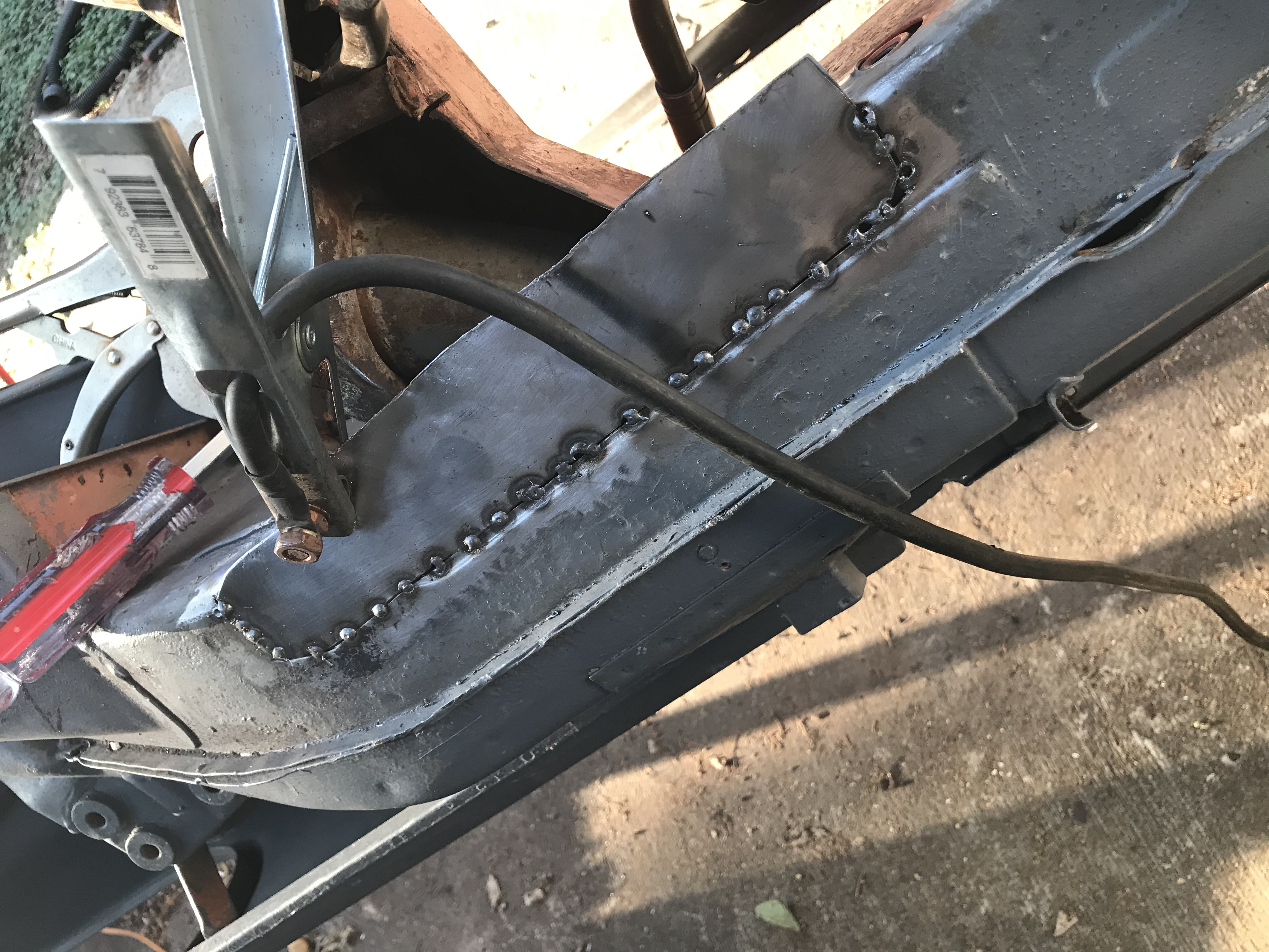 The first pic is what my miserable welds were looking like while trying to weld a patch to the floor while laying on my back and the car a ft or so off the ground (IMG:style_emoticons/default/barf.gif) . Couldn’t really even manage to get anything clean enough for consistency. Had hot slag dripping on me and trying to dress the welds with a grinder between me and the car felt really dangerous. The second pic is the very same area that I managed to clean up today and make look a little less embarrassing. So much easier with the rotisserie! |