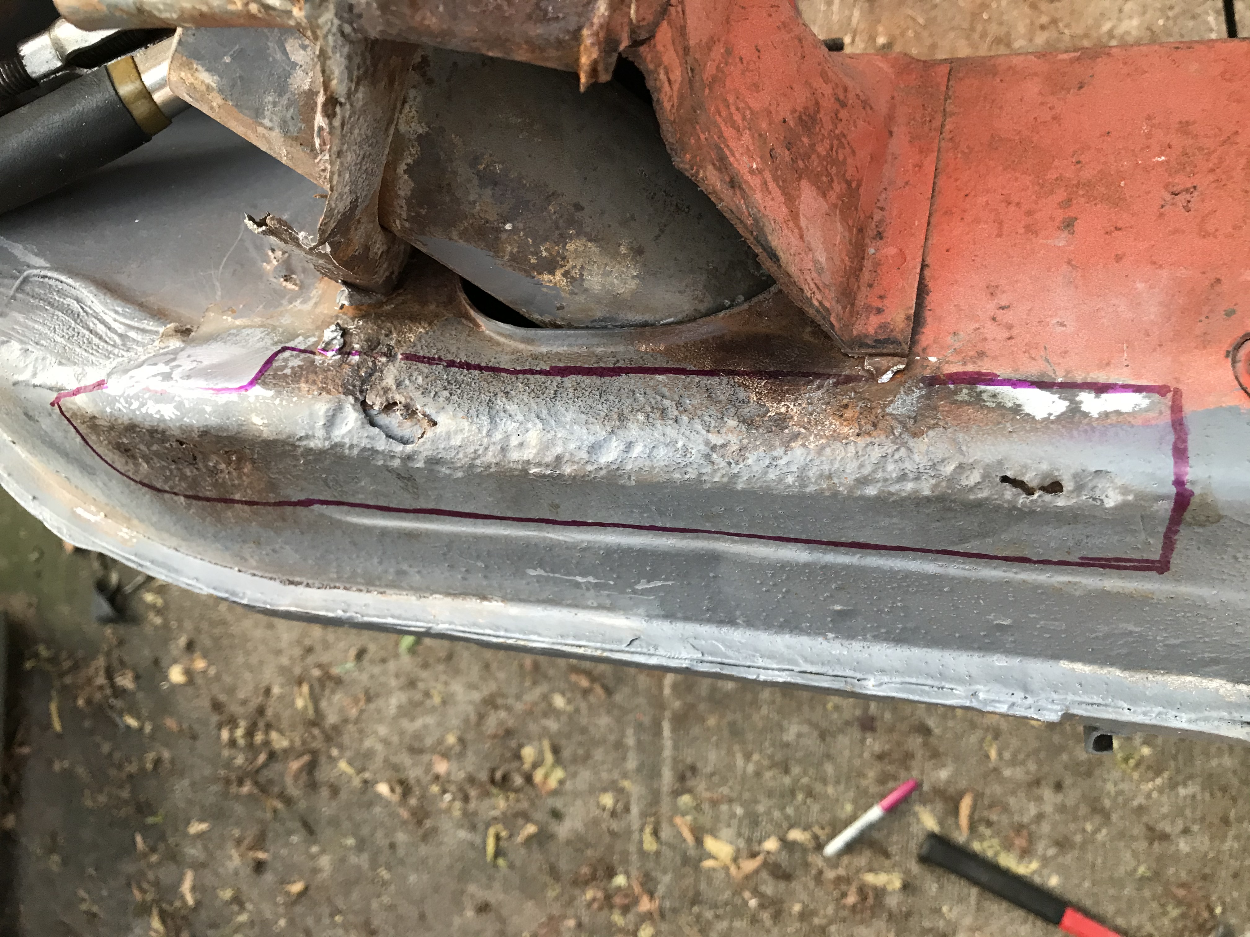 Here you can see marks for the cuts I made at the bottom of the outside firewall..I will be fabricating the lower section of the firewall - buying a whole panel seemed wasteful since most of it is in good shape. Hopefully these repairs will last a long time, the car will be a driver, if not a daily driver.