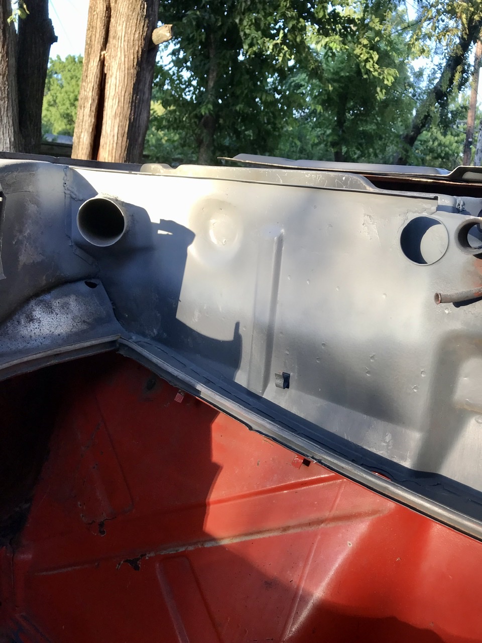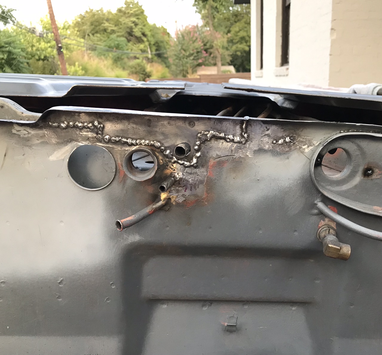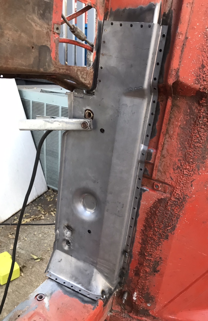 Drivers side inner wall with holes ready to be welded.. this is actually and over-lay or a second skin for most of this wall as only the bottom of the original was bad. I figured why not use the entire piece, since some people buy ‘reinforcement’ panels and over lay anyway.