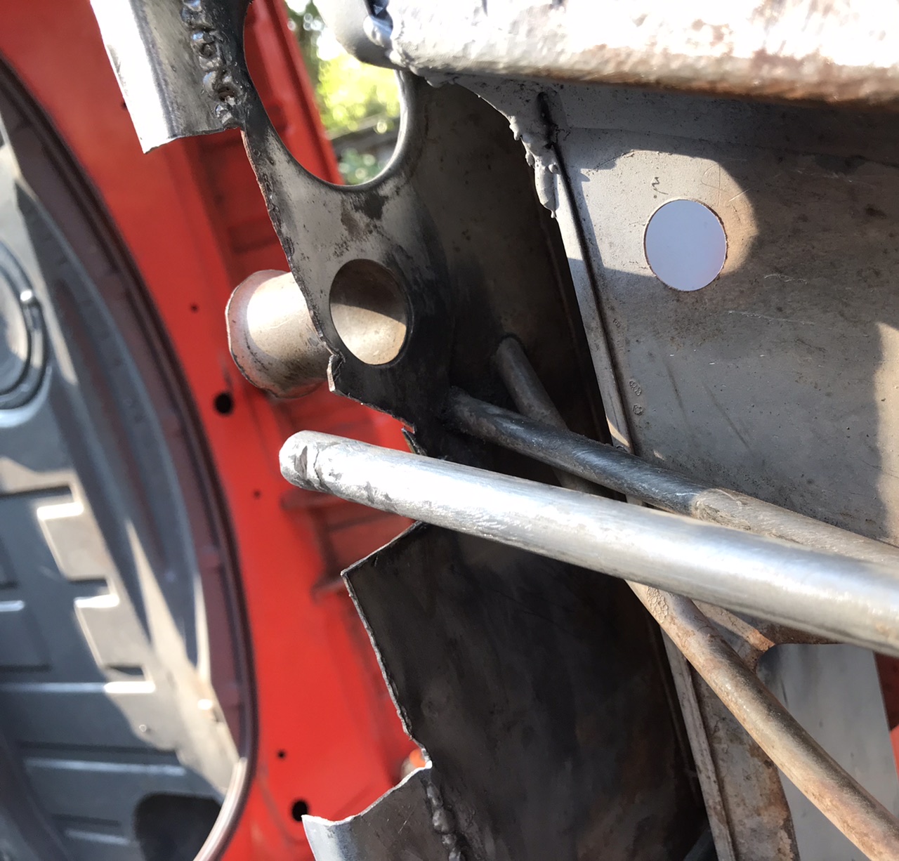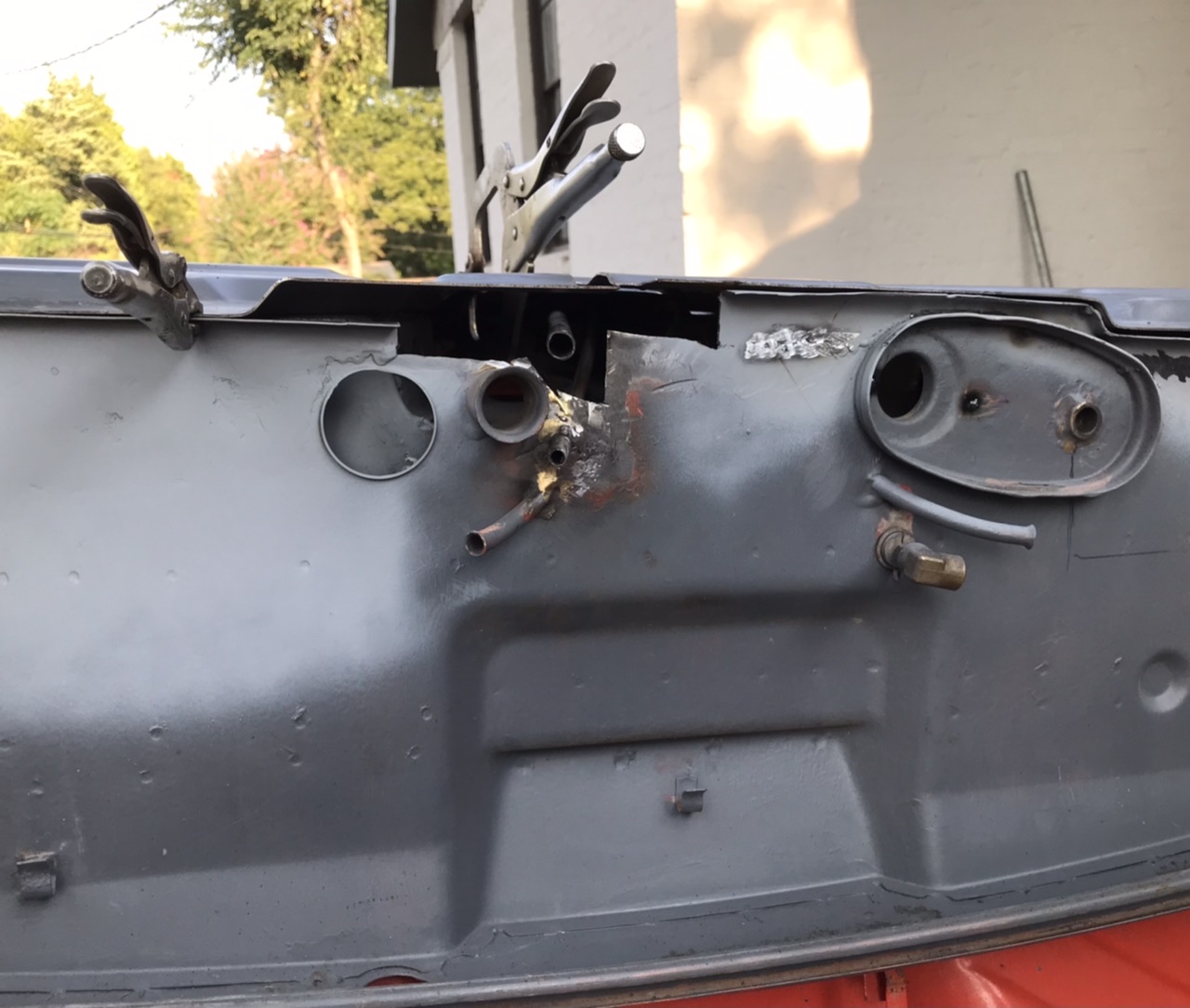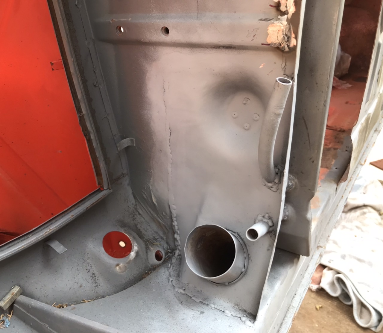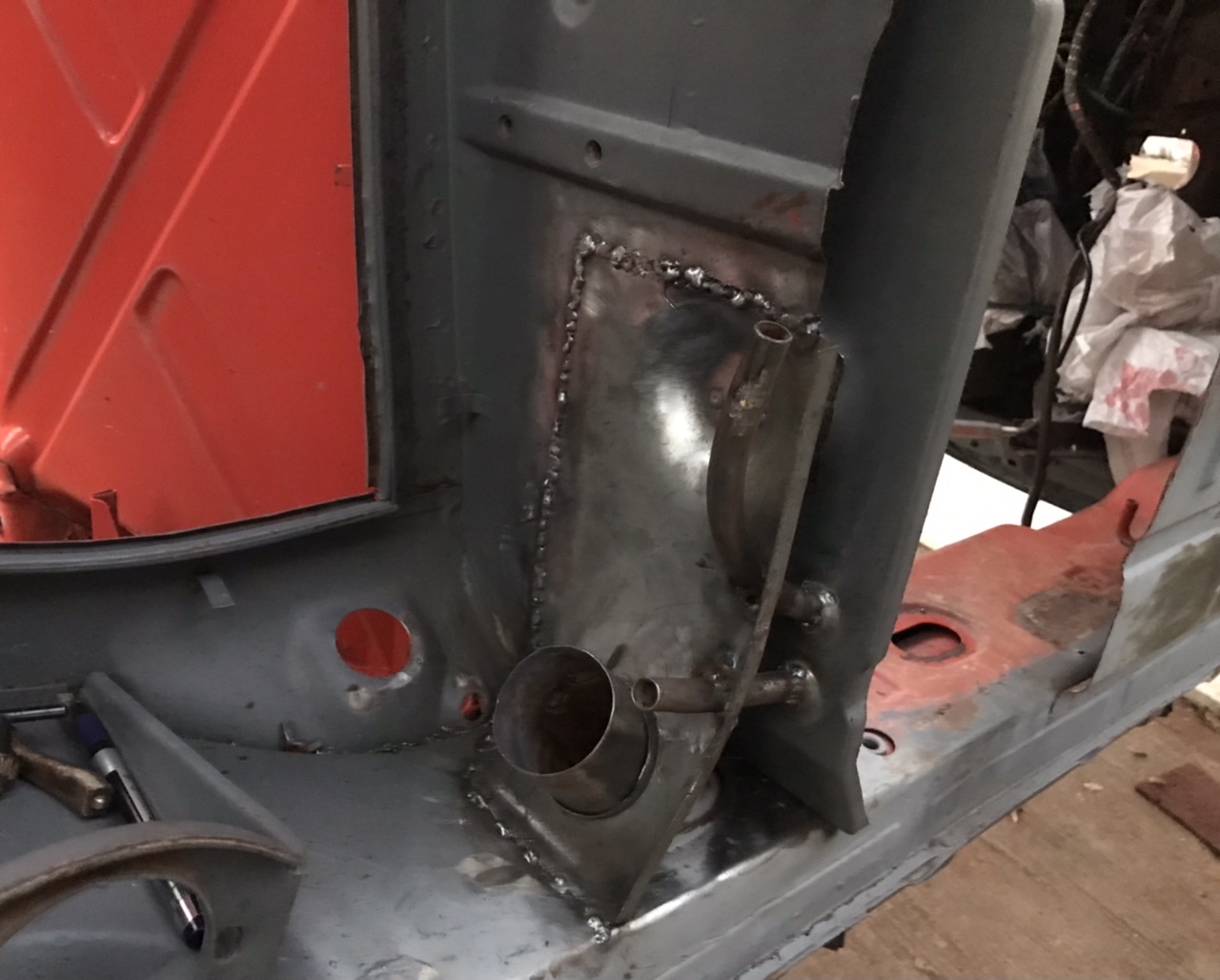 Fabricated a panel and tacked it in.. in this pic the clutch tube is loose in its hole so it can be adjusted outward later.