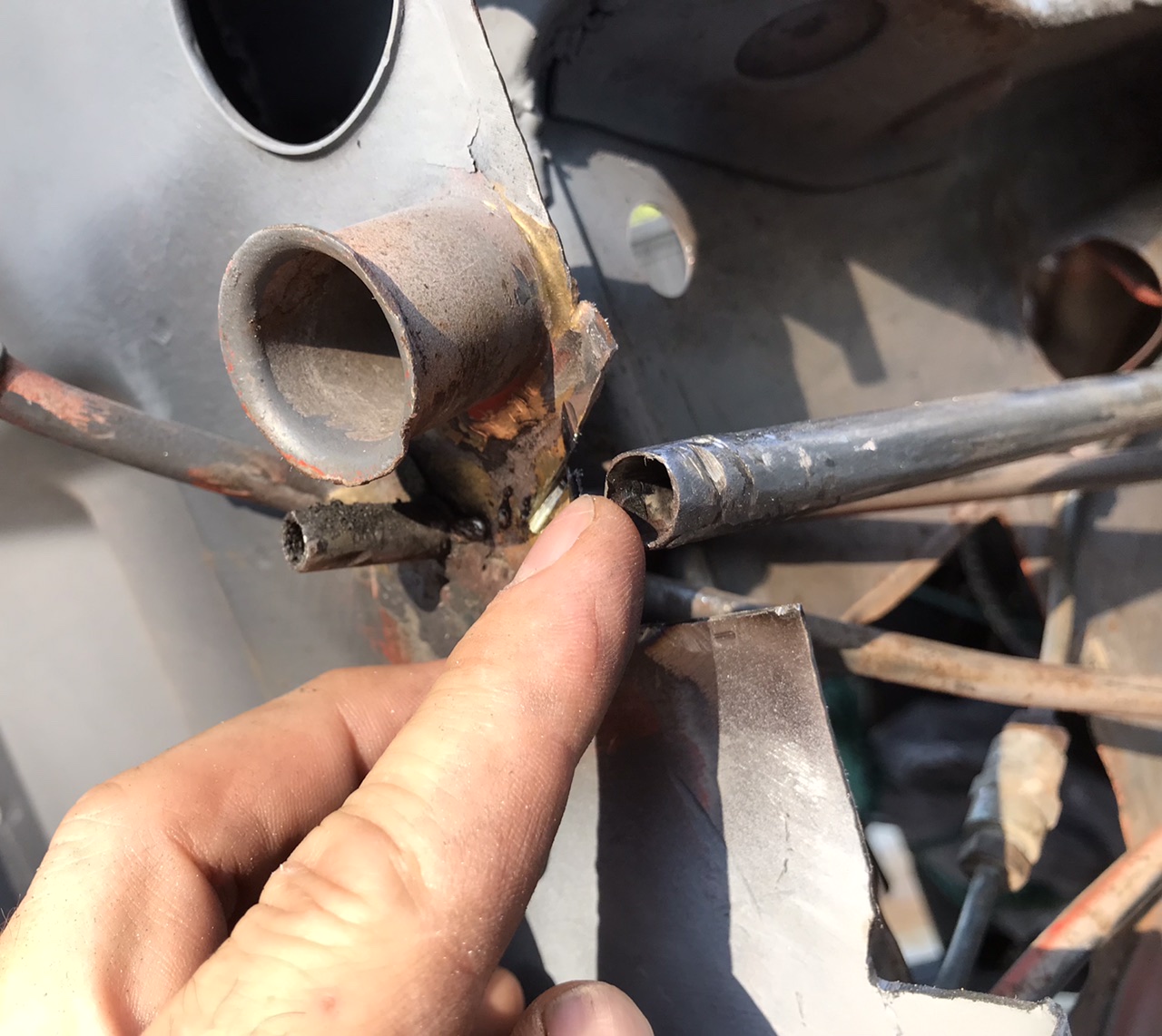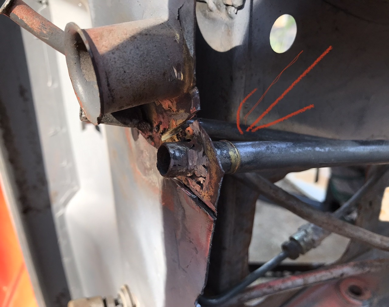 Ok so I’ve realized that when I retacked the clutch tube in place, that it was not in the right place.. it’s too far inward and not sticking out into the engine compartment enough. There is a bracket midways thru the tunnel that has broken loose and I will need to repair. I can see a brass ring around the clutch tube where it should meet the firewall (see the arrow in the pic). I will repair the inner tunnel bracket later. So ive cut the FW around the clutch tube, cleaned up the tube and will be correcting the tubes placement. Glad to do this cause those welds around the tube were kinda crappy looking.