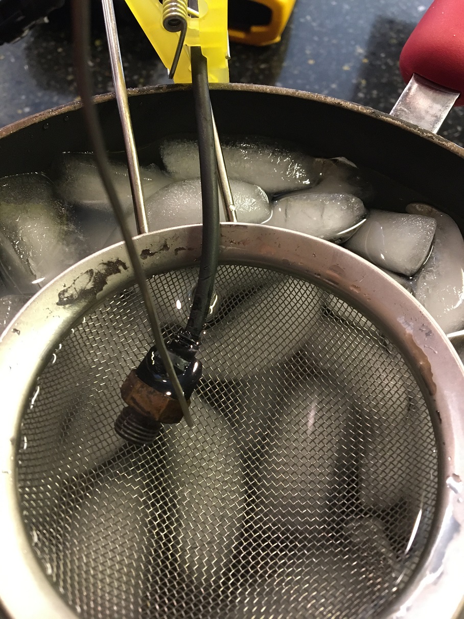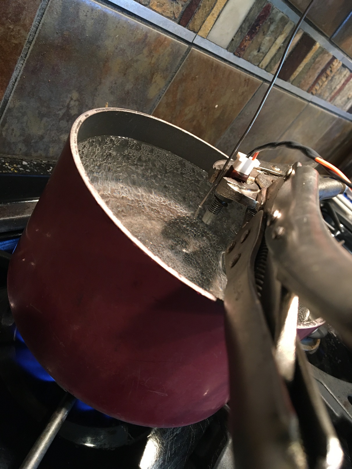 Easy way to do this: Room temperature resistance Boiling water resistance Cold water resistance. Using a K type thermocouple and a reader, I positionned the TC tip next to the sensor in the water (same depth). Interesting to see how the water isn't reaching the 100C mark at that level in the pot, even after a few minutes. Same process for the cold water. Same process was repeated with the BMW motorcycle CHT. Well, you get the idea... (IMG:style_emoticons/default/rolleyes.gif) |