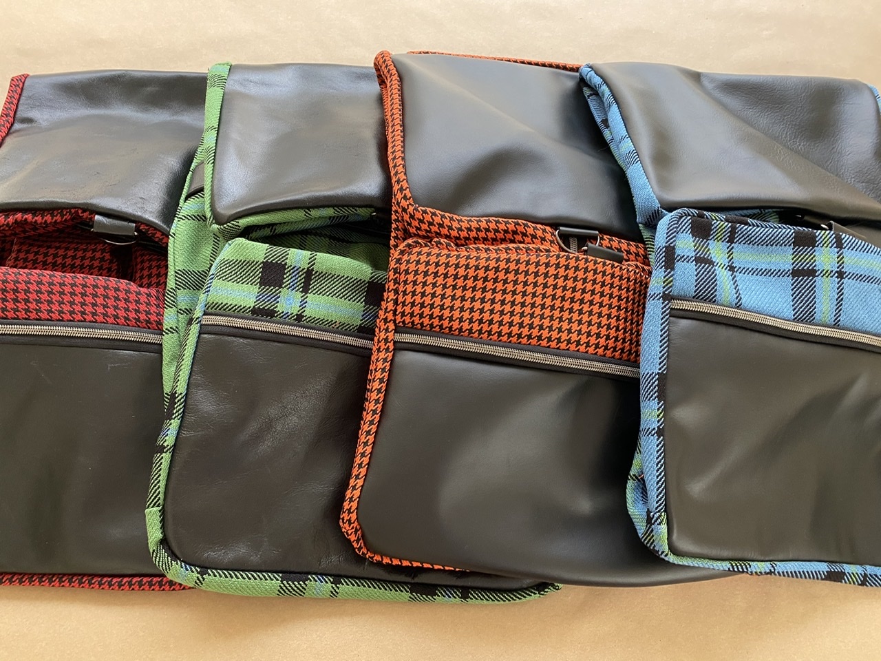 Here is an update on the tartan/houndstooth products. Bags have been shipping this week. And we have a bunch in production as well. Like I mentioned before we made a few improvements to the final design before we began first production, upgrading the zipper to a high-quality zipper closure, and we improved the handles for strength and durability. I am really pleased with the final product. We have been honored by all of the orders we have received. We are also in the process of adding new cloths for 356s, as well as later model Porsche’s, and we have a few new products I think you will like. I will post more pictures of finished bags in different colors so you can see how different colors with black and saddle trim look.