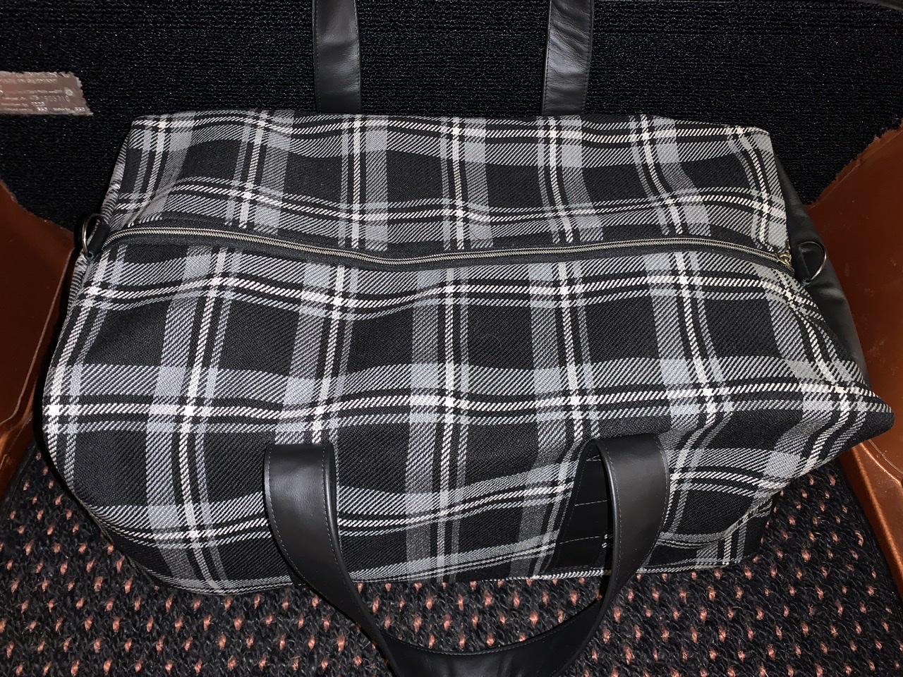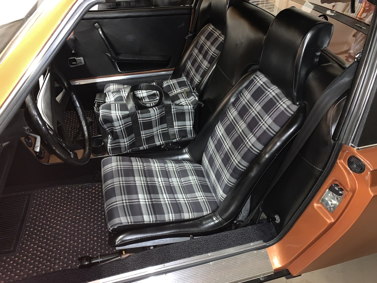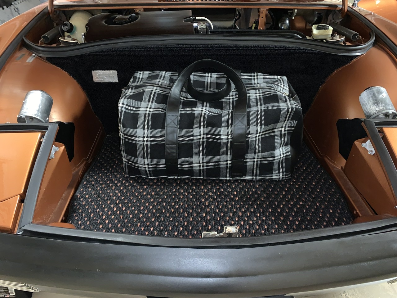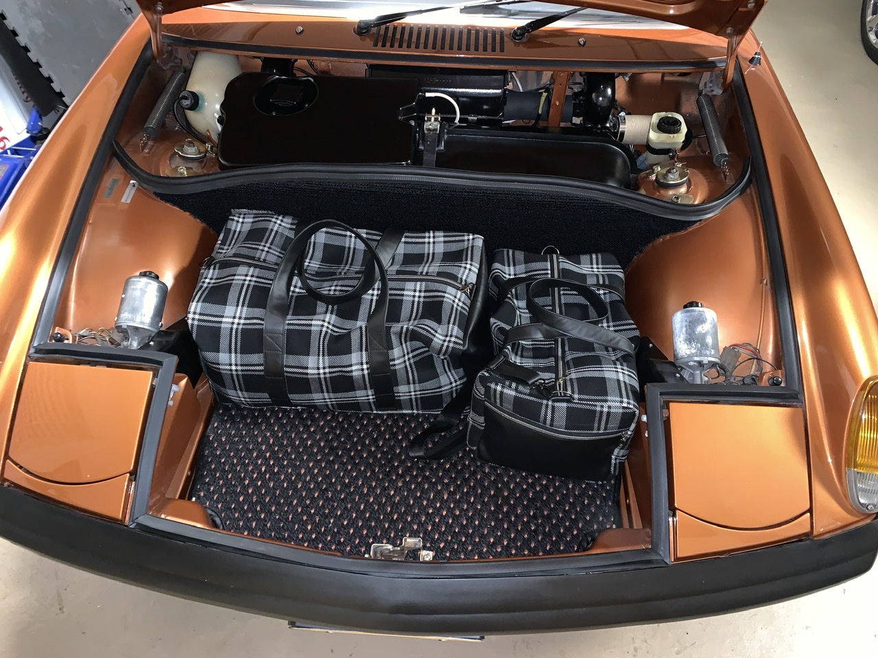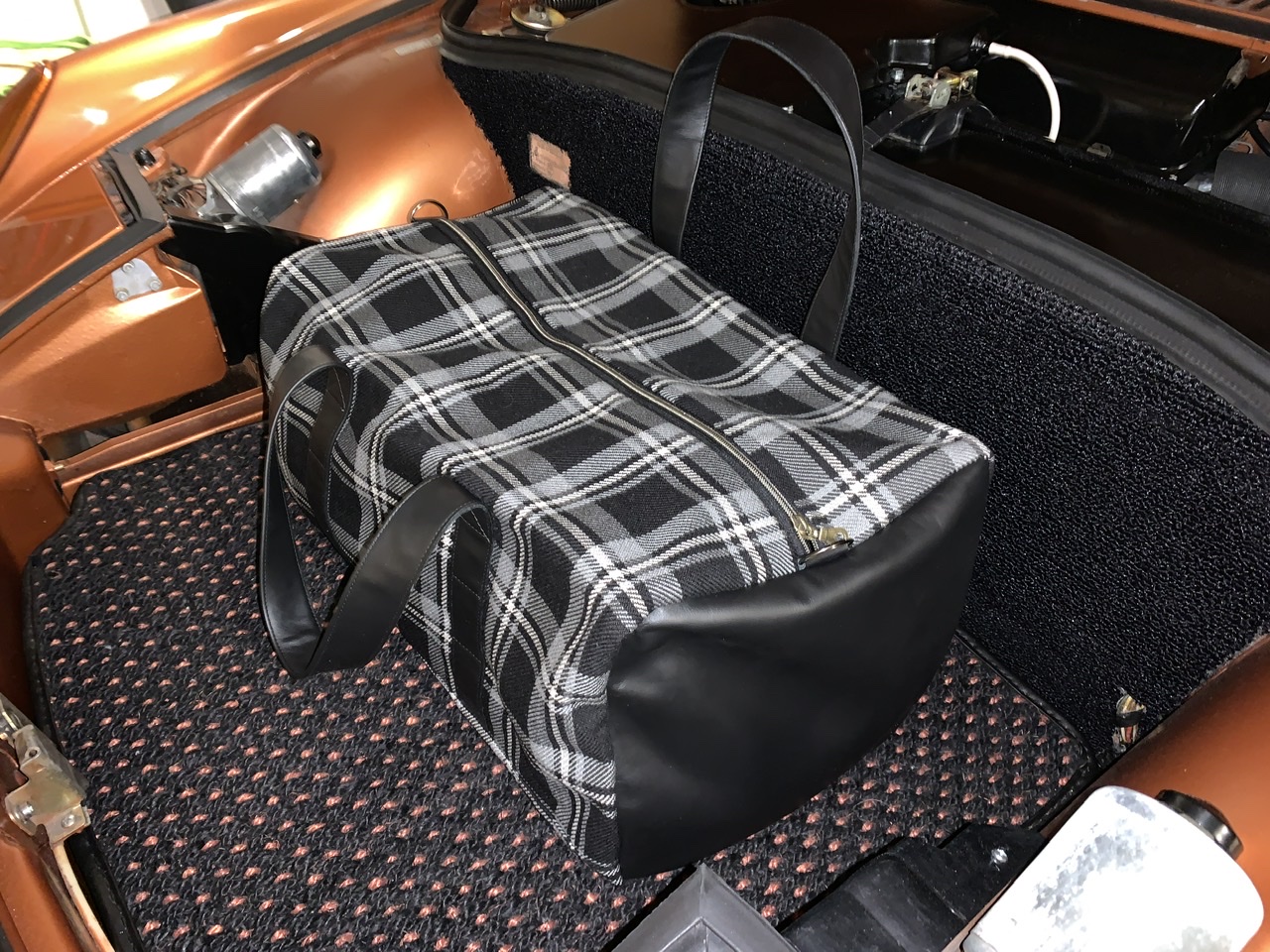 I need to take better pictures, but here is a quick pic I took last night, nothing in the bags. These bags match my seat material and I found out from steve are exactly the same, from the same manufacturer so perfect match! I thought about getting the orange to match the car but I went with matching seats instead. After seeing the orange tartan in person at Steve’s yesterday it looks more like the copper my car is than orange so I really do need to get a set of the orange tartan, maybe to be used as the tool bag and and my car cover bag!! These can be my travel suit case bags. I will be placing another order and maybe I can have them for Kiawah show in a month??