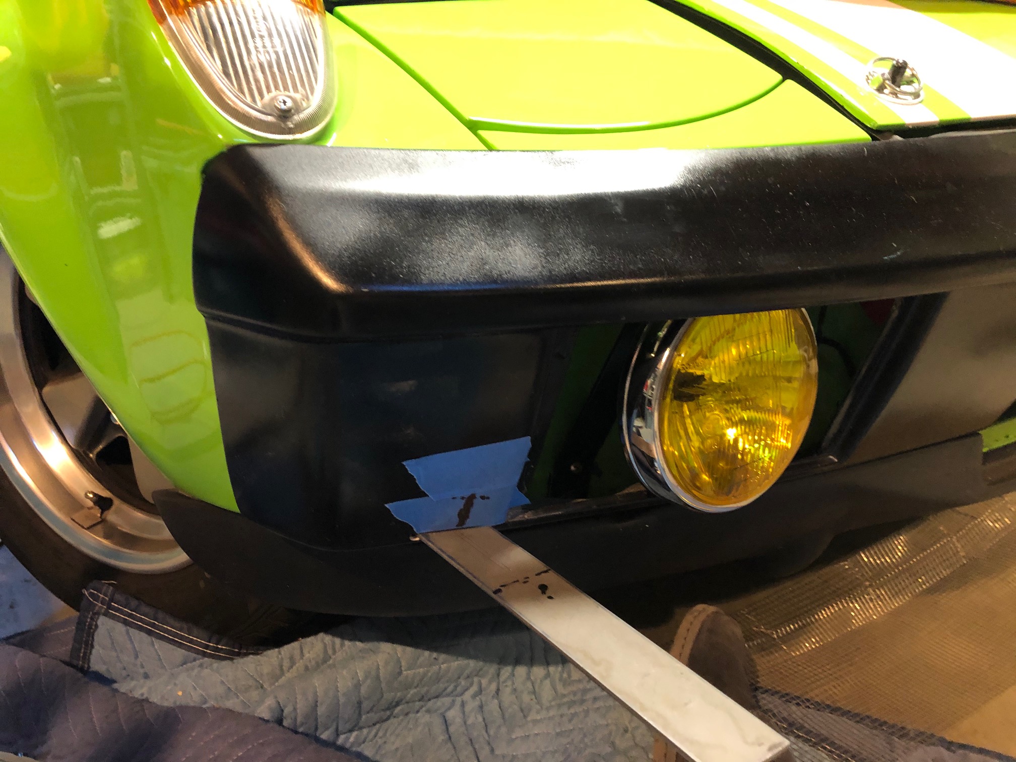 I’ve always been fascinated by the front lower spotlight mounting that appears on some of the GT cars, notably the winning 1970 Marathon de la Route cars. A few years ago I got a chance to obtain some original Cibie Iode 45 lamps from a seller in France. These had yellow lenses – one fog, one driving - which matched the yellow Cibie Tango’s I have mounted in my GT tribute car already, in the “standard” fog light position within the fiberglass front bumper. Not clear to me was how the factory fabricated brackets were designed. The inverted “T” cut into the fiberglass bumper meant that the brackets must somehow get fed through that to get mounted; also somehow they mount to the body and may / may not hold the bumper on? Searching in-period as well as recent pictures did not yield many clues; a few detailed the outside construction and bracing, but I had no clear idea of what was behind the bumper cut out. Until: luckily last summer I did get a chance to see the original “Number 2” Marathon car up close at Luft 6, so took the opportunity to crawl around under the front of the car to try and see what was going on. That is, until folks who were waiting to take unobstructed pictures of the legendary vehicle were bored of waiting for the strange geezer lying on his back peering into the oil cooler opening….! ![]() I took some detailed pics and thought that attempting to make up some brackets might be a good winter project. It is not clear to me (on olde number 2) whether the brackets were the originals or replicas – but I learned enough to want to try and replicate them. So the brackets themselves (as the pics show) look pretty basic on the face of it. But some thought obviously went into the design, as they need to meet multiple criteria: - be shaped such that they can be fed through the inverted “T” cut in the bumper - secure the bumper to the body - have welded in bracing to prevent the lights vibrating & flexing - clear the front valance mounting tabs (which are just below the bumper mount holes) The upper piece in this shot shows the side profile I went for, bent up in aluminum as a test for clearance; one of the main bracket is being fab'ed using mild steel. The cut in the bumper (fiberglass) was done with fingers crossed but turned out to be correct, the shot below shows a test fit & alignment check before cutting the vertical: I welded some M6 nuts to the strips to use as mounts, aligned with the holes in the bumper and the body. Cutting the bracing pieces needed some experimentation and mocking up, as looking carefully at the existing photos of the OUTSIDE, it was hard to judge overall dimensions – extension, drop, etc. – so in the end it was basically a visual judgement call. and.... |