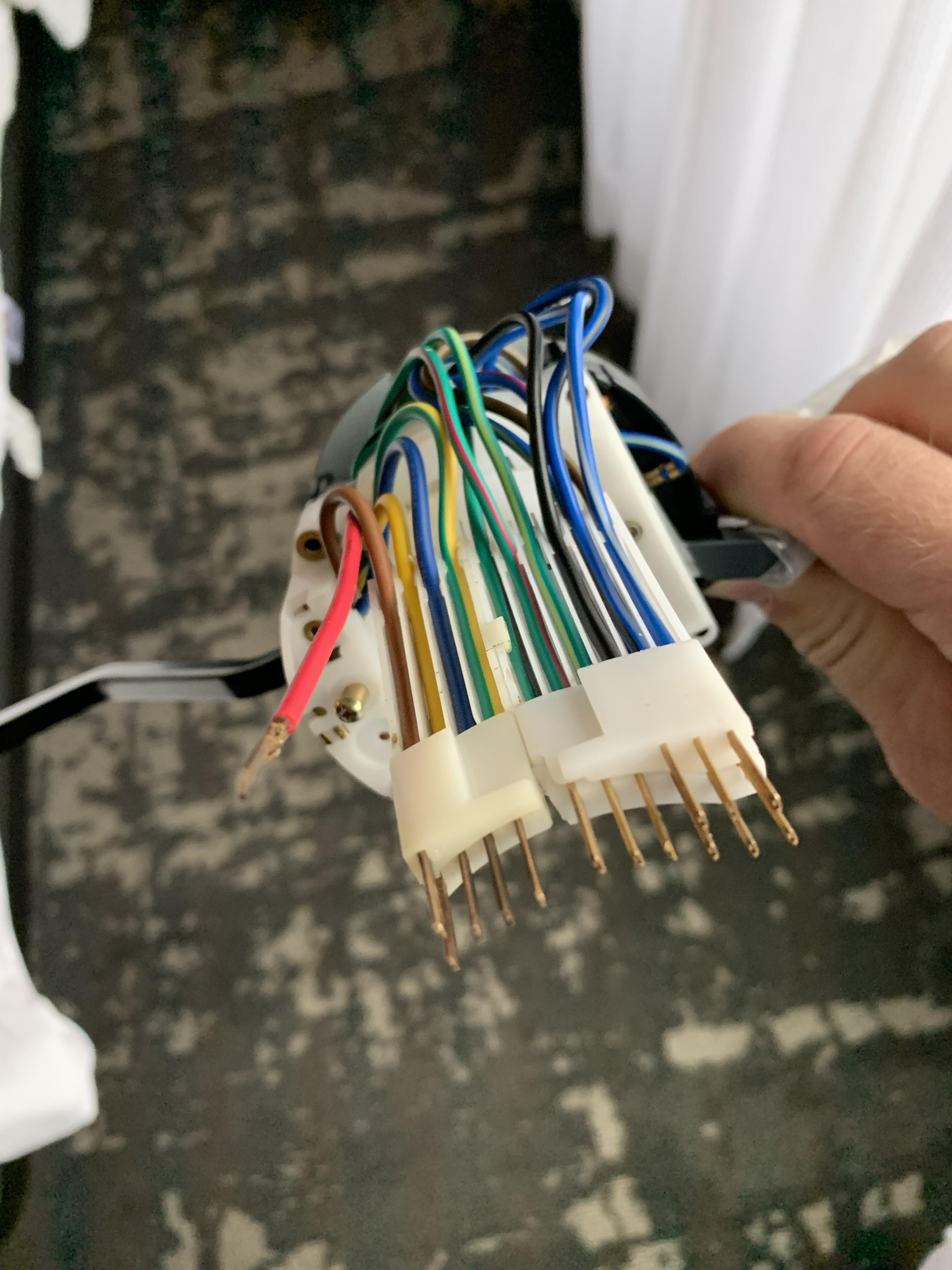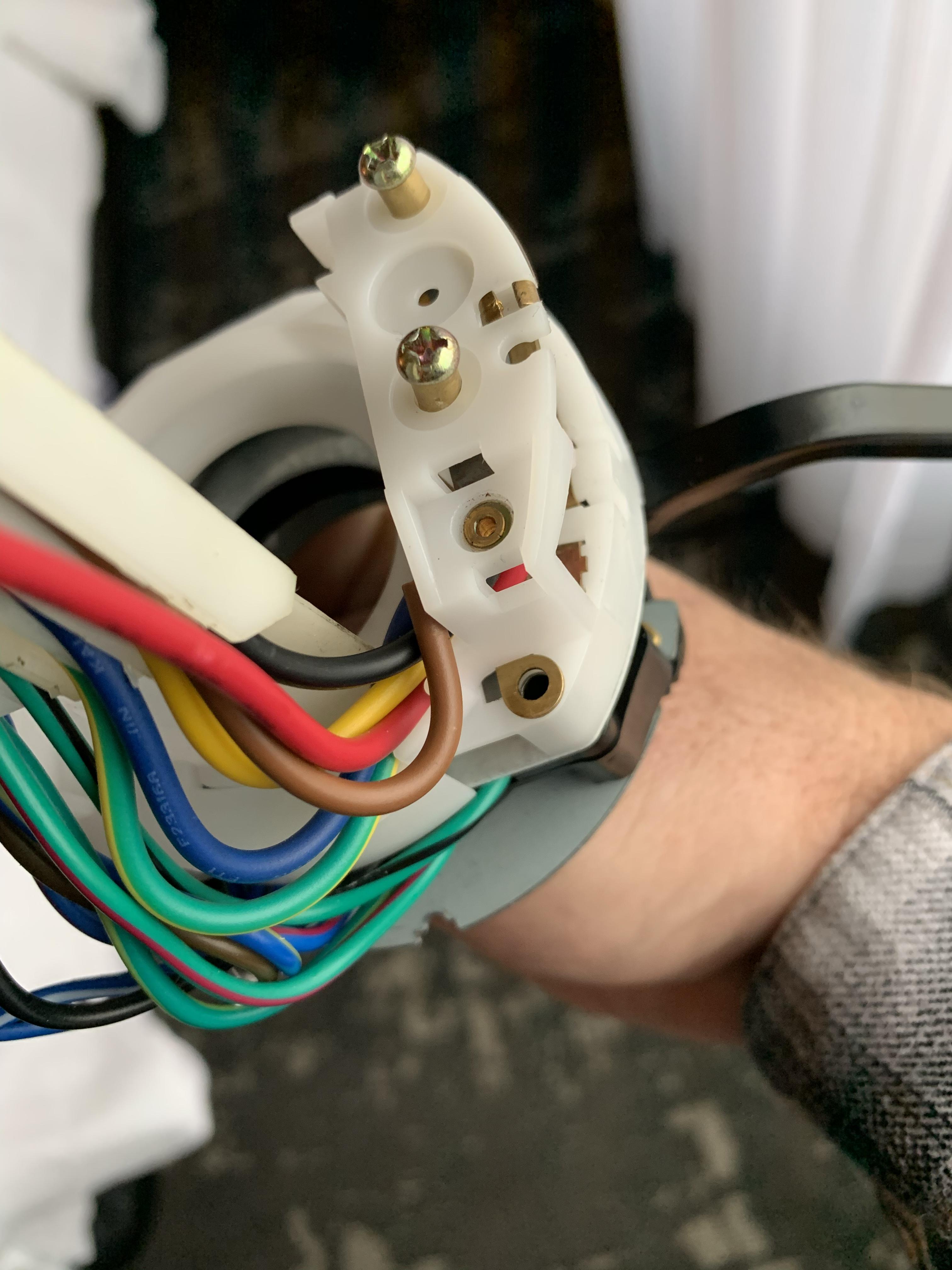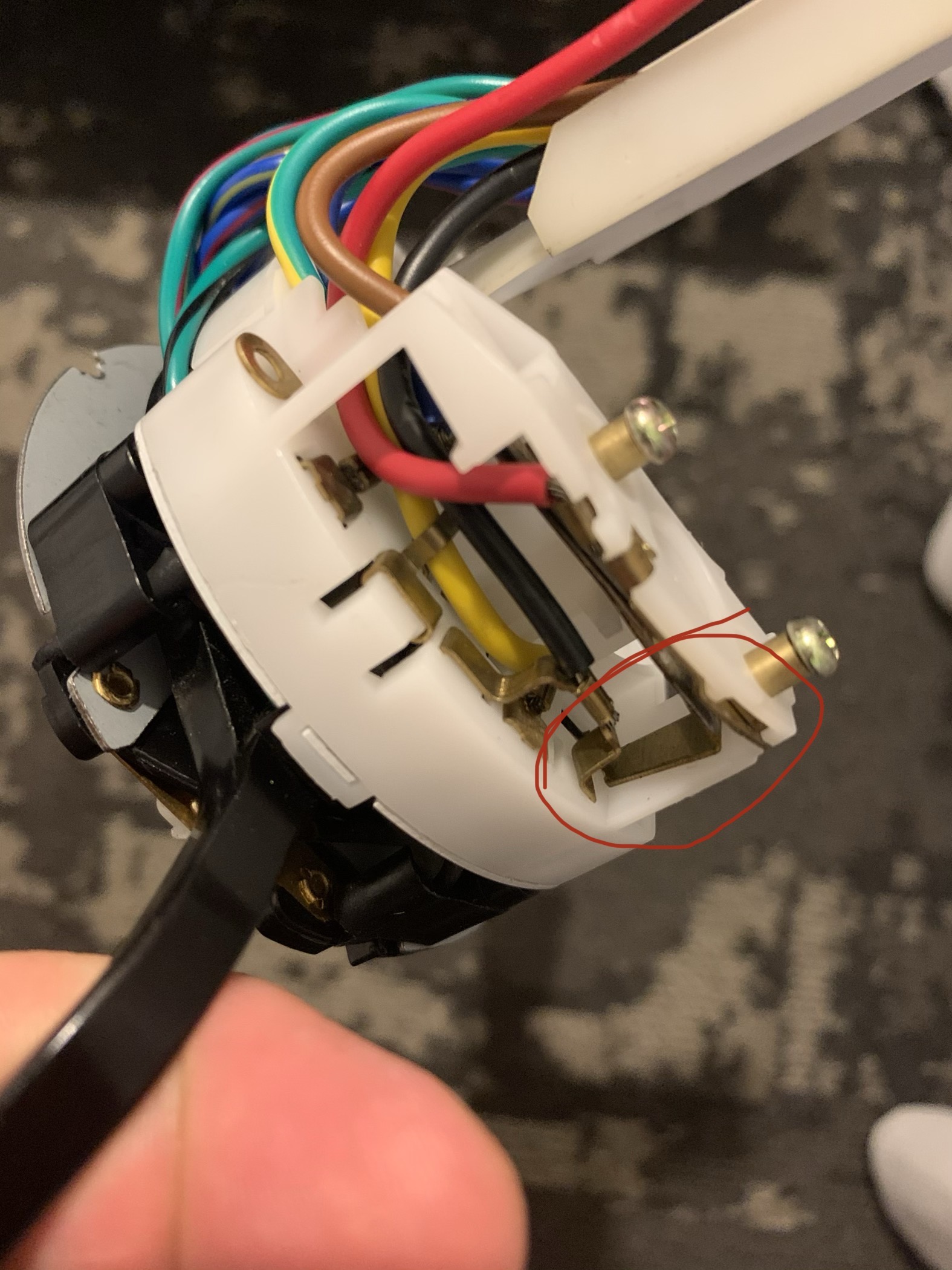 found it. Here's a pic (stolen from another thread - thanks @Spoke ) where you can see the tab that falls out. My new switch does not have the slot cut for the tab to fit into, but instead has an integral metal piece on the inside of the plastic that accomplishes the same thing as I can see it completing a circuit/connection to the brown wire in the loom and brown is ground. |