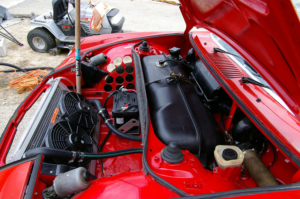 Don, good idea on the front radiator cap with the higher pressure. And you have an easy way to bleed the radiator when filling the system. How much flex resulted from cutting out the engine lid brace? I'm considering that for my yellow car to get more air cleaner options. I was looking at the K&Ns and also a low profile oval billet cleaner. I'll still avoid cutting it if I can. I lost 1/2" by using a carb. spacer. I needed the spacer because my carb was getting too hot in +105 deg temps and stuck in traffic.